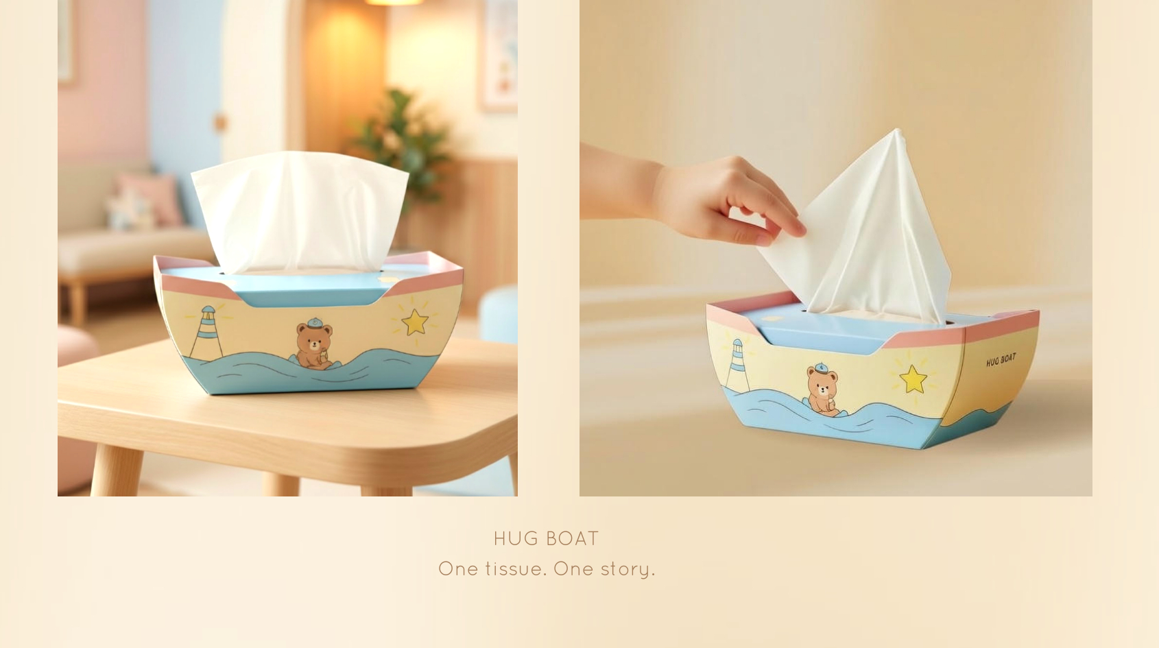 HUG BOAT is a tissue box designed as a comforting object for emotional spaces. It transforms a hidden, disposable item into a visible symbol of care. Inspired by children’s perception of safety, the boat shape suggests that every tear has a destination — a place to land.