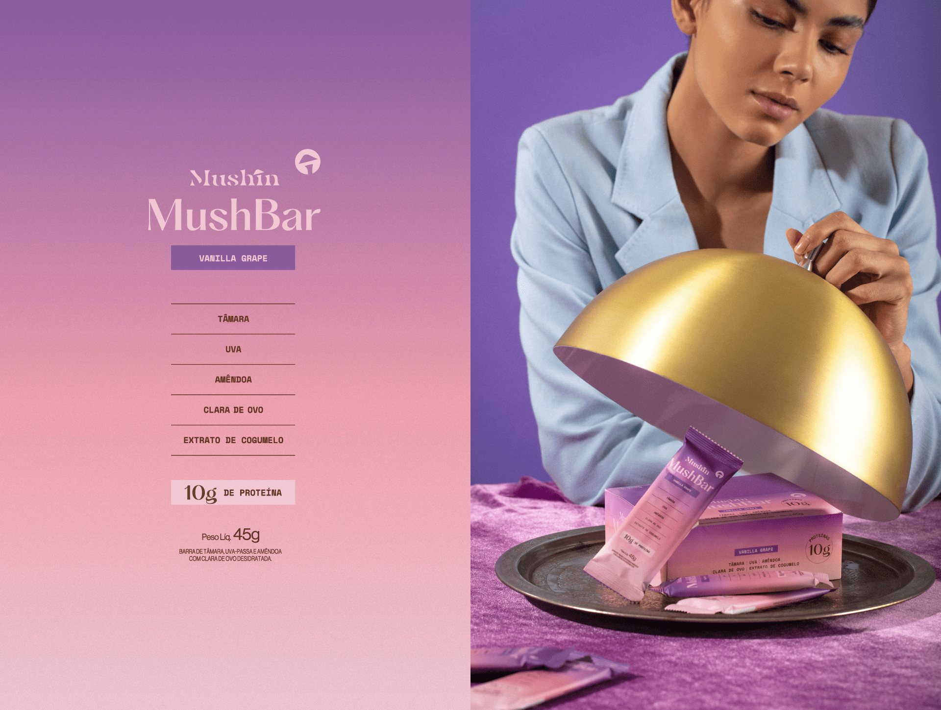 The packaging design follows the sophisticated and minimalist aesthetic of Mushin’s identity, where the ingredients take center stage. This information layout ensures clarity in communicating the benefits of MushBar and visual alignment with the other products in the brand’s portfolio.
