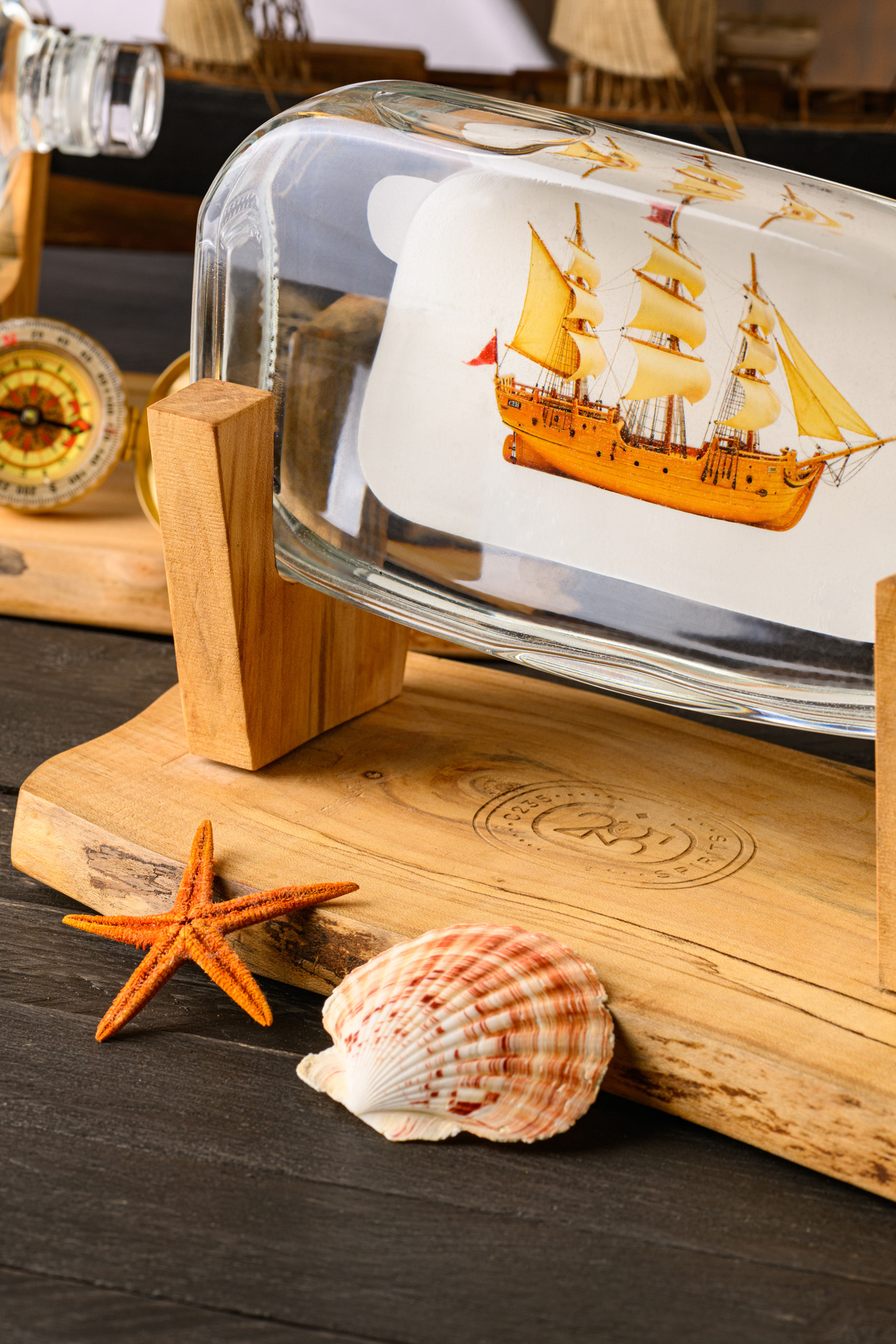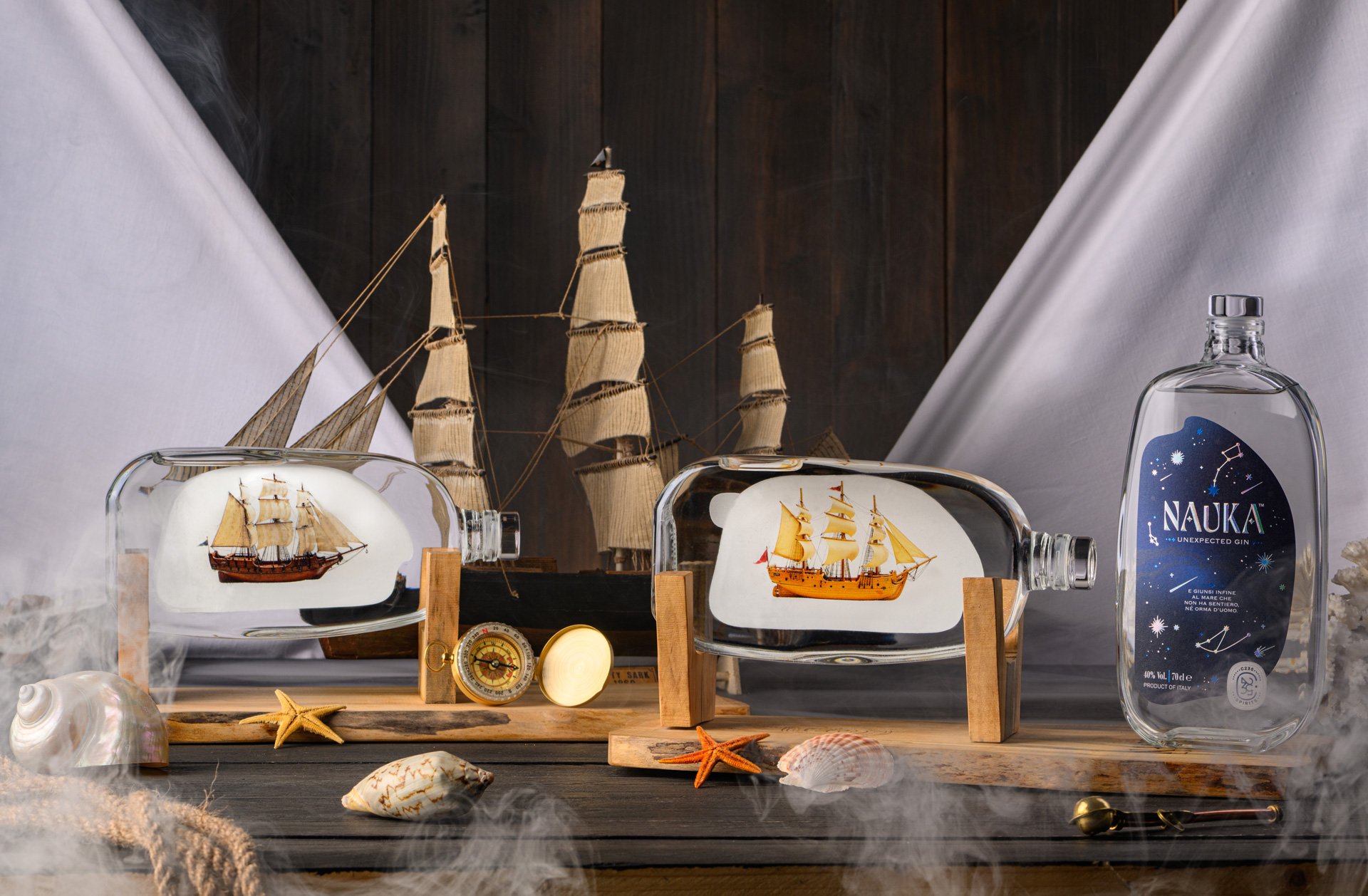 The bottle also hides a surprise: a ship-in-a-bottle illustration, printed in two variations on the back of the label and visible through the gin’s transparency, making the product a genuine collector’s piece.