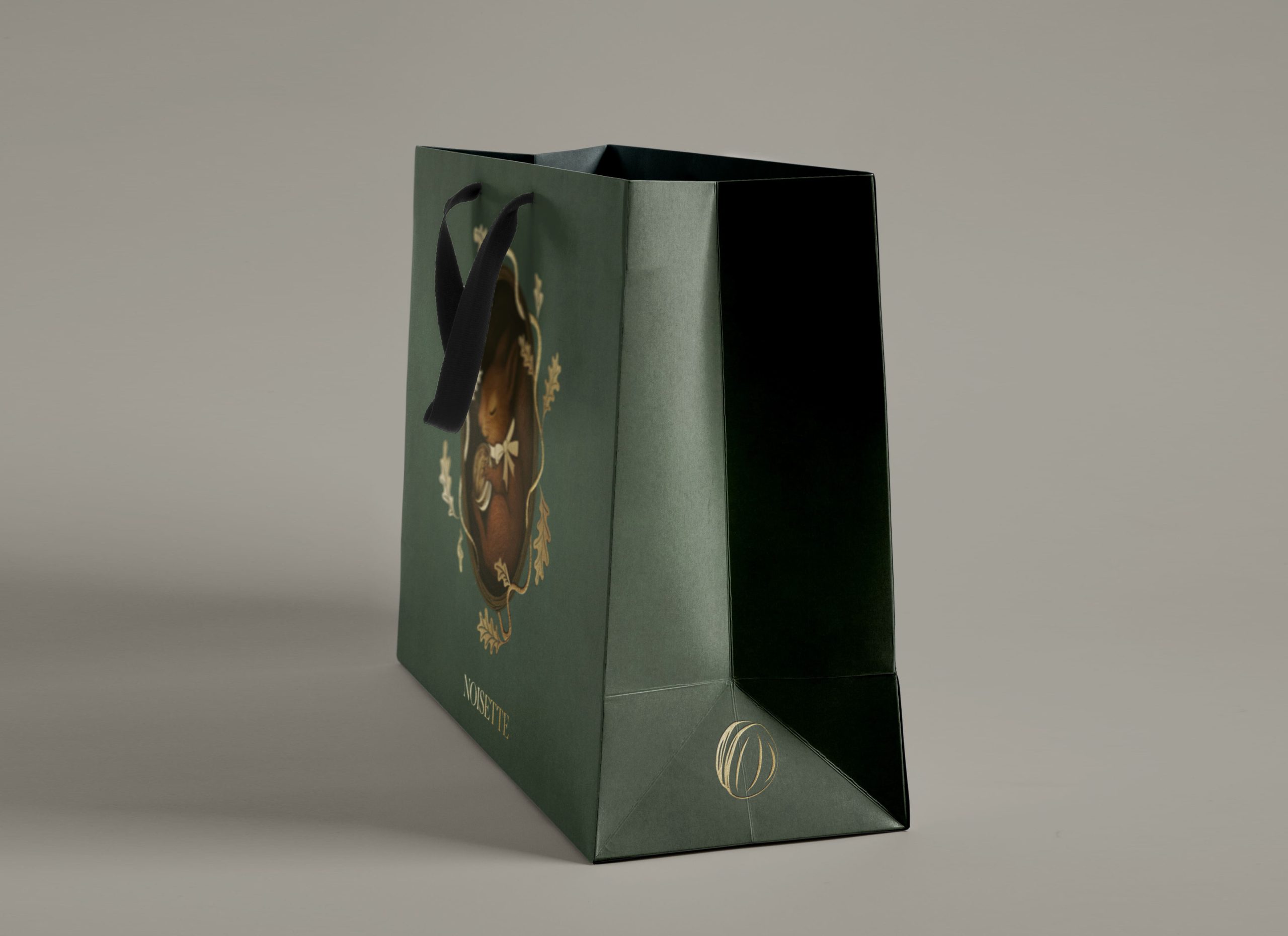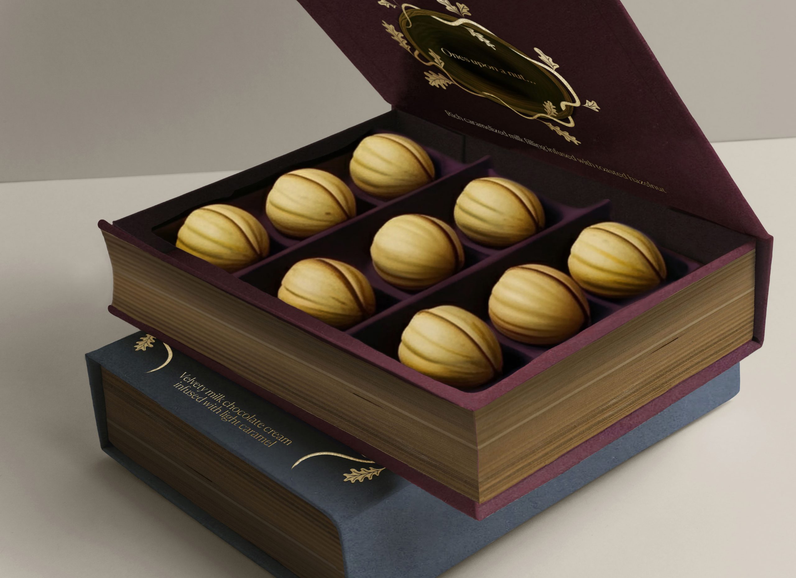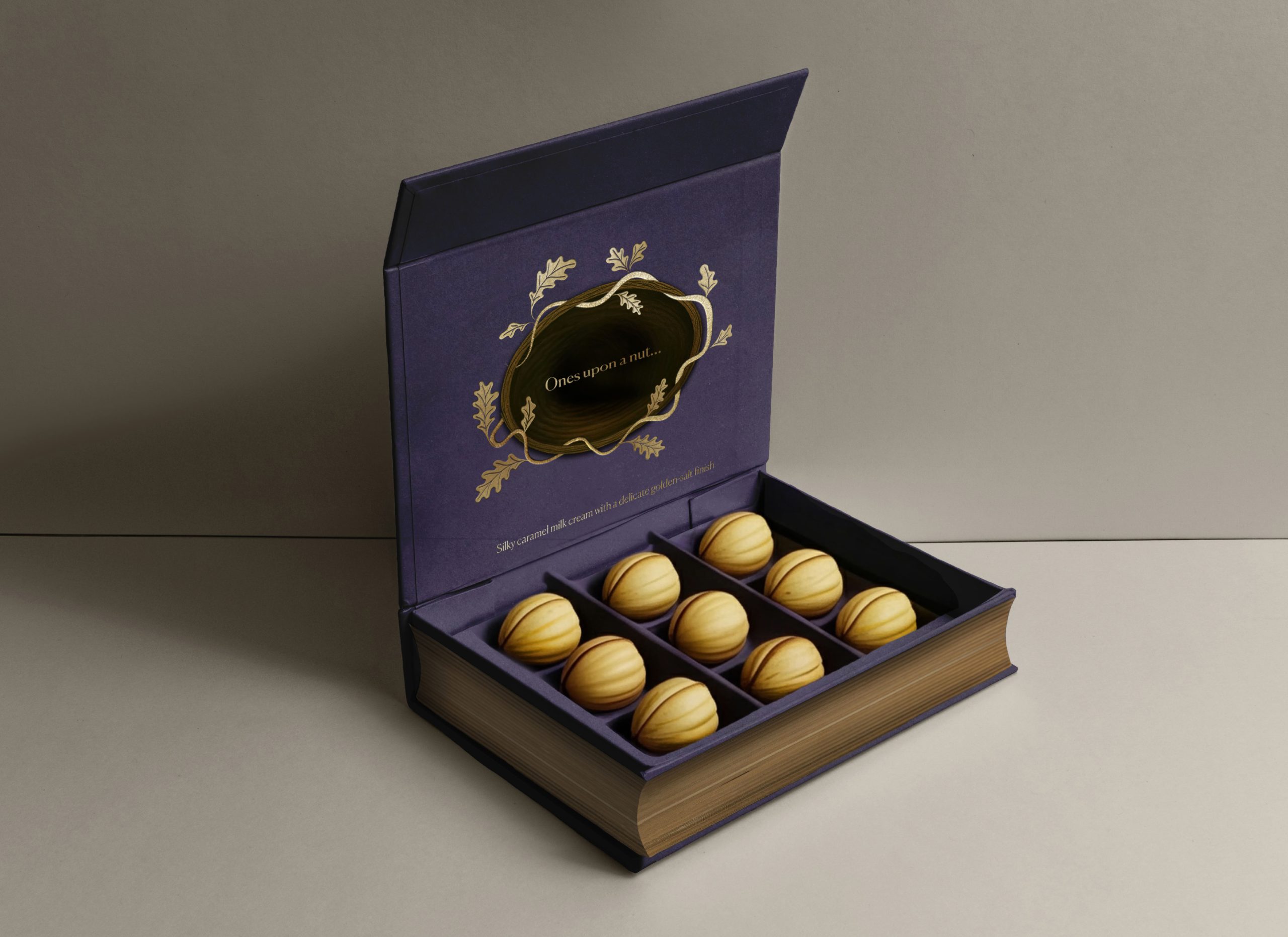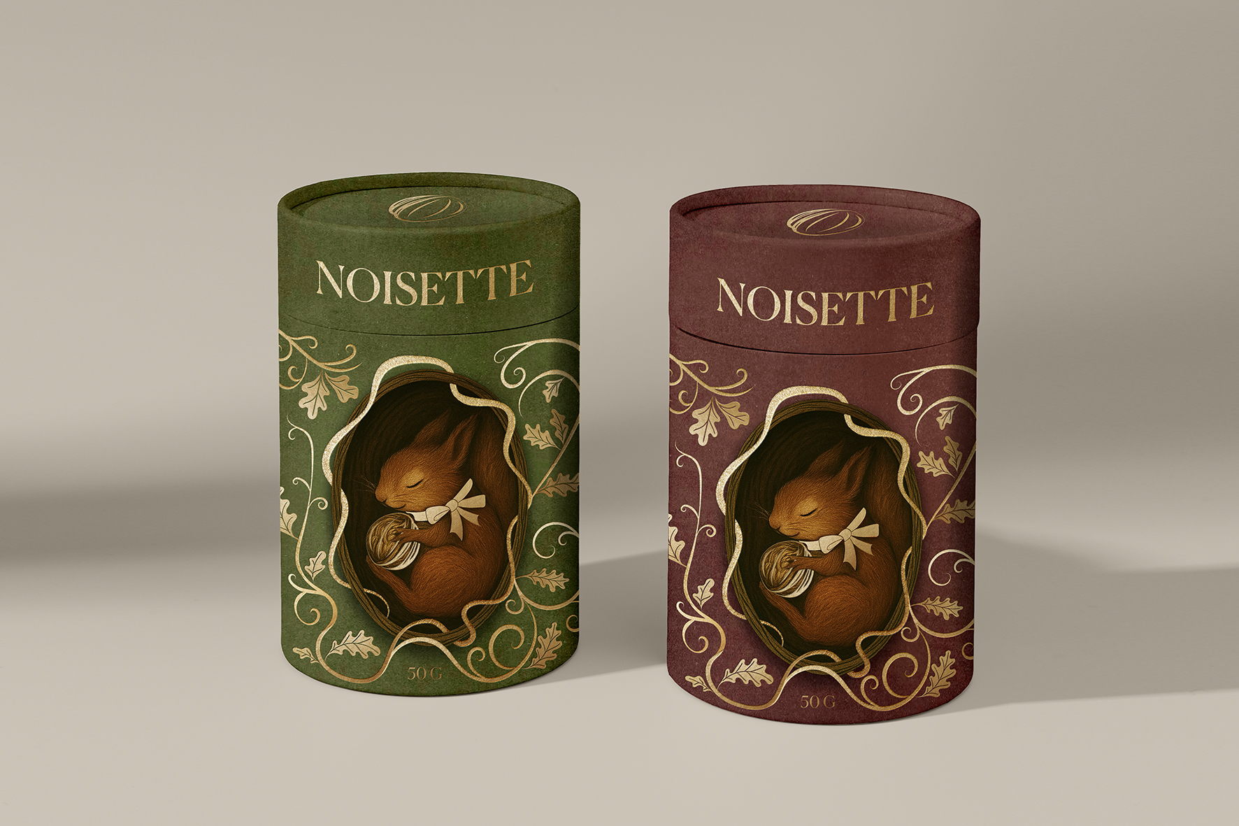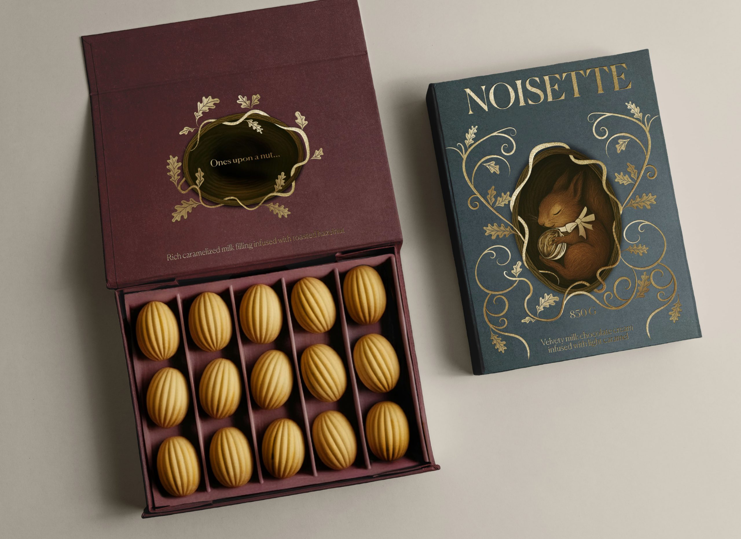 Noisette reimagines traditional Russian walnut-shaped cookies, blending golden shortbread shells, caramelized milk filling, and bold, unexpected flavors. Each taste becomes a color-coded box inspired by a fairytale world where a little squirrel guards her golden nut. Bark textures, oak leaves, and velvety packaging – sometimes shaped like a real book – extend the magic even further. Noisette turns a beloved tradition into a poetic, indulgent universe.