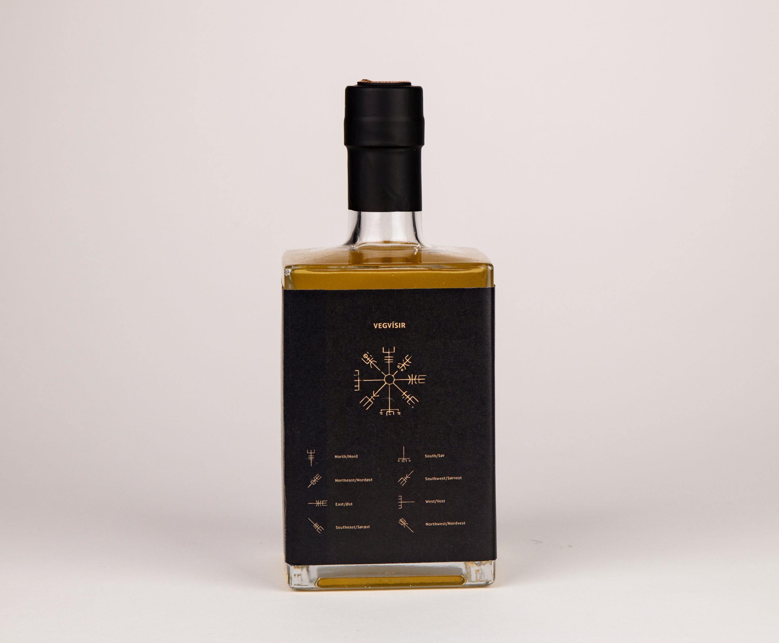 I centered the concept on the theme of a Viking journey, drawing from elements of navigation, exploration, and Norse symbolism. Early research included the sun, moon, constellations, and Polaris, the North Star—all essential tools for Viking navigation. I also incorporated the Vegvisir, a symbolic compass used as a guide for travelers. One entire panel of my bottle label is dedicated to the Vegvisir, providing meaning, narrative, and an interactive moment for the user.