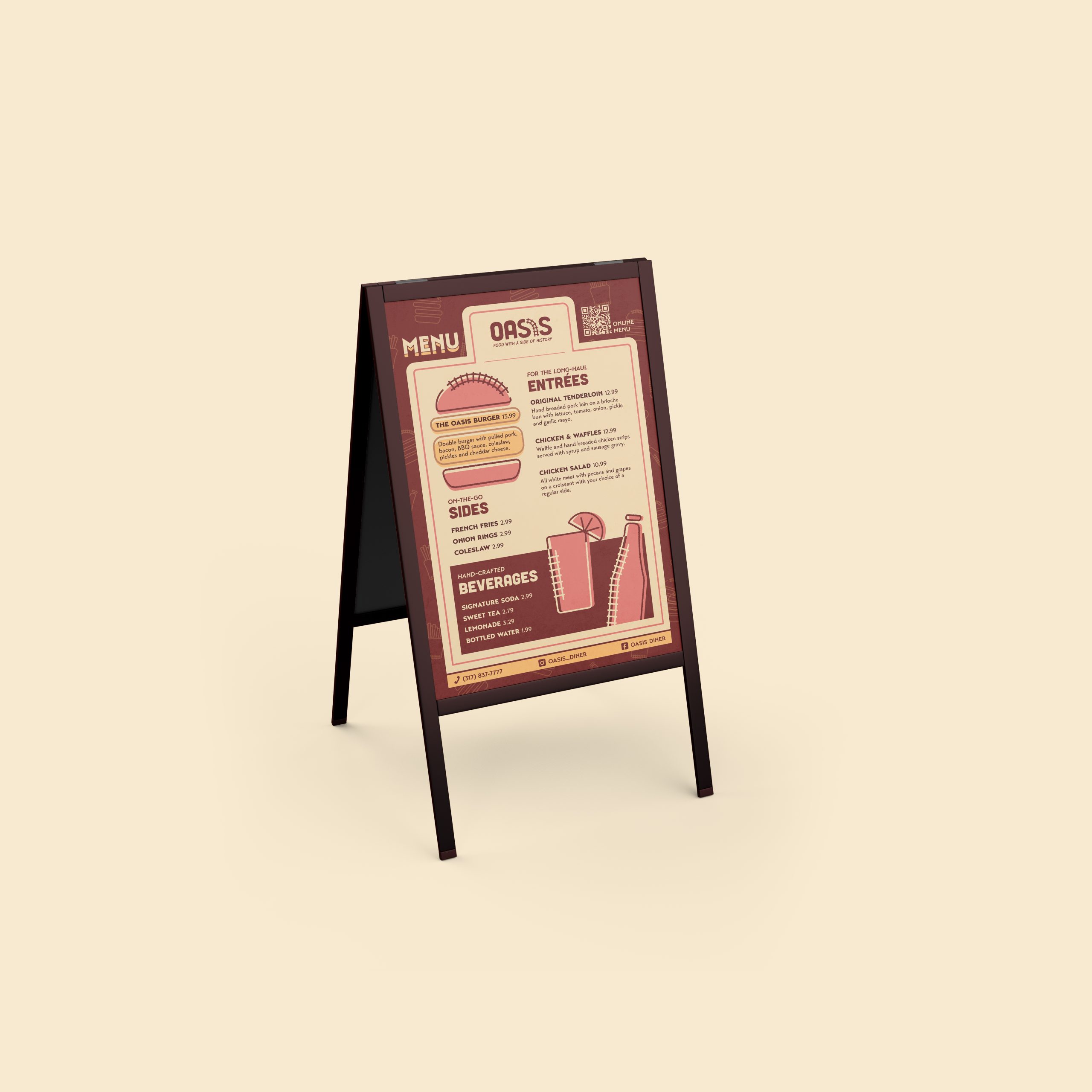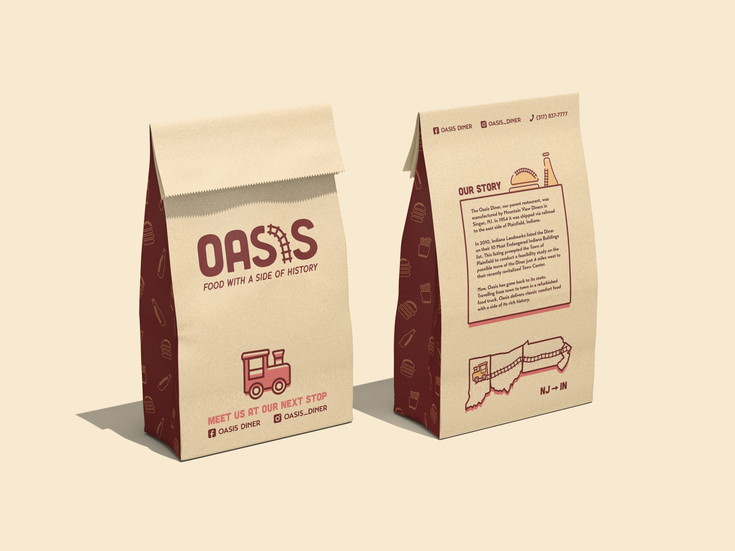 I chose to work with the Oasis Diner located west of Indianapolis. This restaurant is a classic, historical diner originating in the 1950s. I took interest in the rich history of the diner, and my visual direction focused on incorporating aspects of its history with an overarchingly retro visual style.