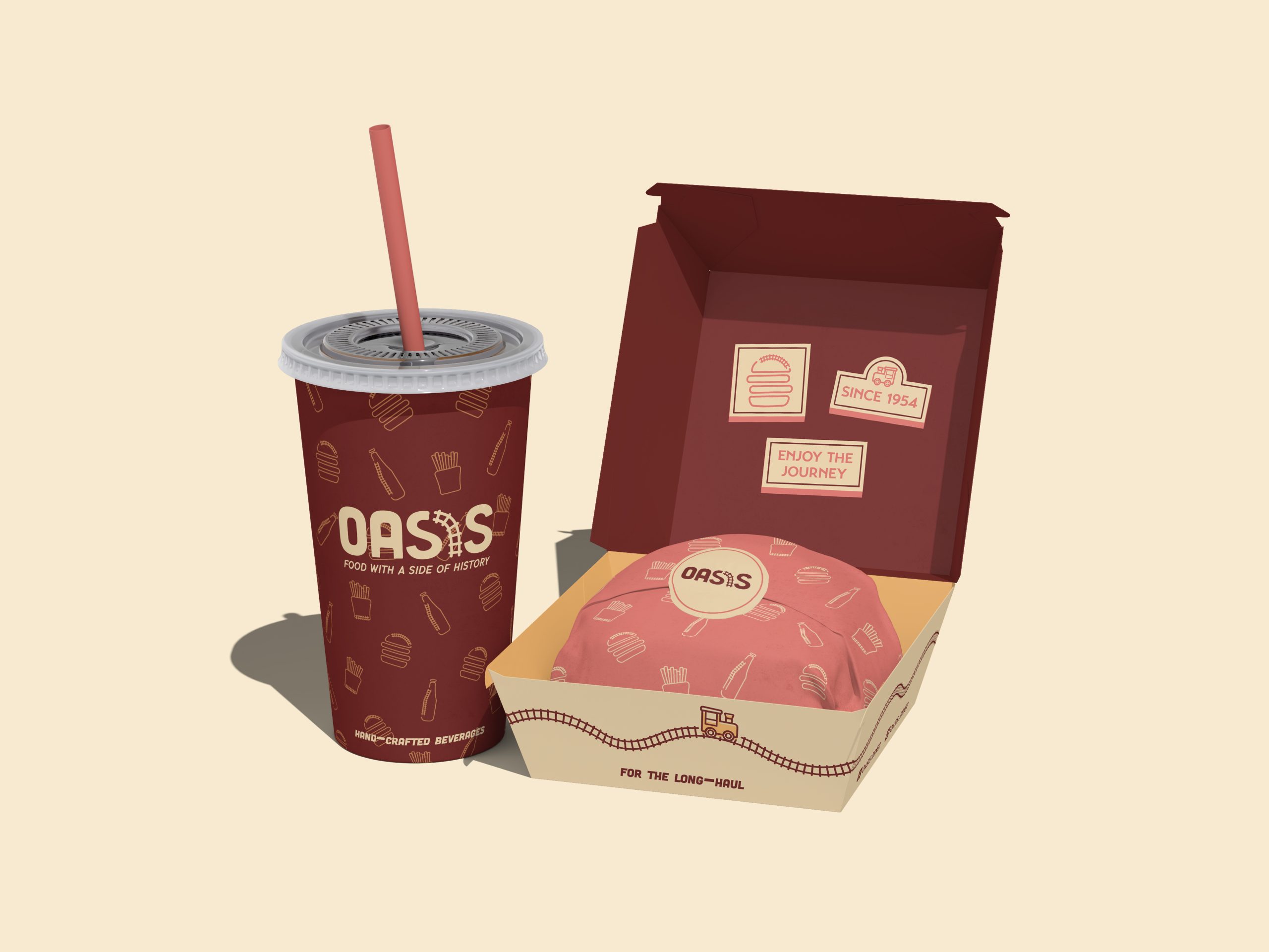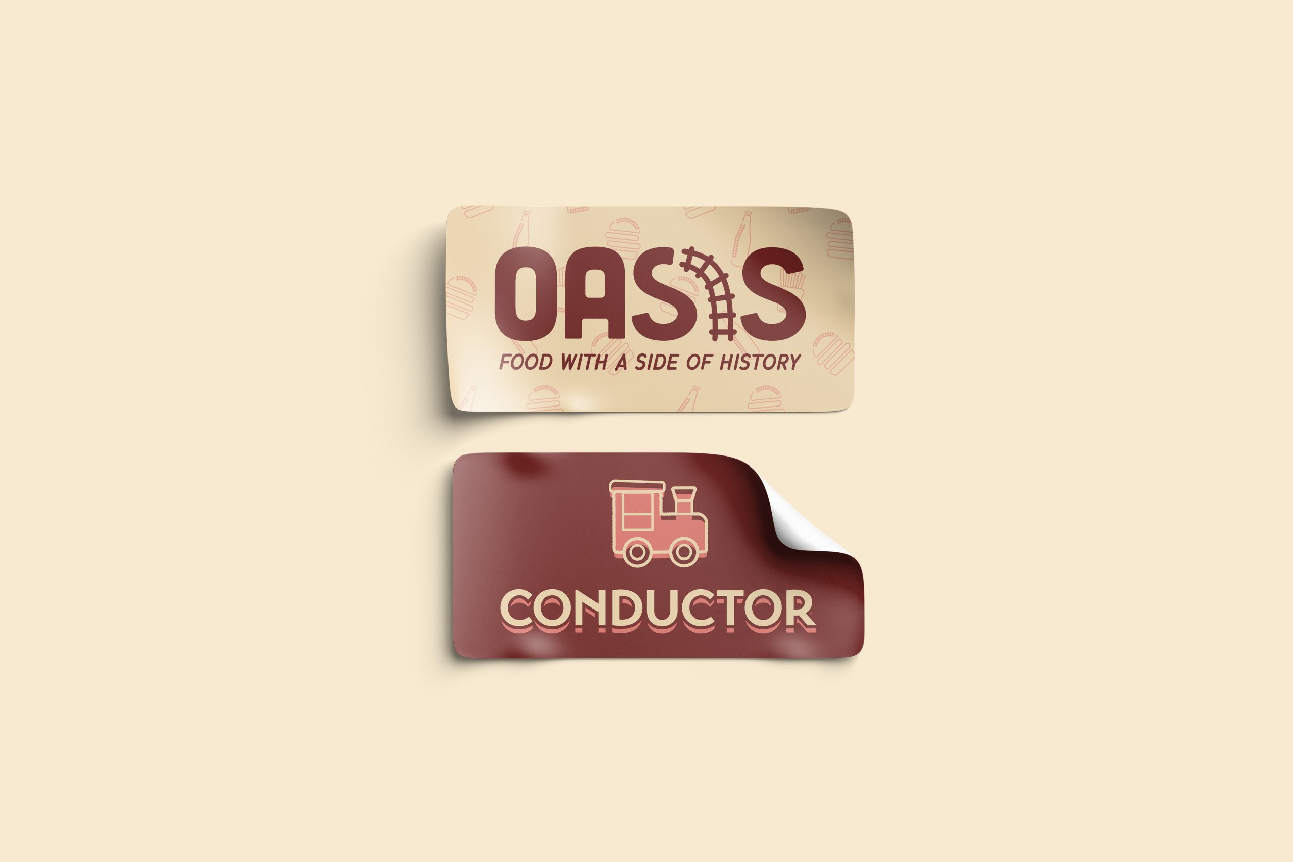Highlighting the origin of the restaurant, I incorporated railroad tracks into illustrations and utilized train signage to frame information. The block shadow type and outlines bring a retro feel to the forefront of these designs. Illustrations reinforce Oasis’ history with the pieces of train tracks juxtaposed with classic diner food. The rustier take on the diner’s original yellow and red color palette foster a more industrial, on-the-road feeling within the brand.