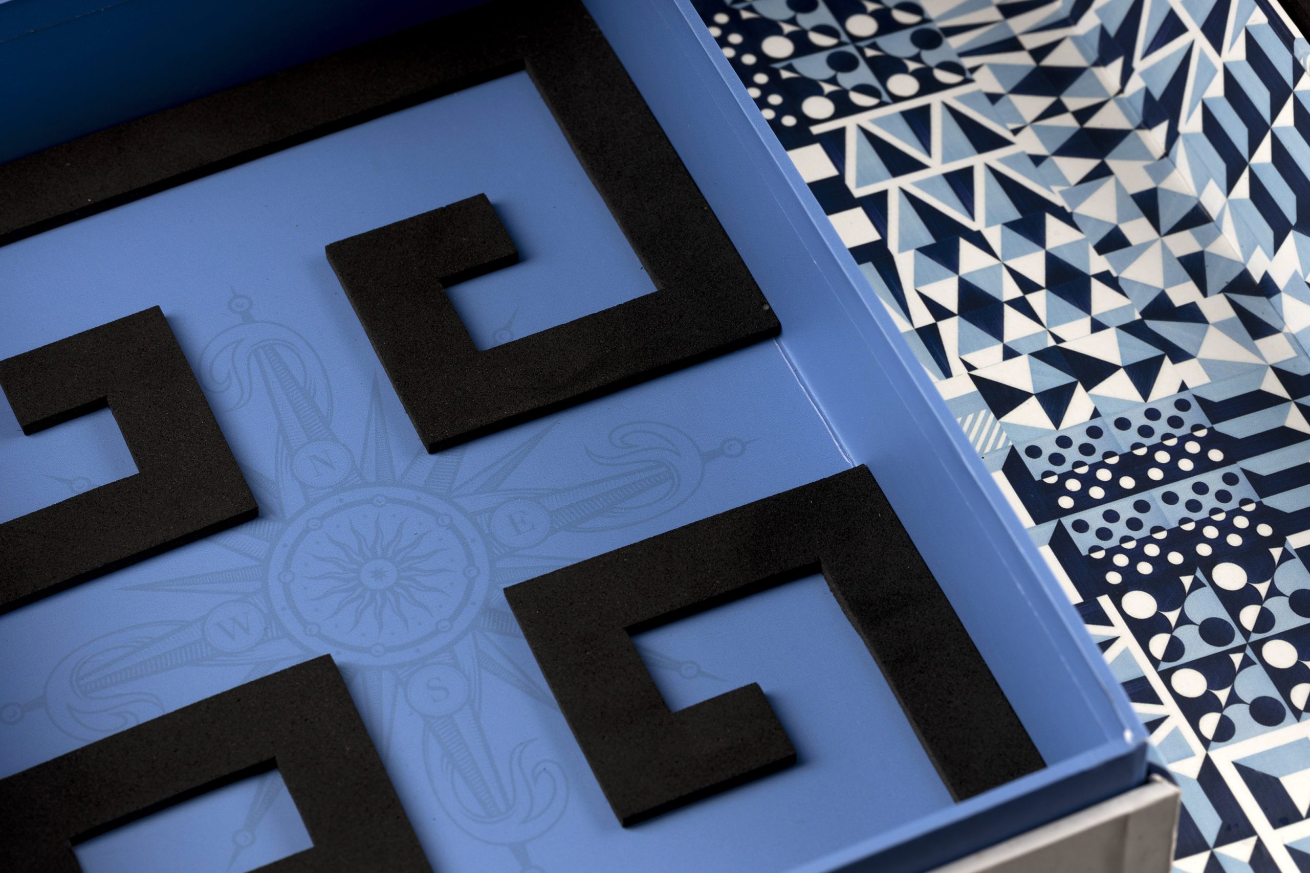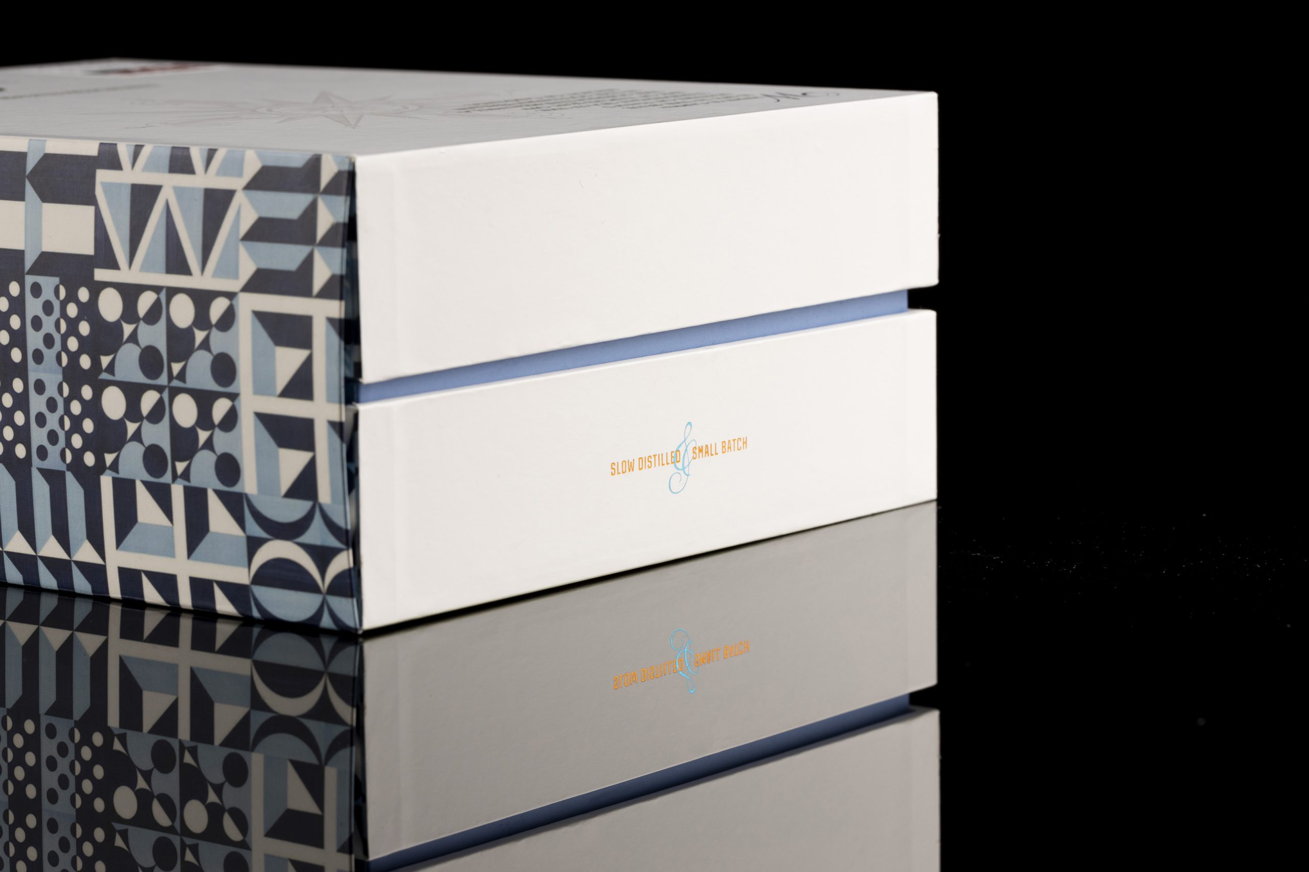 The label is printed on Jazz Ice Premium FSC by UPM Raflatac, a tactile and luminous paper enriched with metallic blue foils, UV screen-printing, and a debossing that recalls the movement of water. Each impression creates plays of light and shadow reminiscent of the sea and its depths.