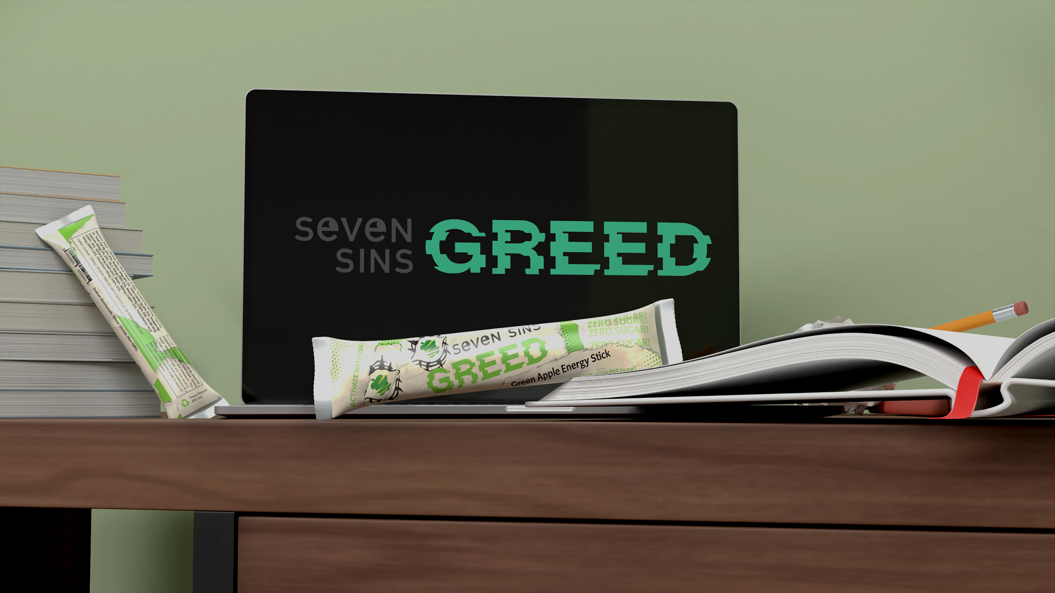 The Greed logo was inspired by a kaleidoscope vision, which alters a person’s perception by the addition of bright colors and fractured, blurry images. This represents Greed through the maximalist distortions. Greed was then used for the design of a green apple energy drink powder packet.