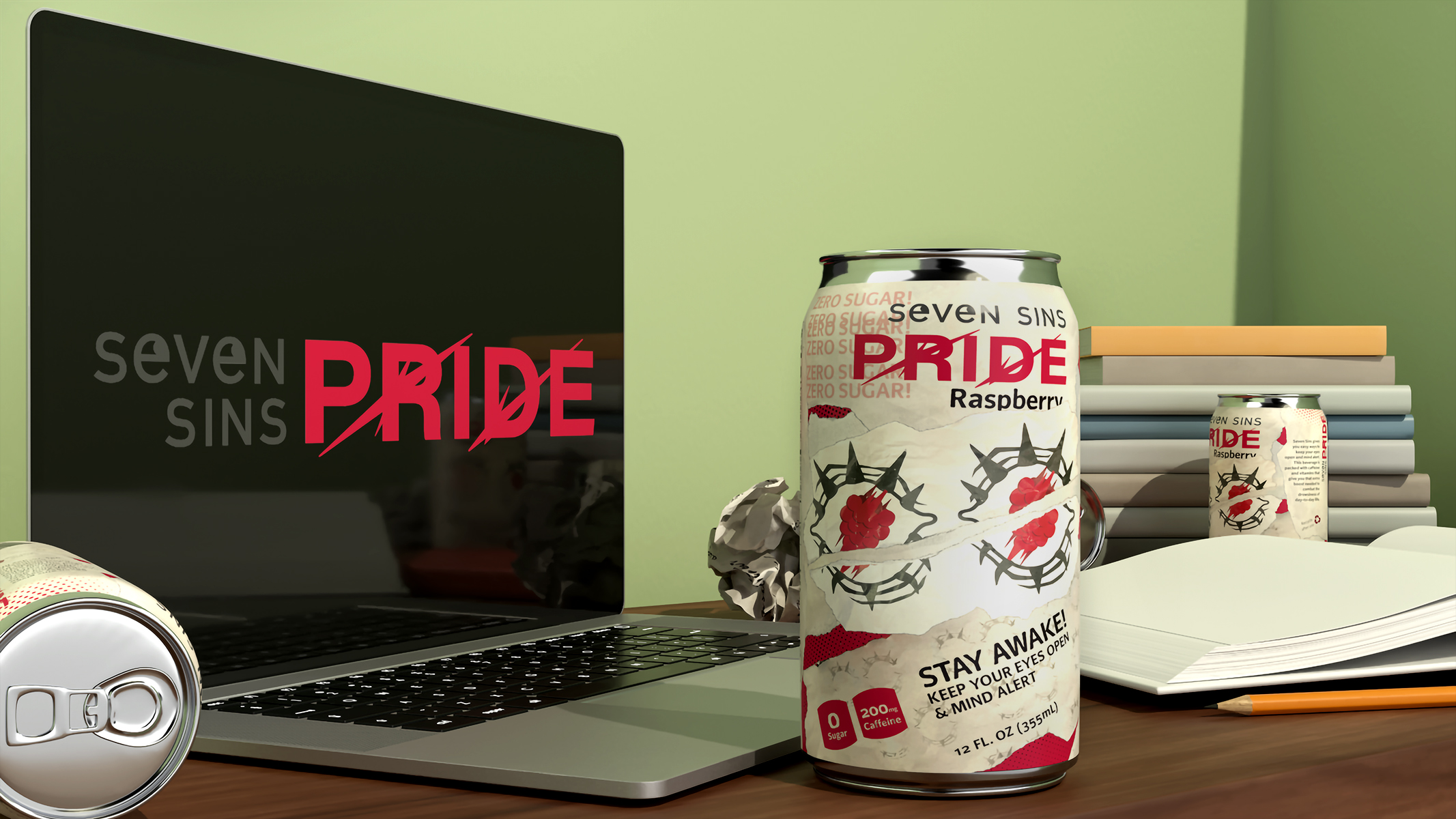 The Pride logo was inspired by light streaking, often caused by an astigmatism. This condition alters the perception of light, most noticably at night. This is paired with pride due to the flashyness of the sin itself. Pride was used in the design of a raspberry flavroed 12oz can.