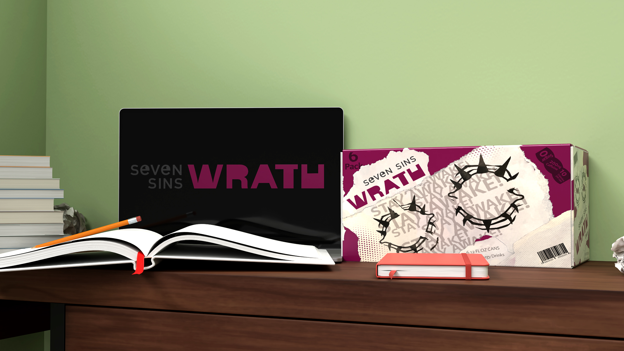 The Wrath logo was inspired by blind spots or scotomas. This fits with wrath as it embodies being blinded by rage. To convey this, the negative space of each letter was altered or completely filled in. This logo was incorporated into the design of a cherry flavored 6 pack energy drink box.