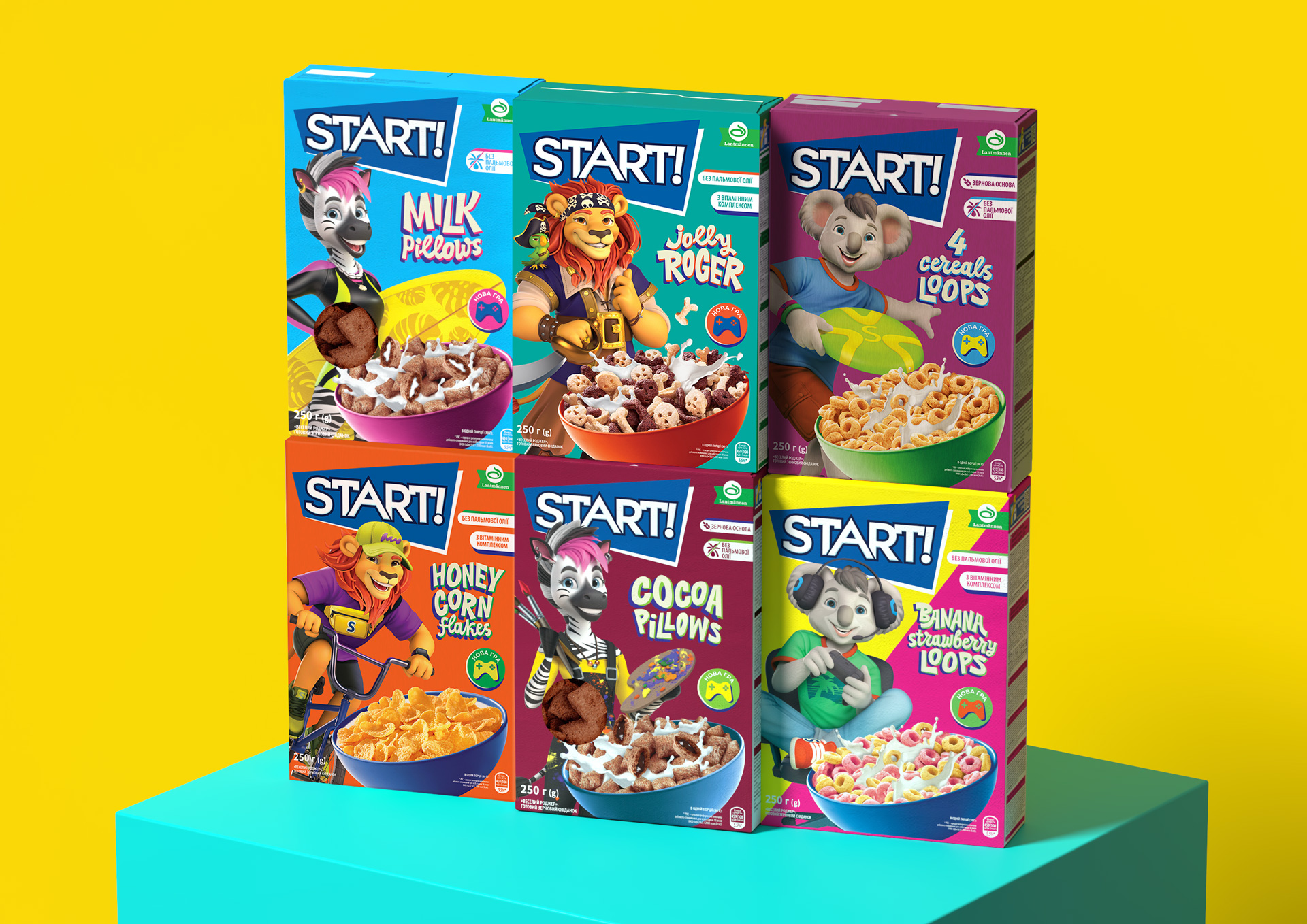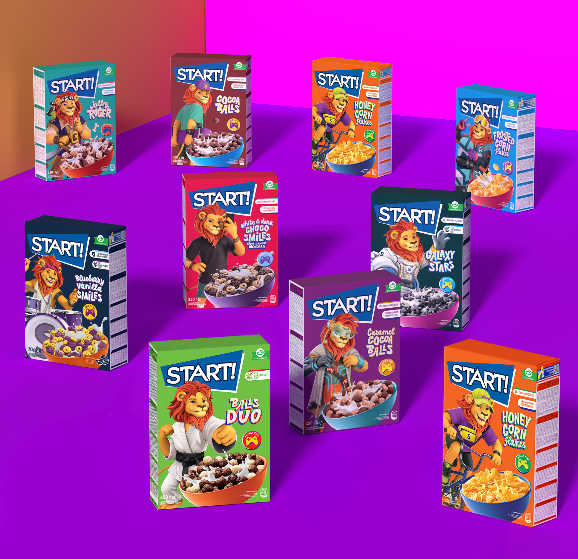 welcome to the new era of START! The kids who grew up on these delicious cereals have now grown up. Teen trends change at skateboarding speed, but the cravings for healthy nutrition, games, and imaginary friends never fades. Towards the end of last year, the client challenged us to breathe new life into the brand, update the packaging design and keep the connection with the beloved characters alive.