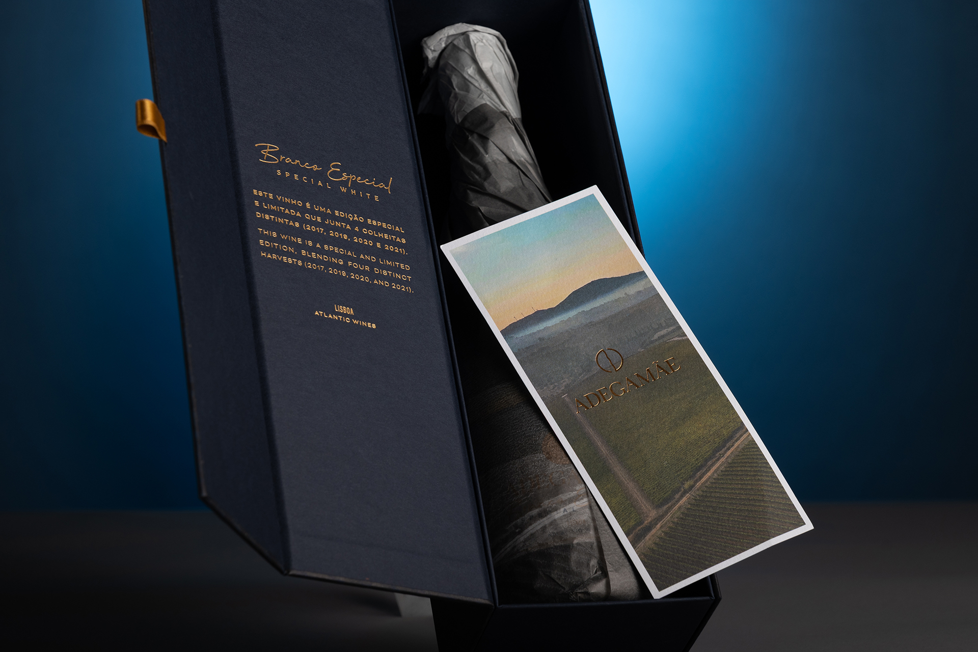 AdegaMãe Branco Especial is born from a blend of four harvests, revealing the depth and Atlantic identity that define AdegaMãe’s exceptional white wines. This unique expression is reflected in the packaging, designed to highlight its origin and authenticity. The palette of blues and textured elements evokes the coastal landscape, while the embossing and gold detailing emphasise the premium character and exclusivity of this limited edition. This project embodies that vision: a design that consistently and elegantly interprets the essence and personality of the wine it represents.