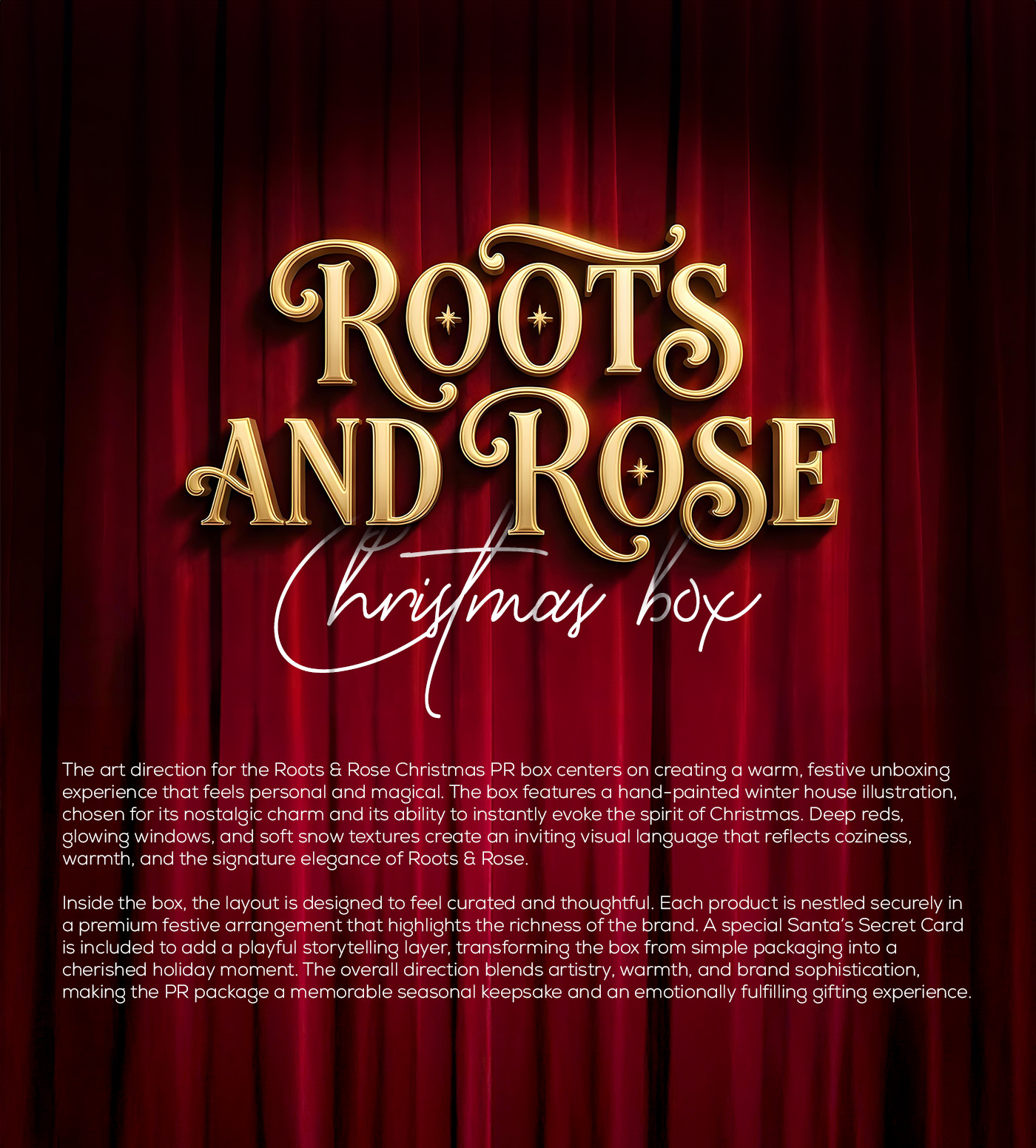 Marklinica created the Christmas PR box for Roots and Rose with one goal in mind: to design an unboxing experience that feels warm, nostalgic, and unmistakably magical. Every detail inside the box was crafted to turn skincare into a holiday moment filled with emotion, charm, and the signature elegance of Roots and Rose.