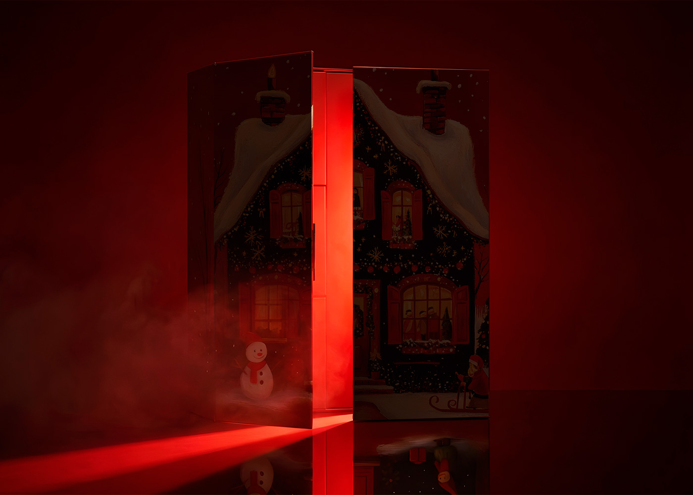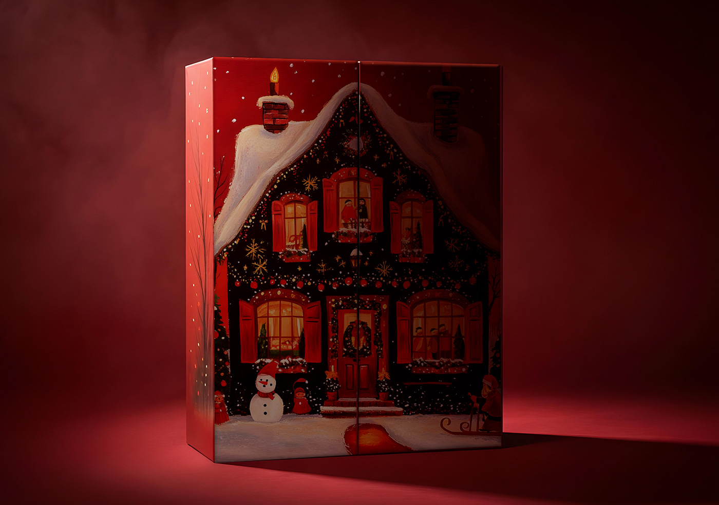 The box is built around a hand-painted Christmas house illustration, chosen for its nostalgic warmth and ability to instantly evoke the spirit of the season. Deep reds, glowing windows, and soft snow textures create a theatrical, story-like atmosphere inspired by classic holiday memories.