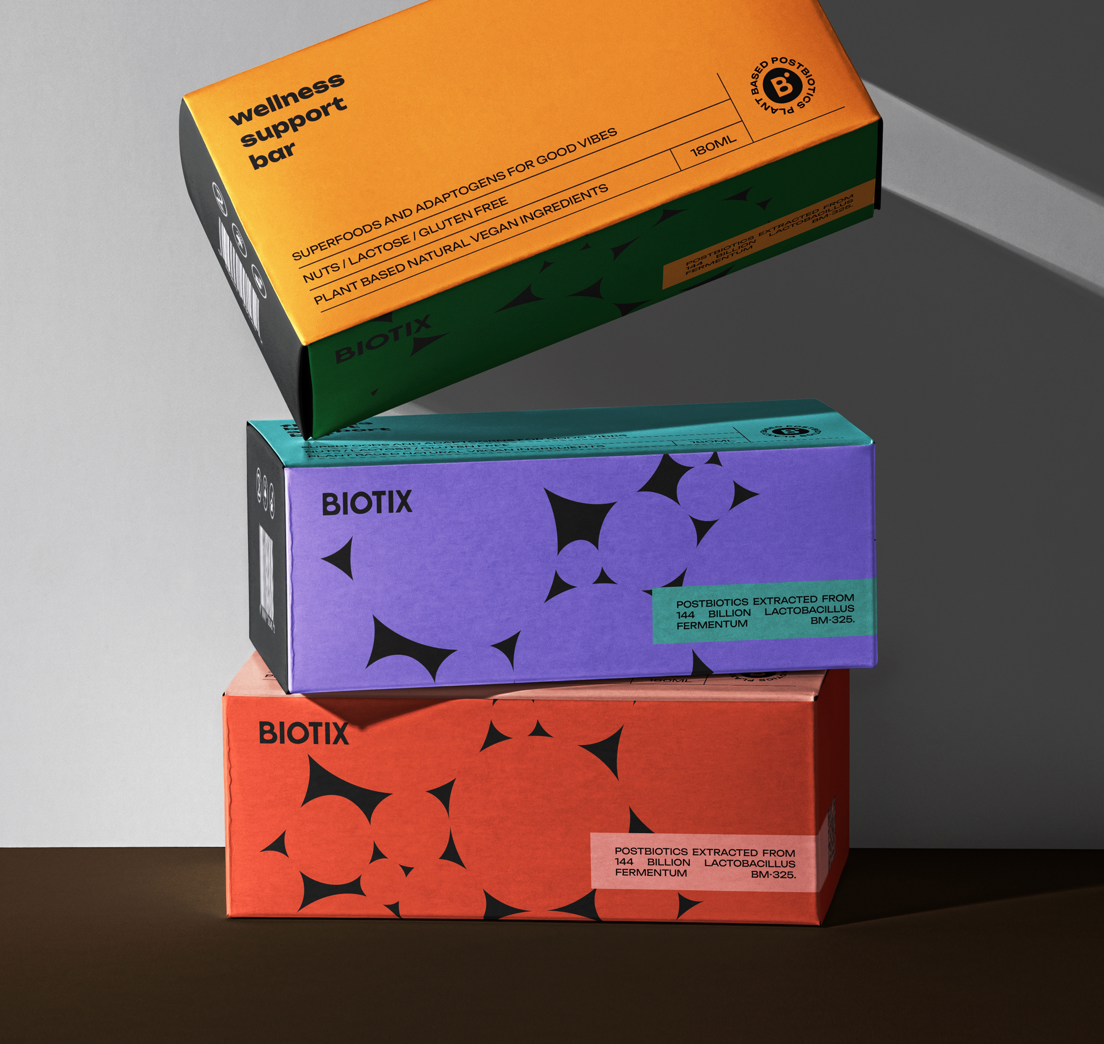 Biotix is developed around plant-based postbiotics, with insights drawn from airag and fermentation science to support gut and immune health. Three distinct colors are used to differentiate the product range, each connected to a specific ingredient profile. Every element was kept intentional, allowing the product to communicate through structure rather than decoration.