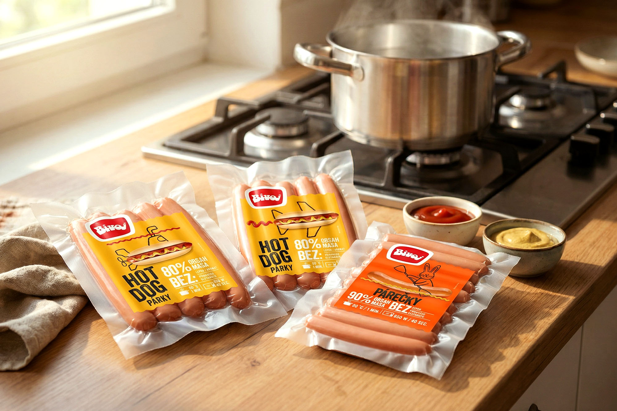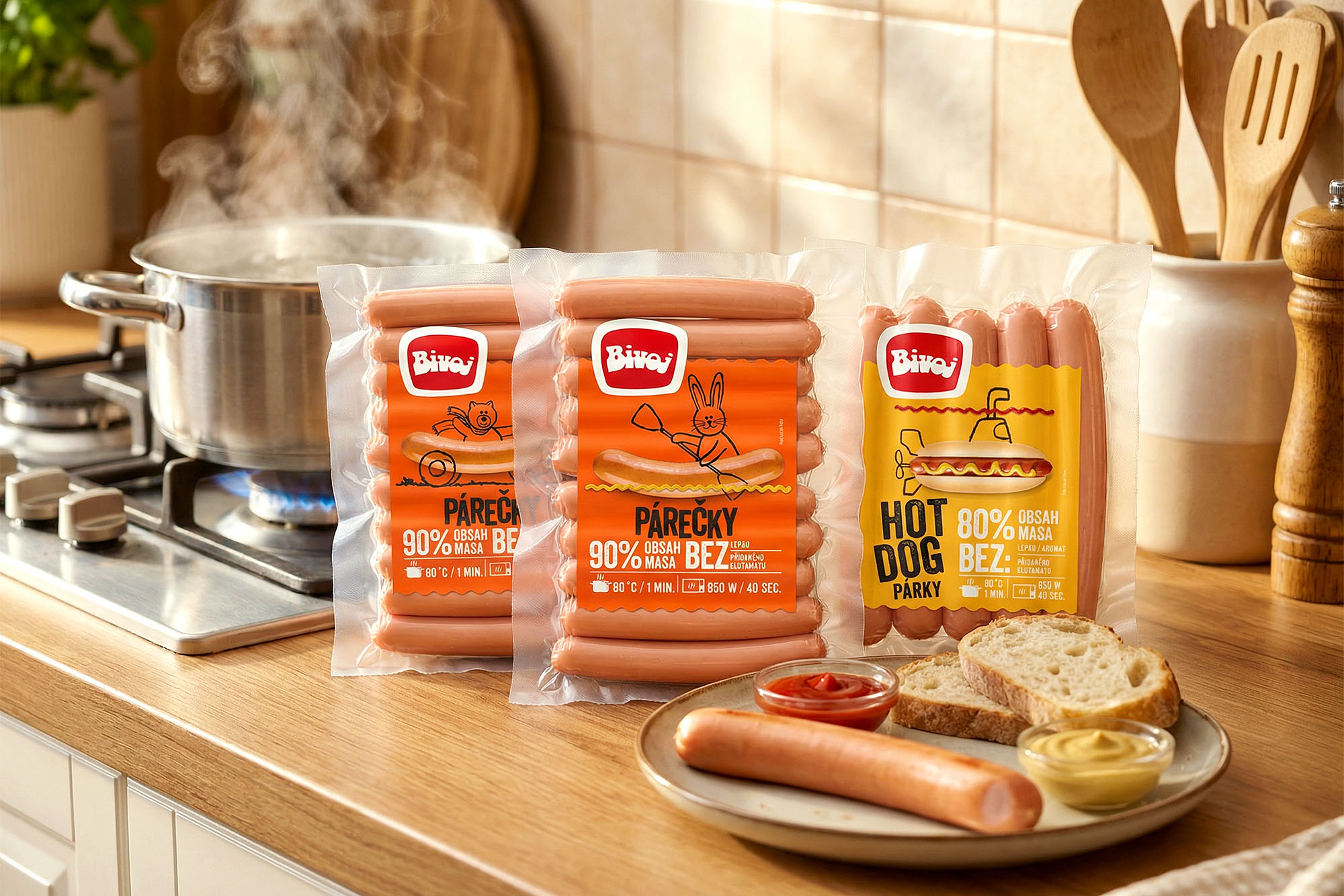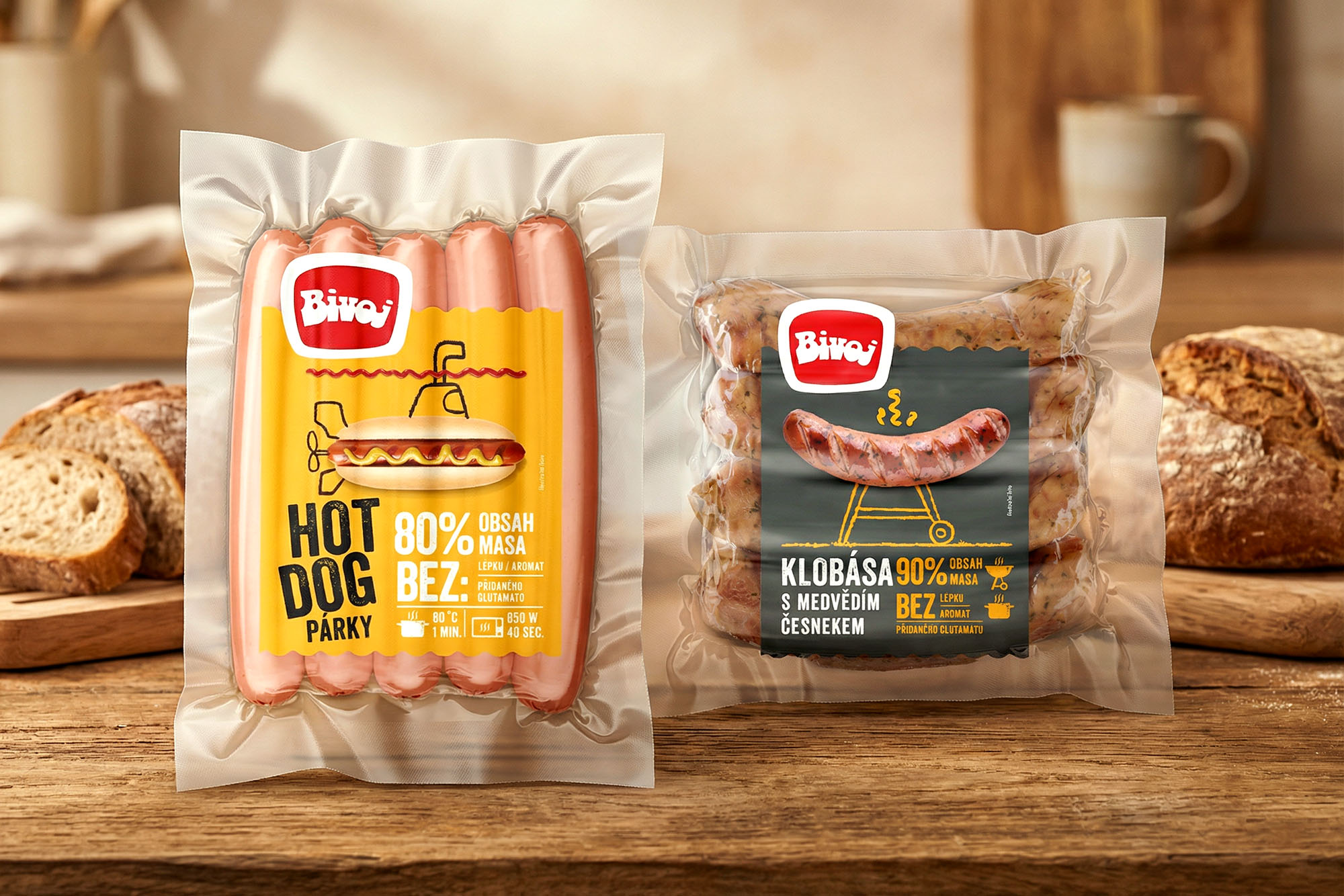 Transparent flowpack packaging with a strong front label was chosen to keep the sausages fully visible while maximising communication space for preparation icons and product information. The flexible film structure ensures efficient logistics and shelf merchandising, while the consistent layout across variants supports easy navigation between hot dog, sausages and grill products within the Bivoj range.