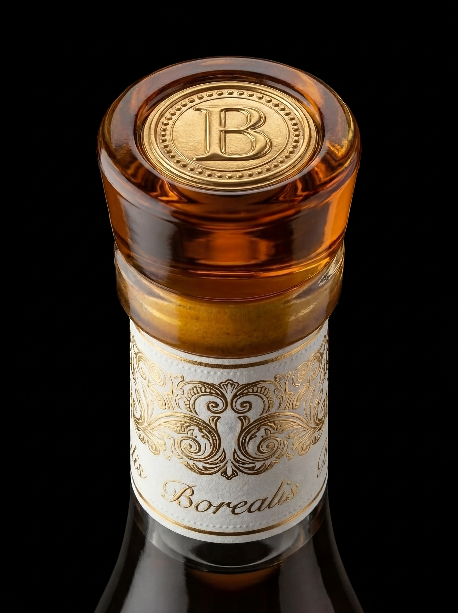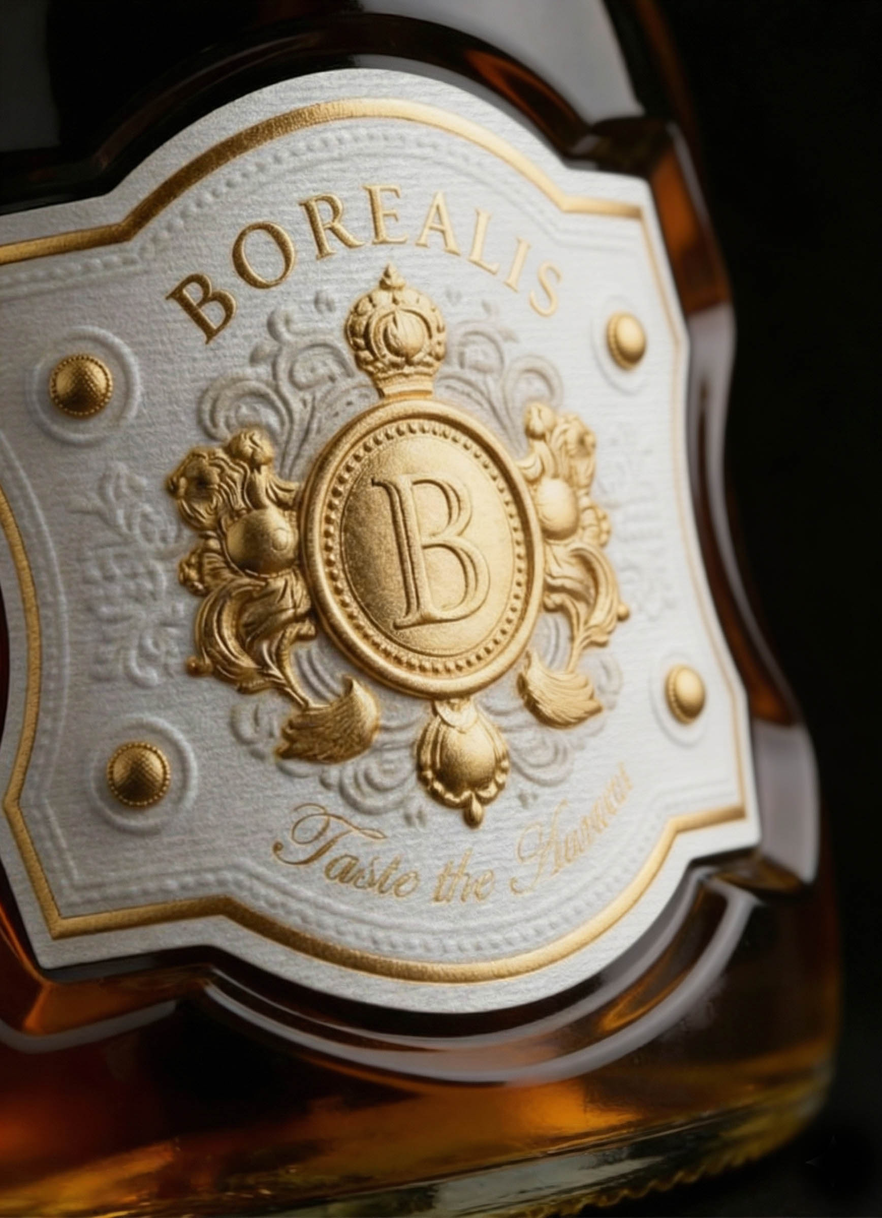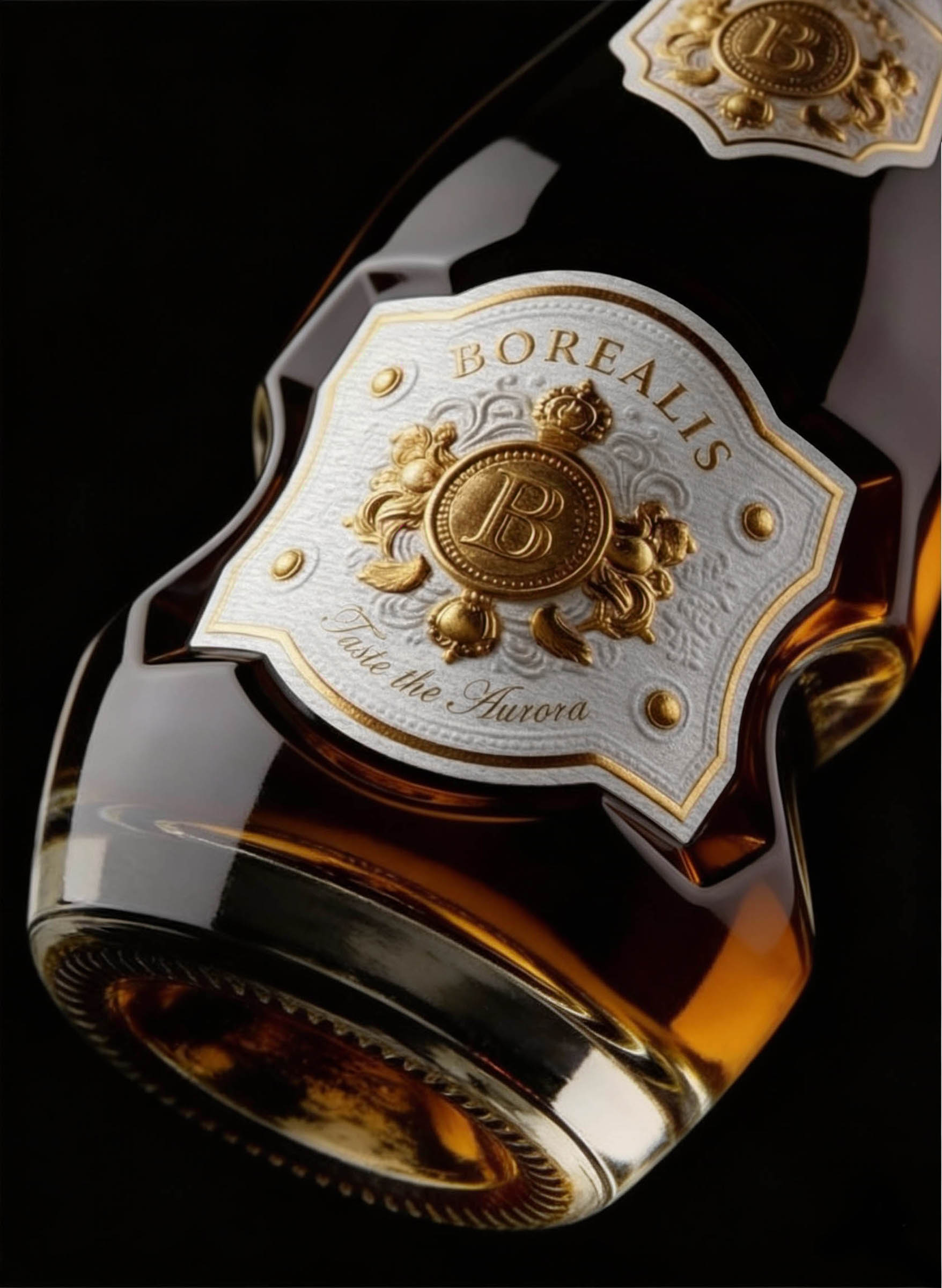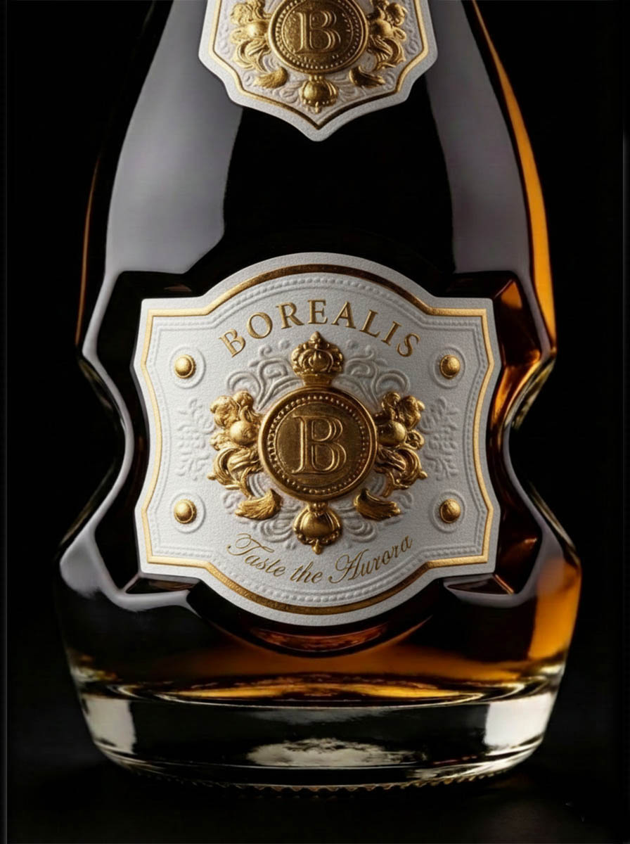 The deep indentations in the glass beneath the label are no accident: they bend and refract light, producing a soft, living shimmer inside the bottle. This effect is reminiscent of the dance of the northern lights across the night sky — gentle curves and highlights seem to come alive, shimmering in golden amber tones.