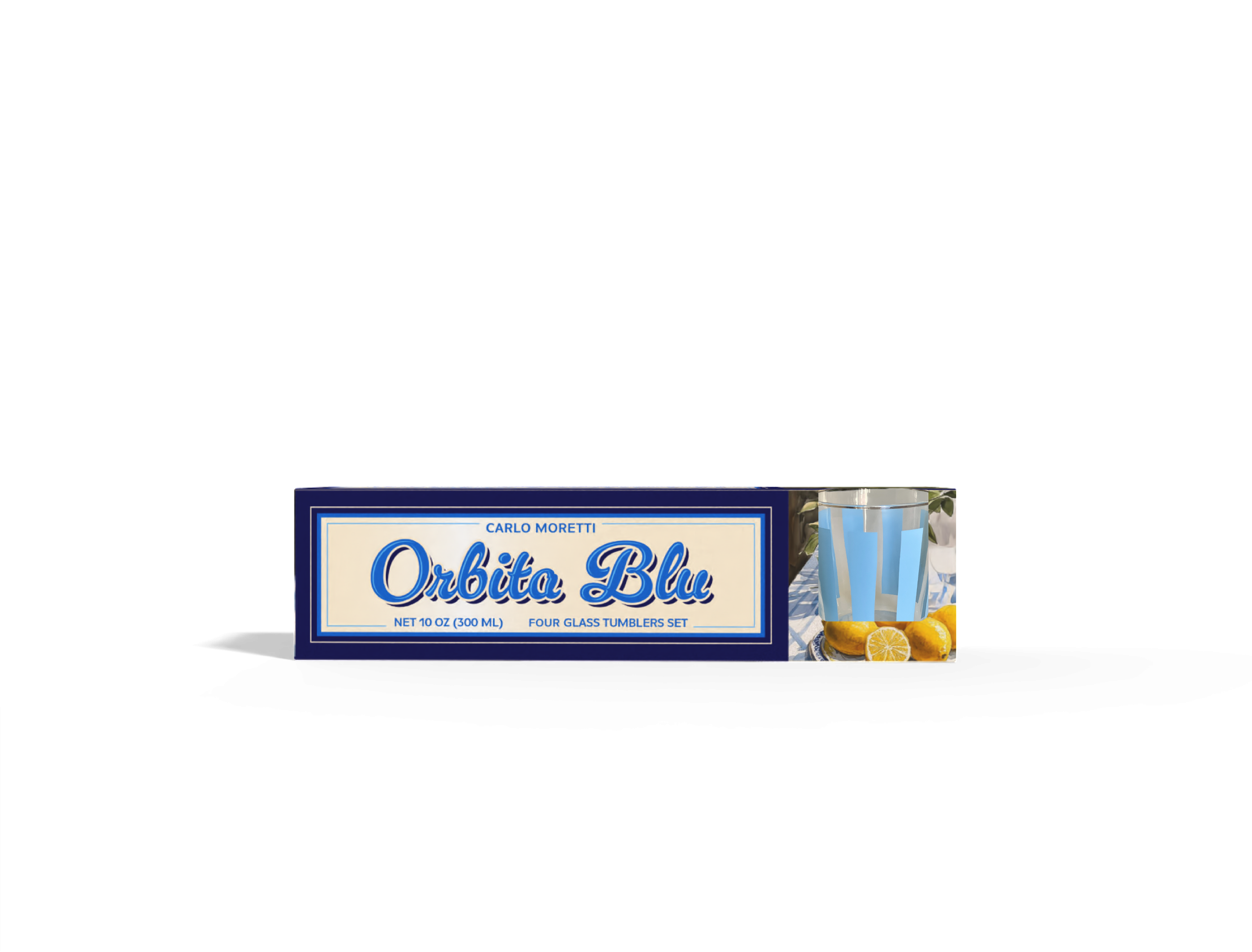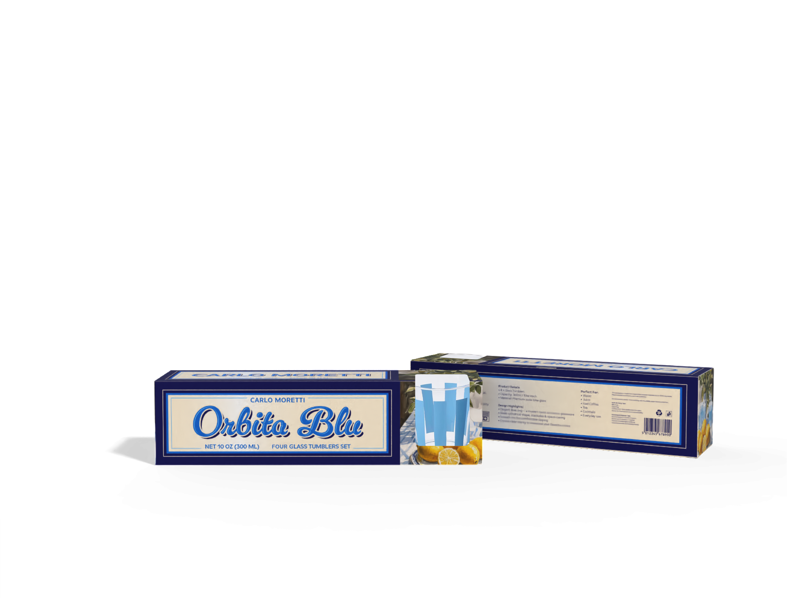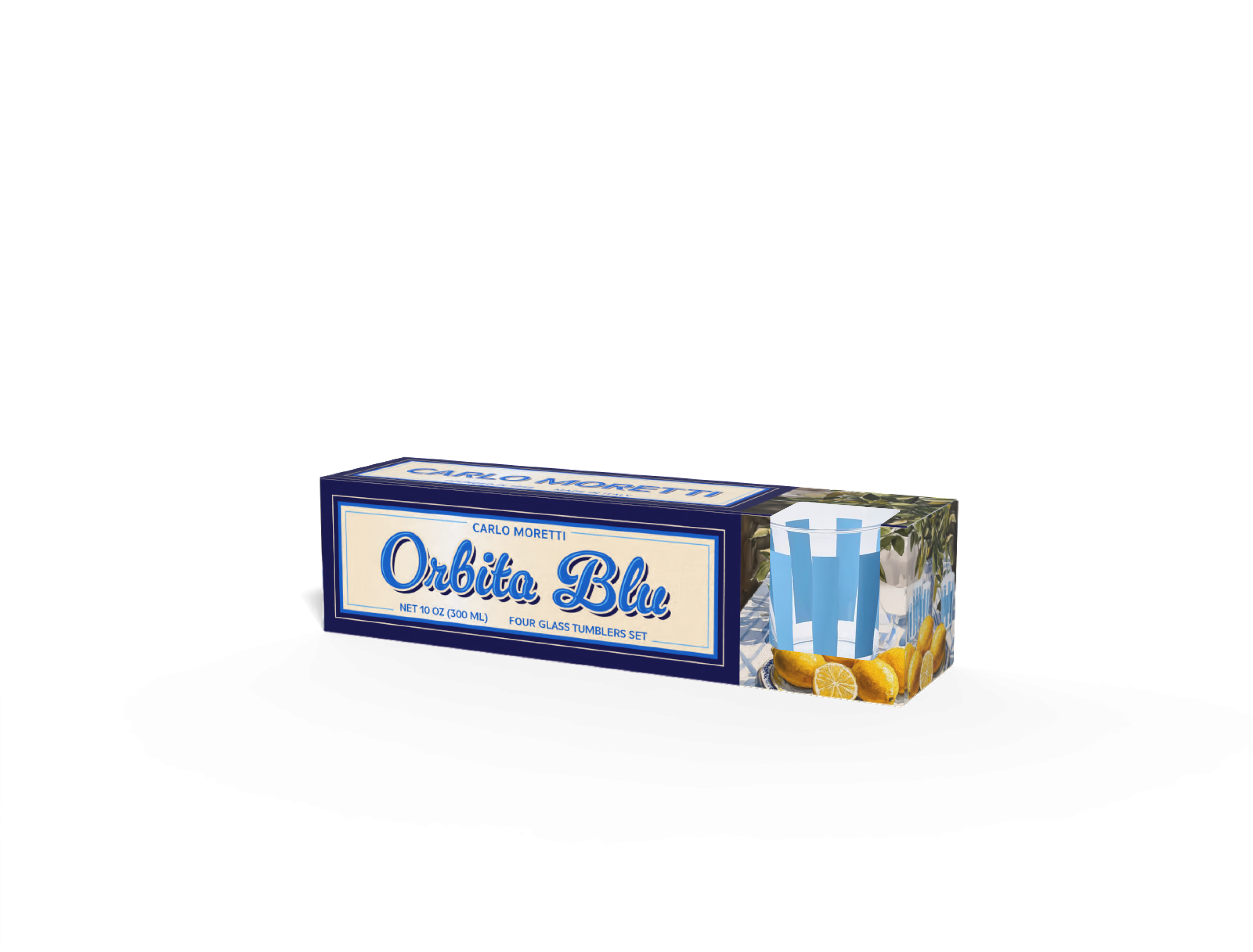 This packaging project was created for Carlo Moretti, drawing from the brand’s heritage in Italian glass artistry and the atmosphere of Mediterranean coastal living. Designed for the Orbita Blu glassware set, the packaging translates the clarity, lightness, and elegance of glass into a graphic and structural language that feels both nostalgic and refined.