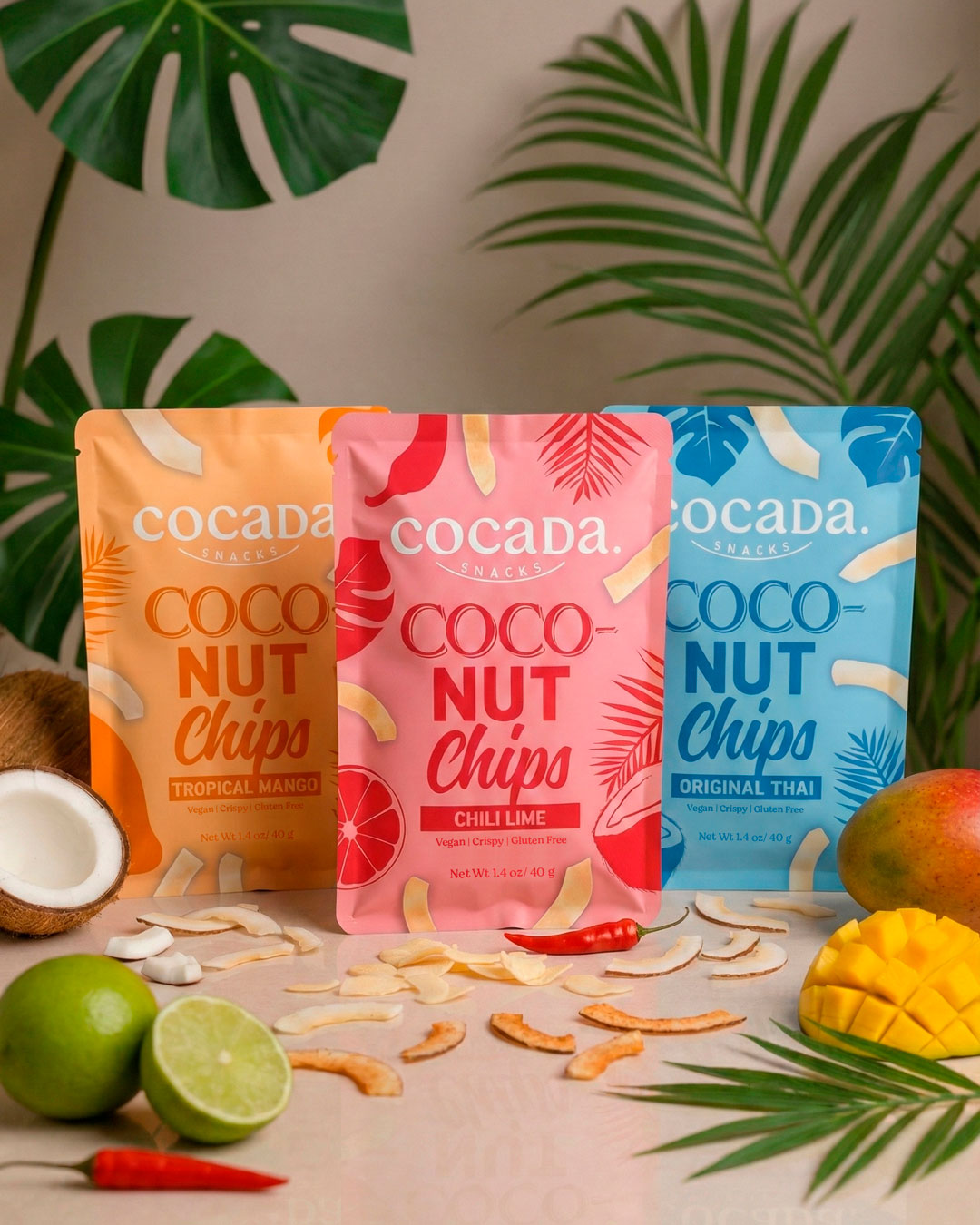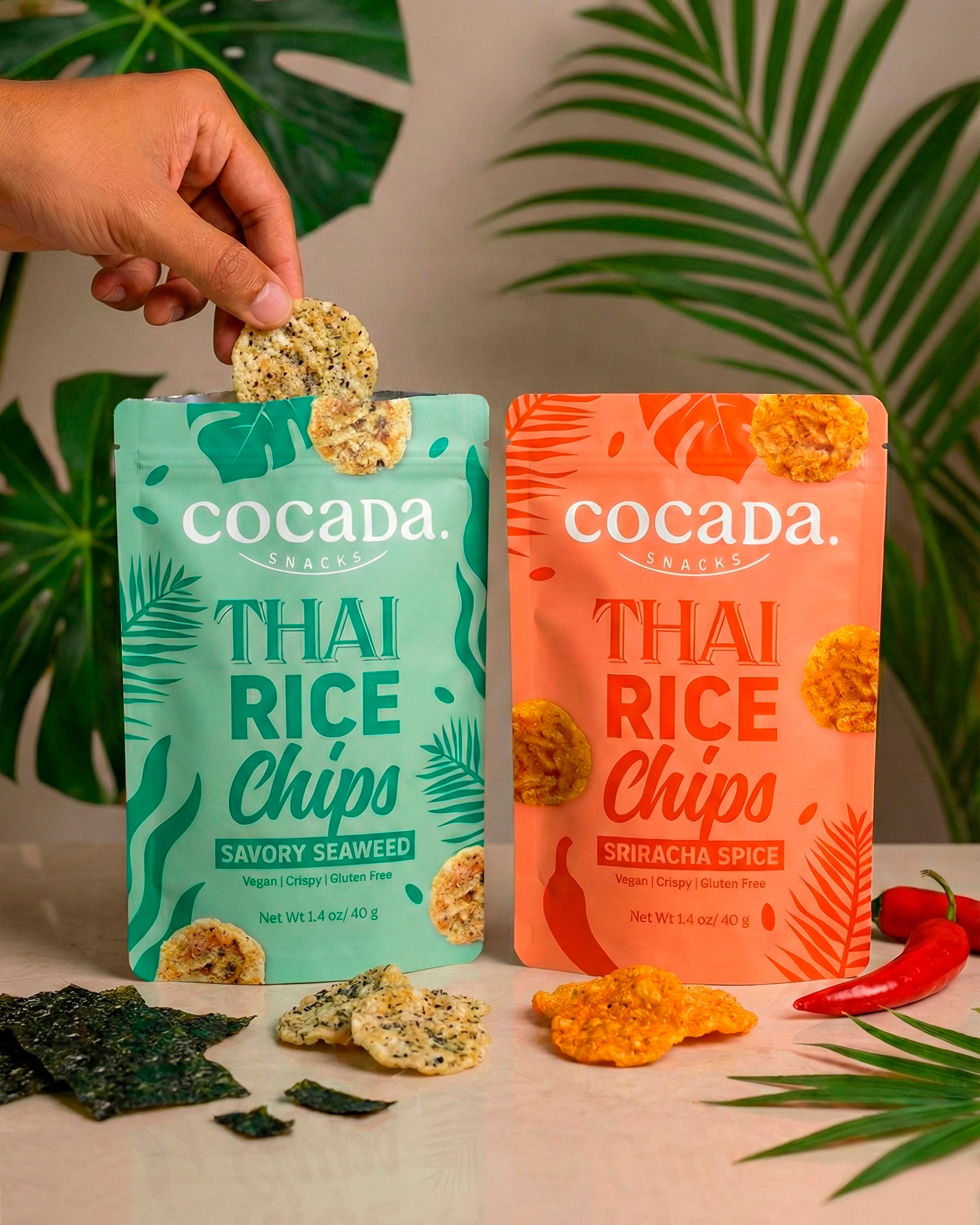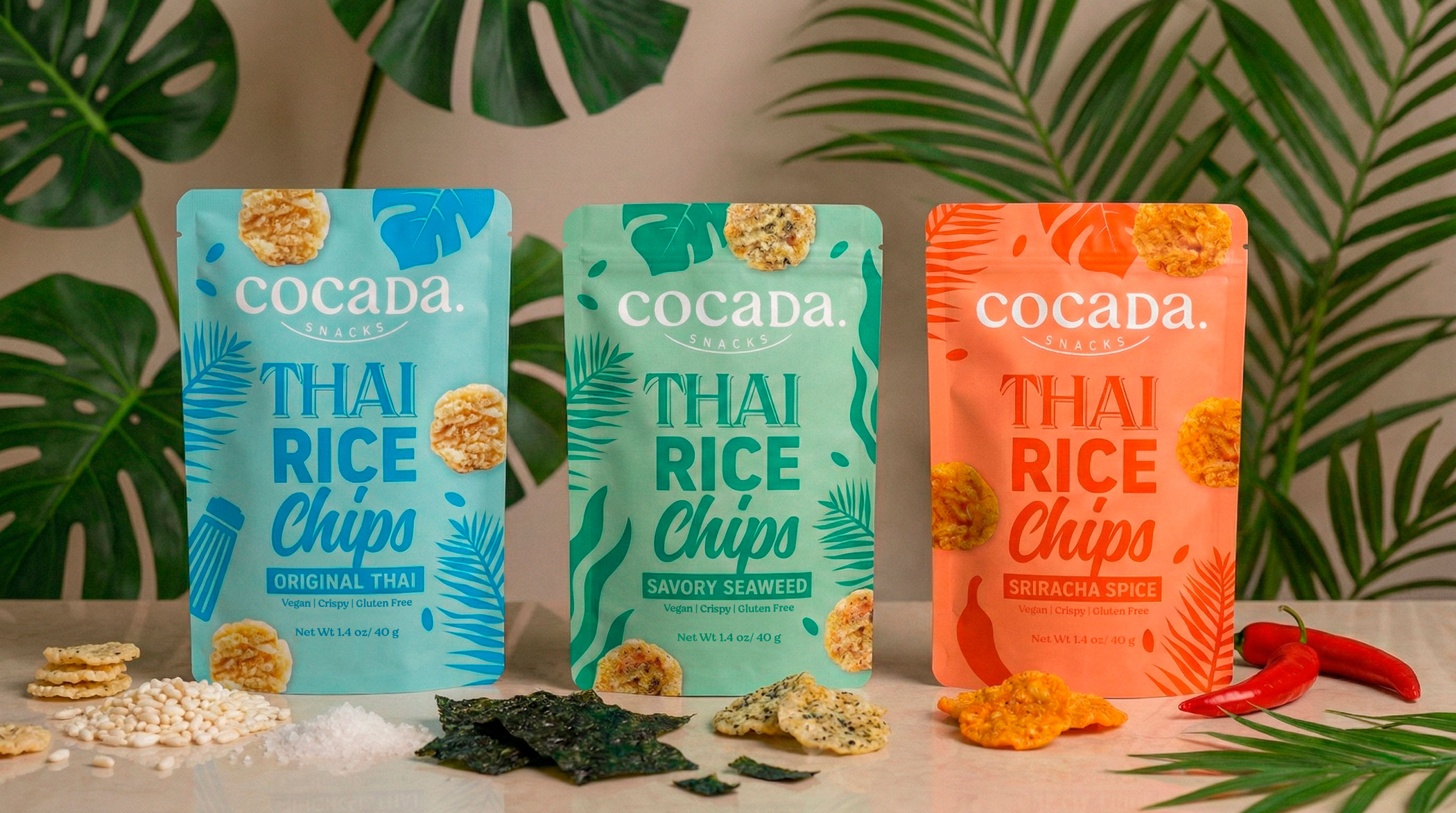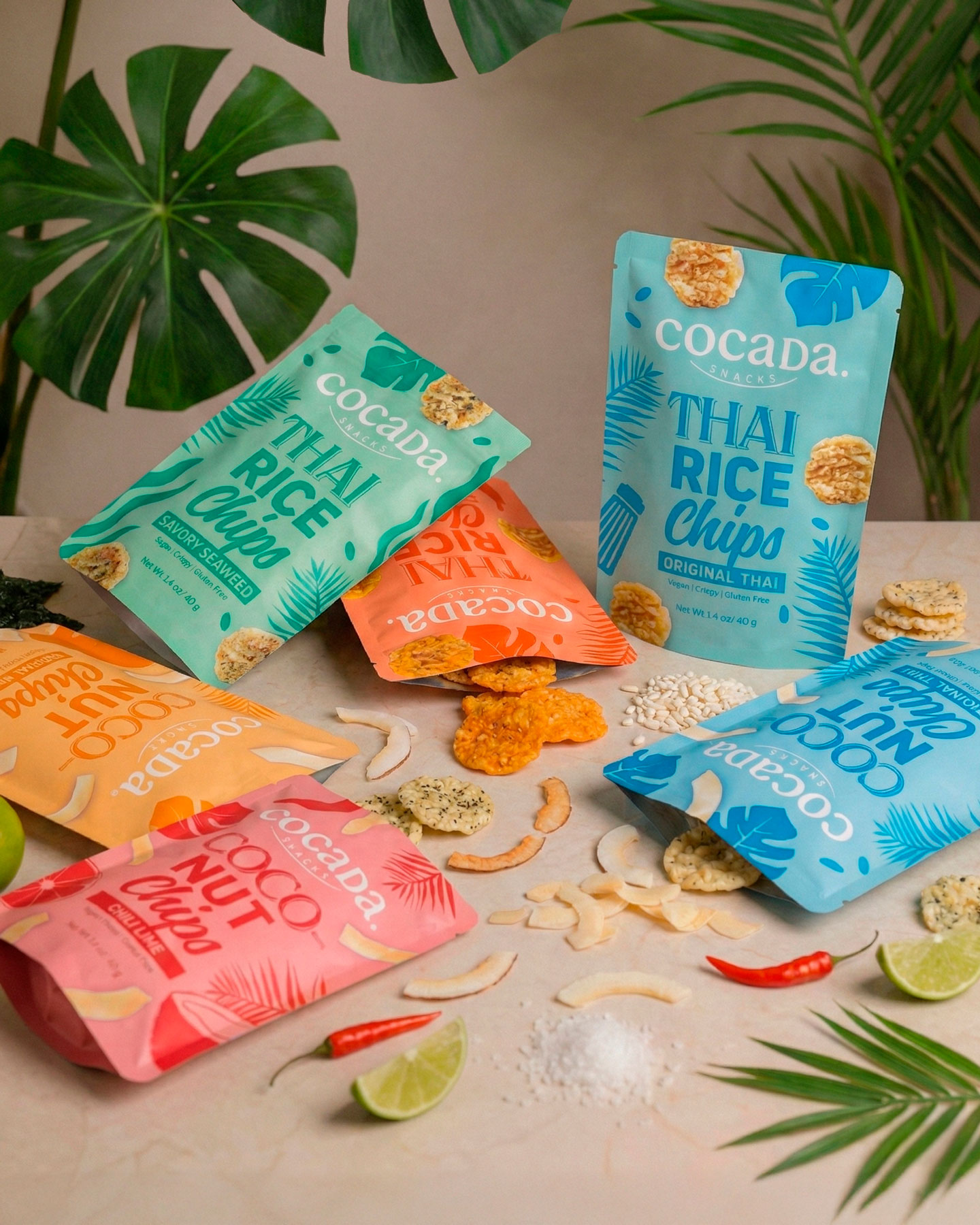 Packaging redesign for Cocadas Snacks, a new line of coconut snacks and rice snacks inspired by Thai cuisine. The goal was to build a visual identity capable of conveying origin, flavor, and personality from the very first moment on shelf, connecting with an international audience eager to discover flavors from around the world.