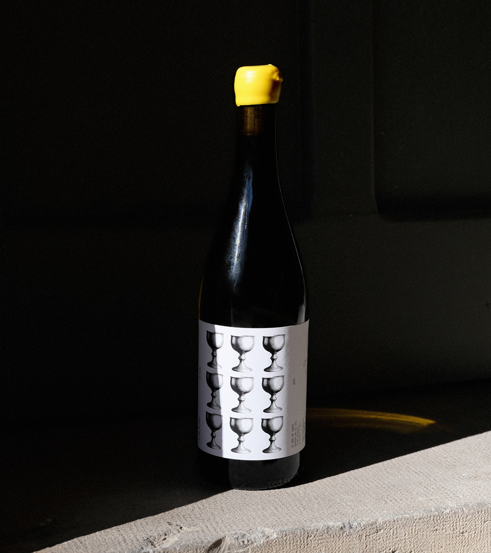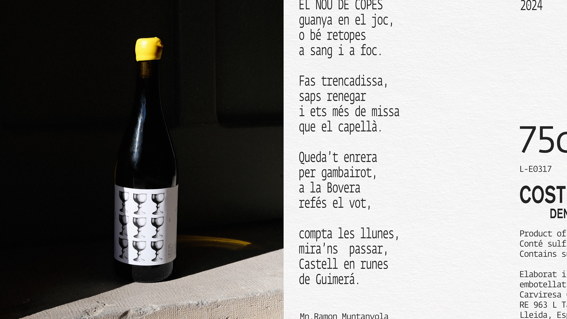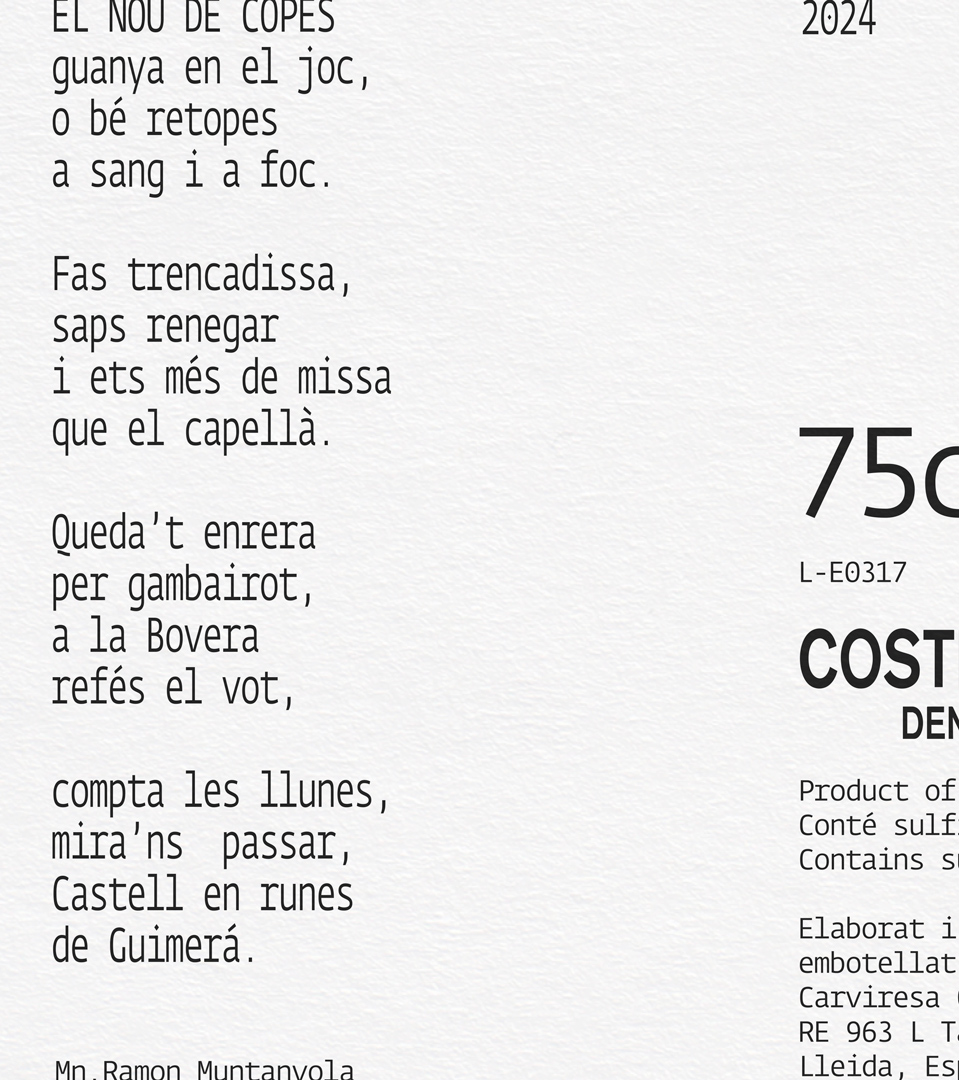 The project seeks to recover and highlight popular and historical words and references from the village of Guimerà, a town of medieval origin, in order to build, through wine, a new promotional and poetic narrative of the place. The label is rooted in its medieval past, the symbol of the Nine of Cups, and a poem by Mn. Ramon Muntanyola, and takes shape as a proposal that reclaims the town’s historical character through poetic language and a lithographic-inspired visual treatment.