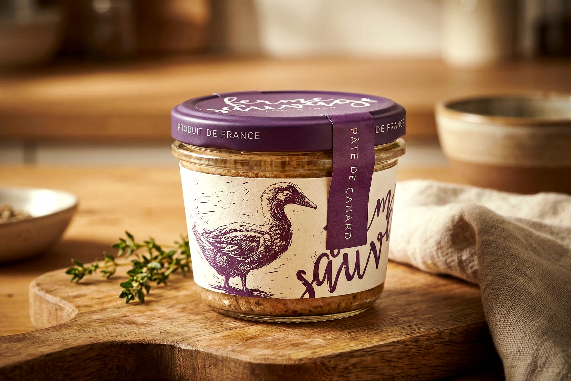 French Paté celebrates rustic French gastronomy through a warm, artisanal jar design that feels at home on a farmhouse table as well as a gourmet deli shelf. The handwritten logotype and expressive animal illustrations were crafted to convey authenticity, traditional recipes, and a sense of friendly imperfection that stands out among more industrial pâté brands.
