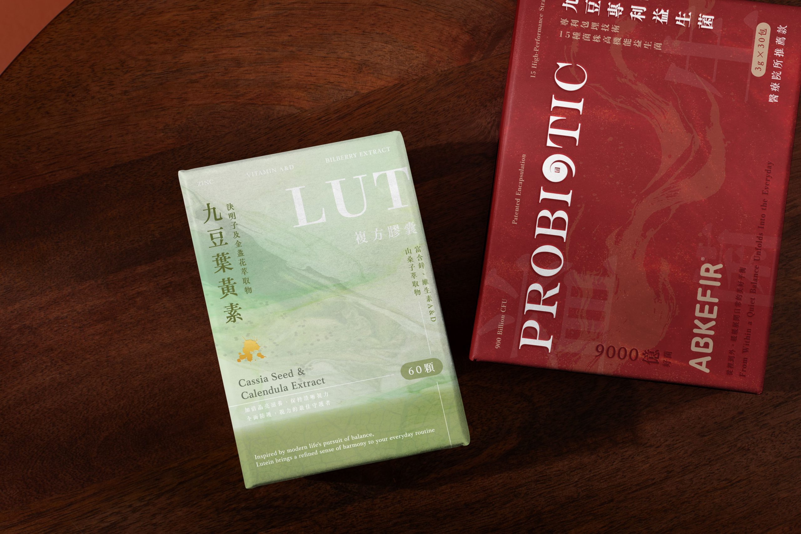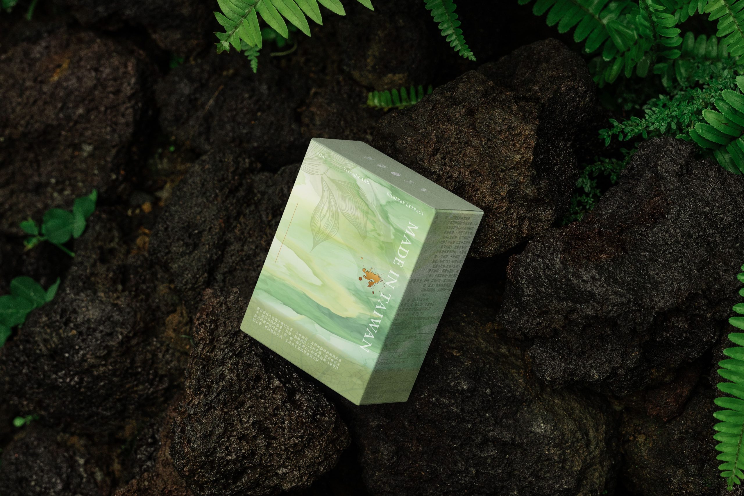 Leaf vein lines and faintly revealed Chinese characters for “lutein” echo traces found in nature. These understated details reference herbal nourishment and quietly reinforce the product name, creating depth that reveals itself over time.