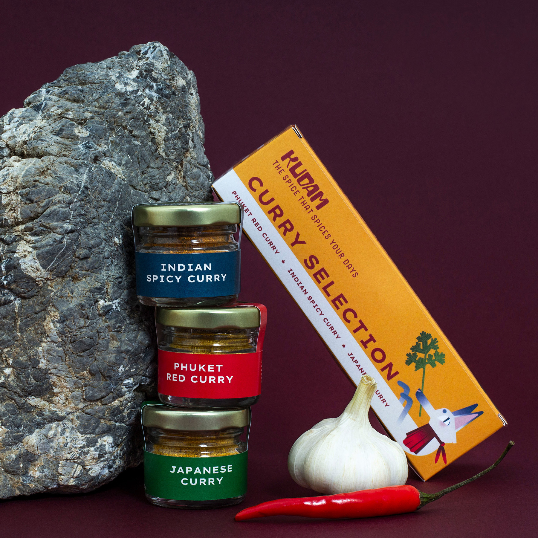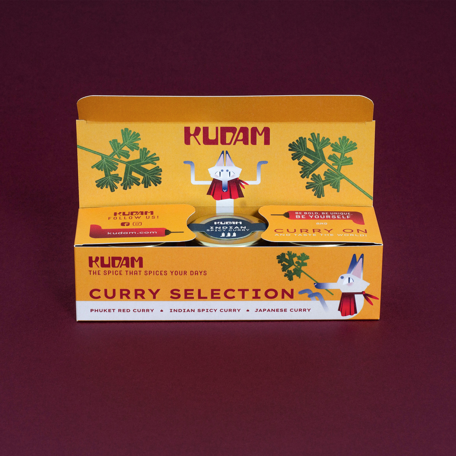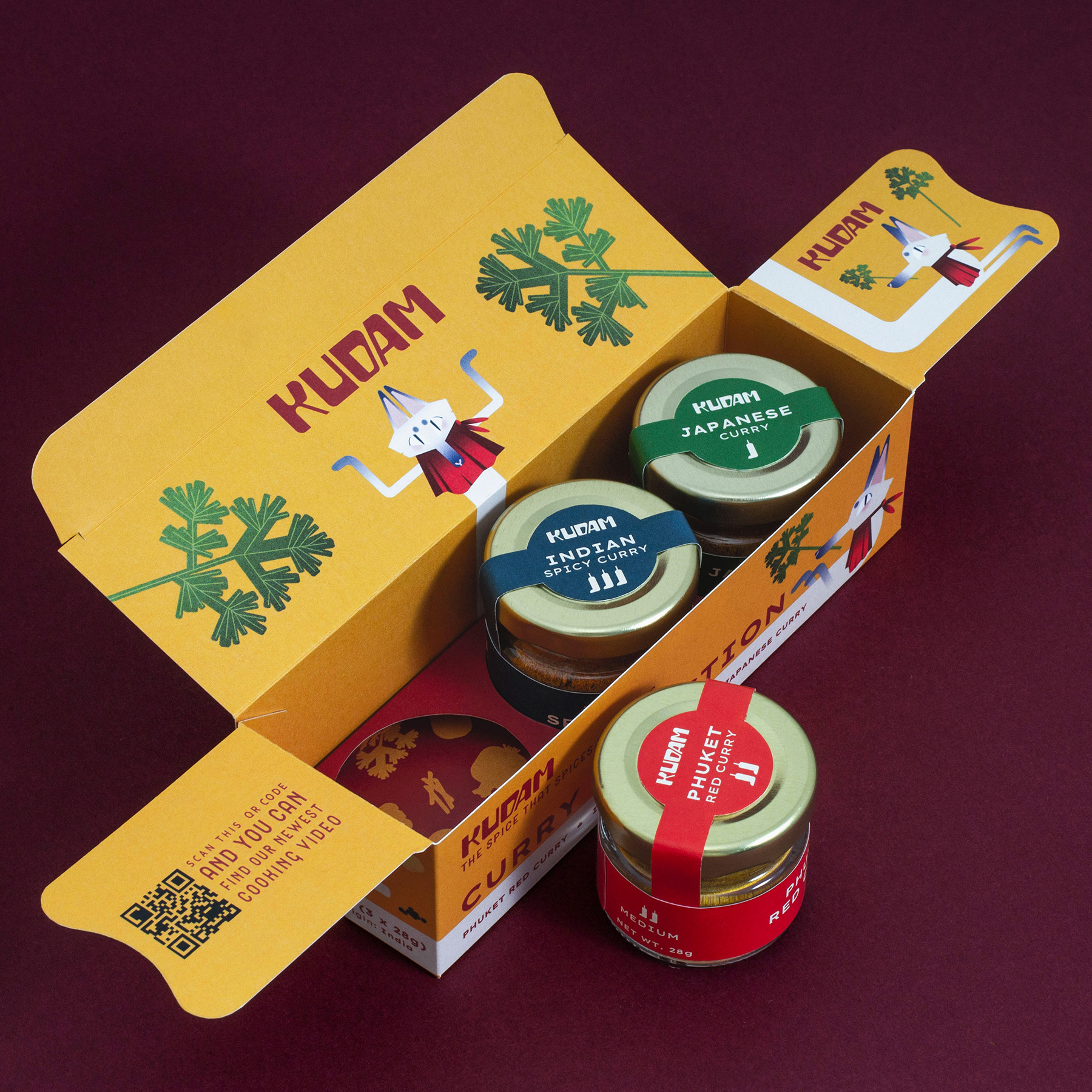 The Kudam packaging holds three unique curry spice blends: Phuket Red, Indian, and Japanese curry mixes that are sure to brighten your day. My aim was to create a bold, youthful, and eye-catching identity that speaks to those curious about the flavors of the world. Vibrant colors and dynamic illustrations capture the spirit of all three cultures, adding a playful and energetic touch to the brand. This concept invites you to forget time and space for a moment—and take a seat at the table of another culture. The packaging brings the thrill of discovery and the joy of travel closer to home for those eager to explore new taste experiences. Be bold, awaken your taste buds – Curry ON and taste the world!