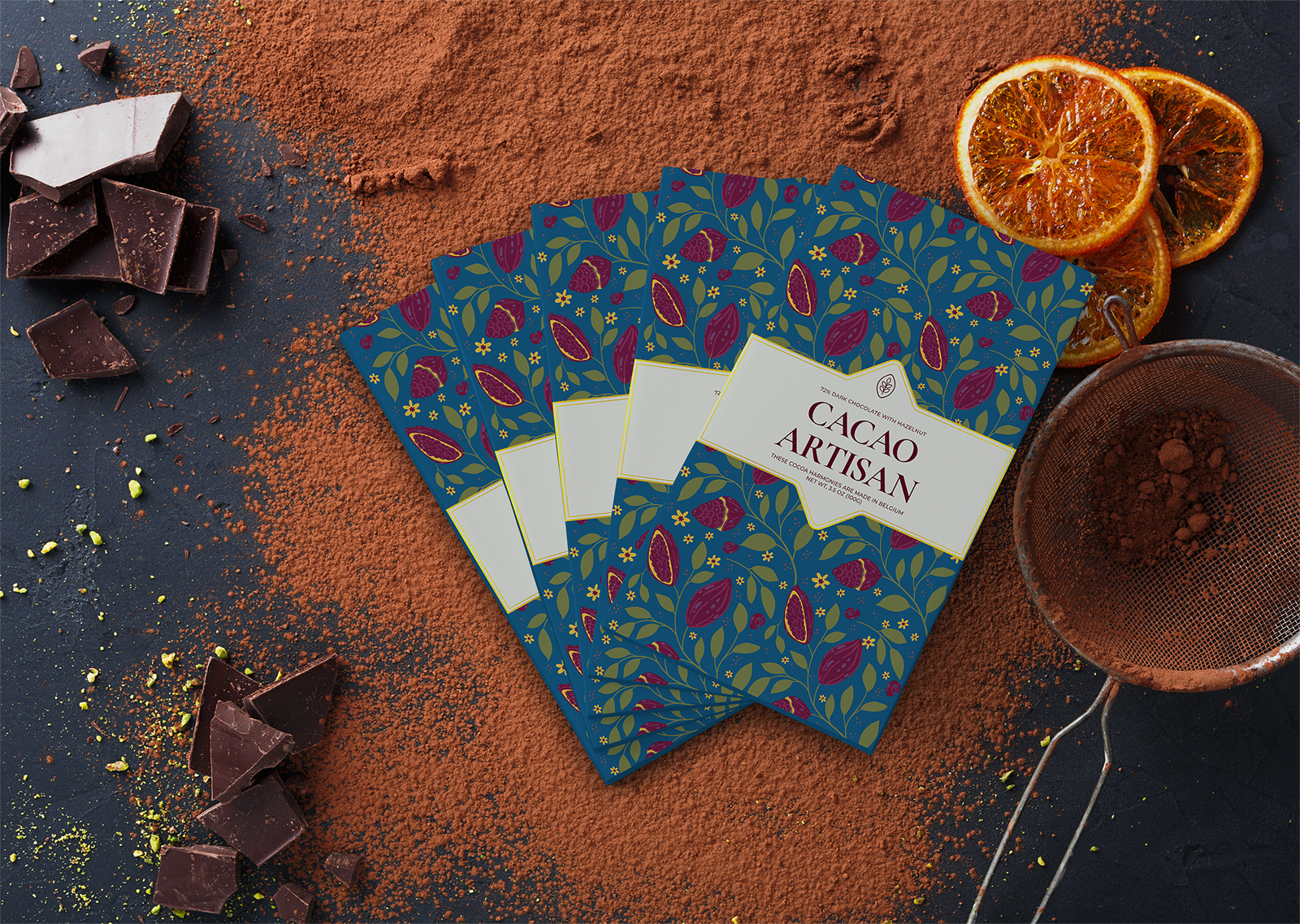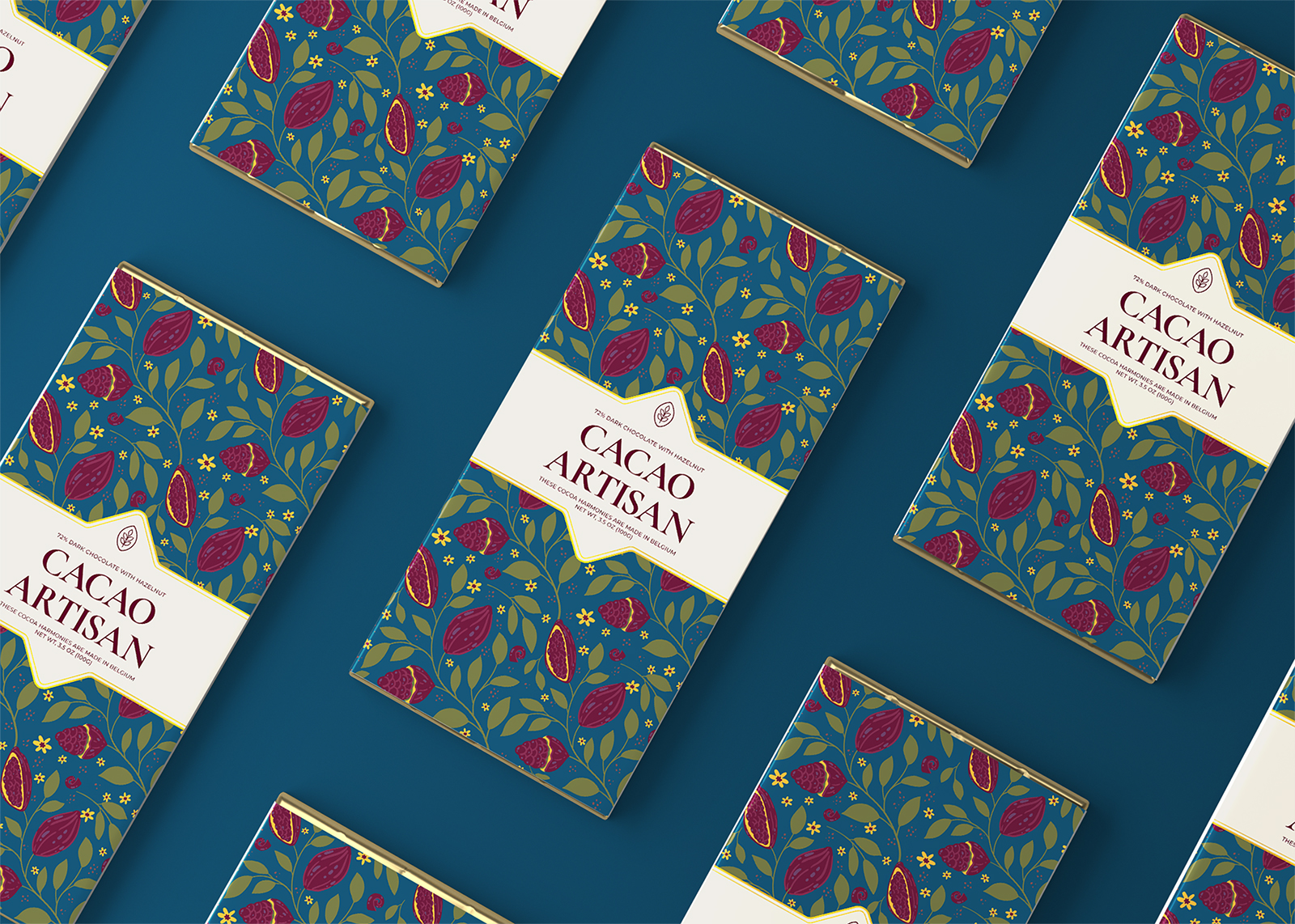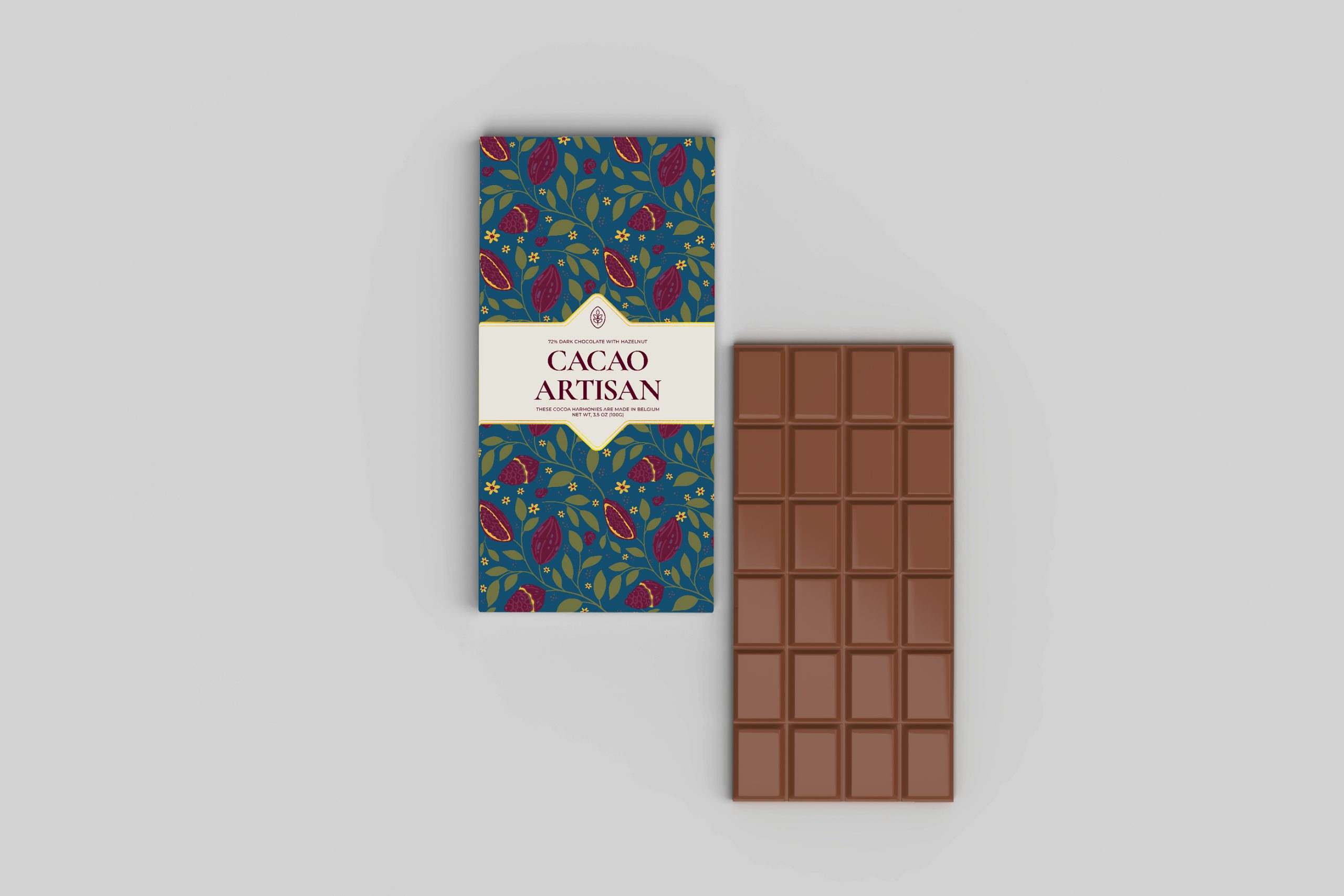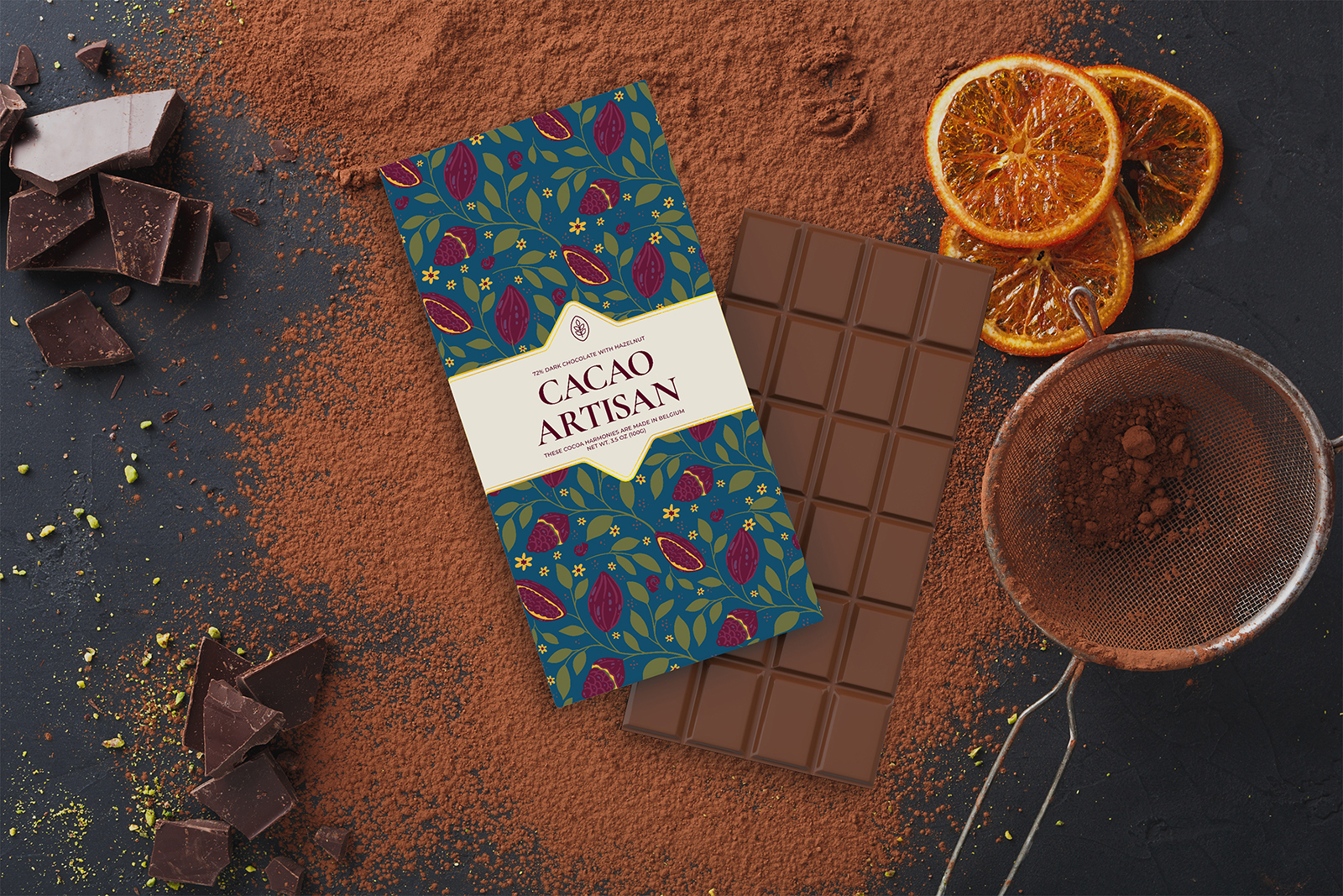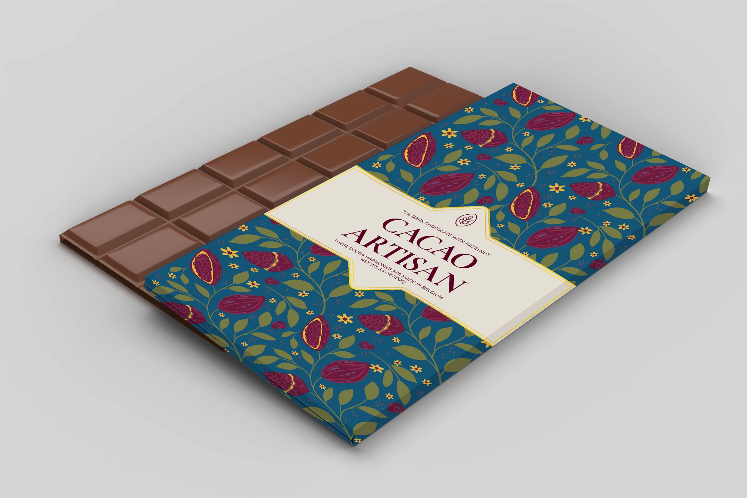 The chocolate packaging design, as described below, is premium; its full-wrap format design is classic, while the hand-drawn layout that includes cacao pods and leaves gives it a natural and artisanal feel. The typeface Cormorant Garamond, which was selected with luxury in mind, is an elegant modern take on a traditional serif font, allowing for a timeless feel almost anywhere in the layout. This packaging design works well for any premium gourmet or artisan chocolate brand where quality, craftsmanship, and artistic sophistication take precedence.
