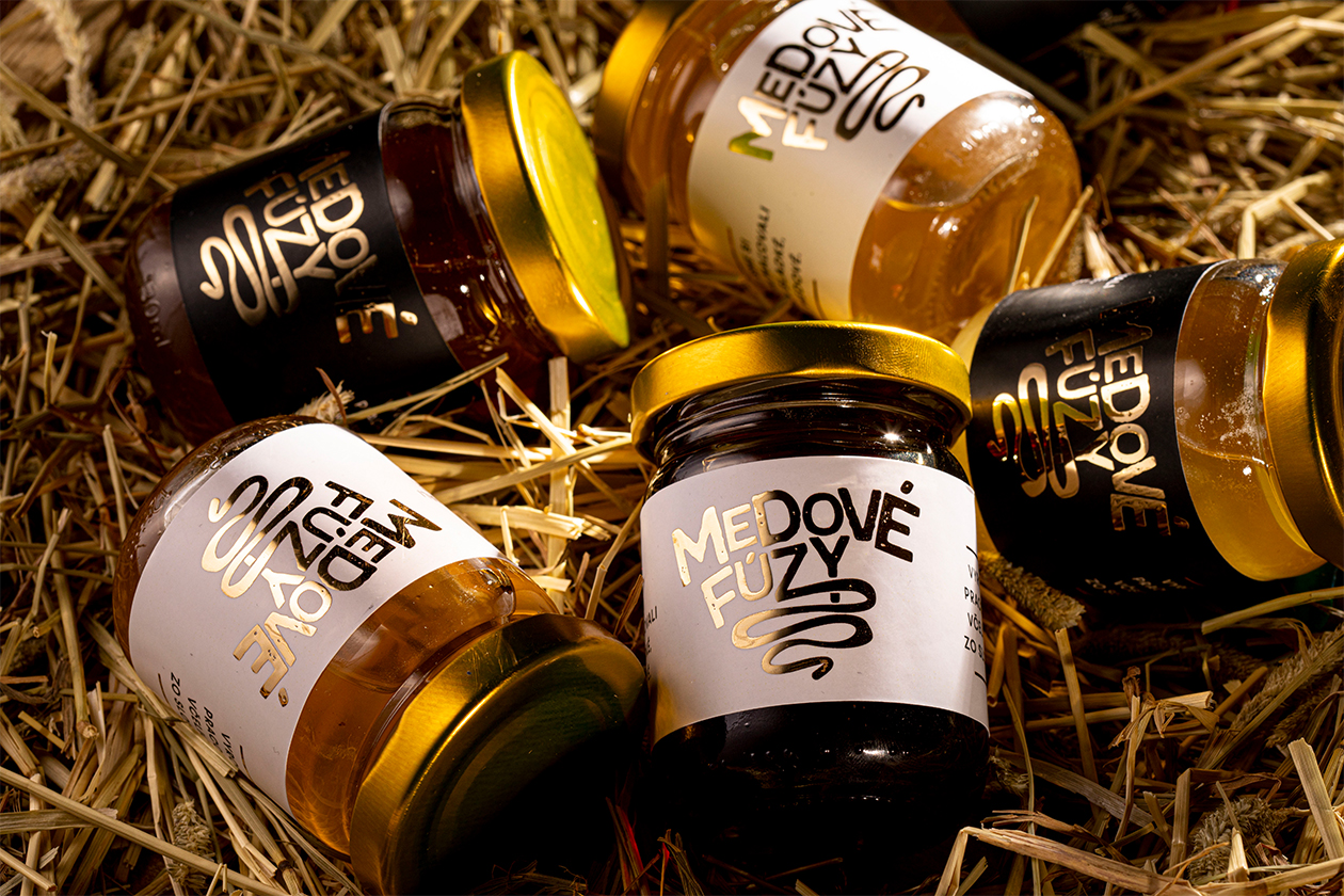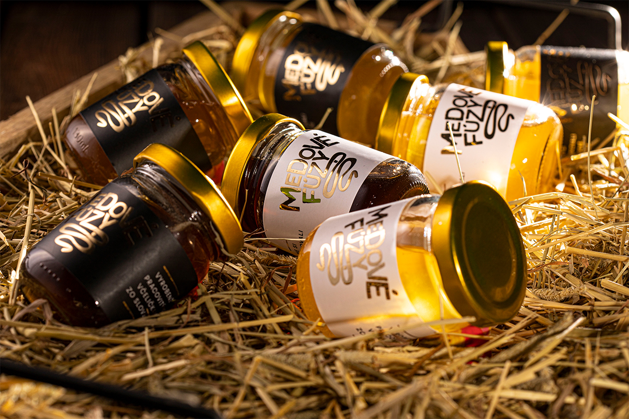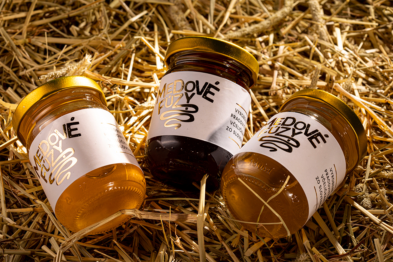 The rustic glass bottle format paired with straw presentation reinforces small-batch authenticity and local Slovak apiary sourcing. By humanizing honey with whimsical facial hair branding, Medové Fúzy appeals to younger consumers seeking artisanal food gifts and premium pantry staples that spark conversation.
