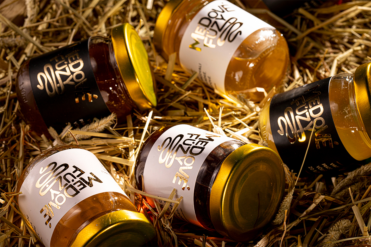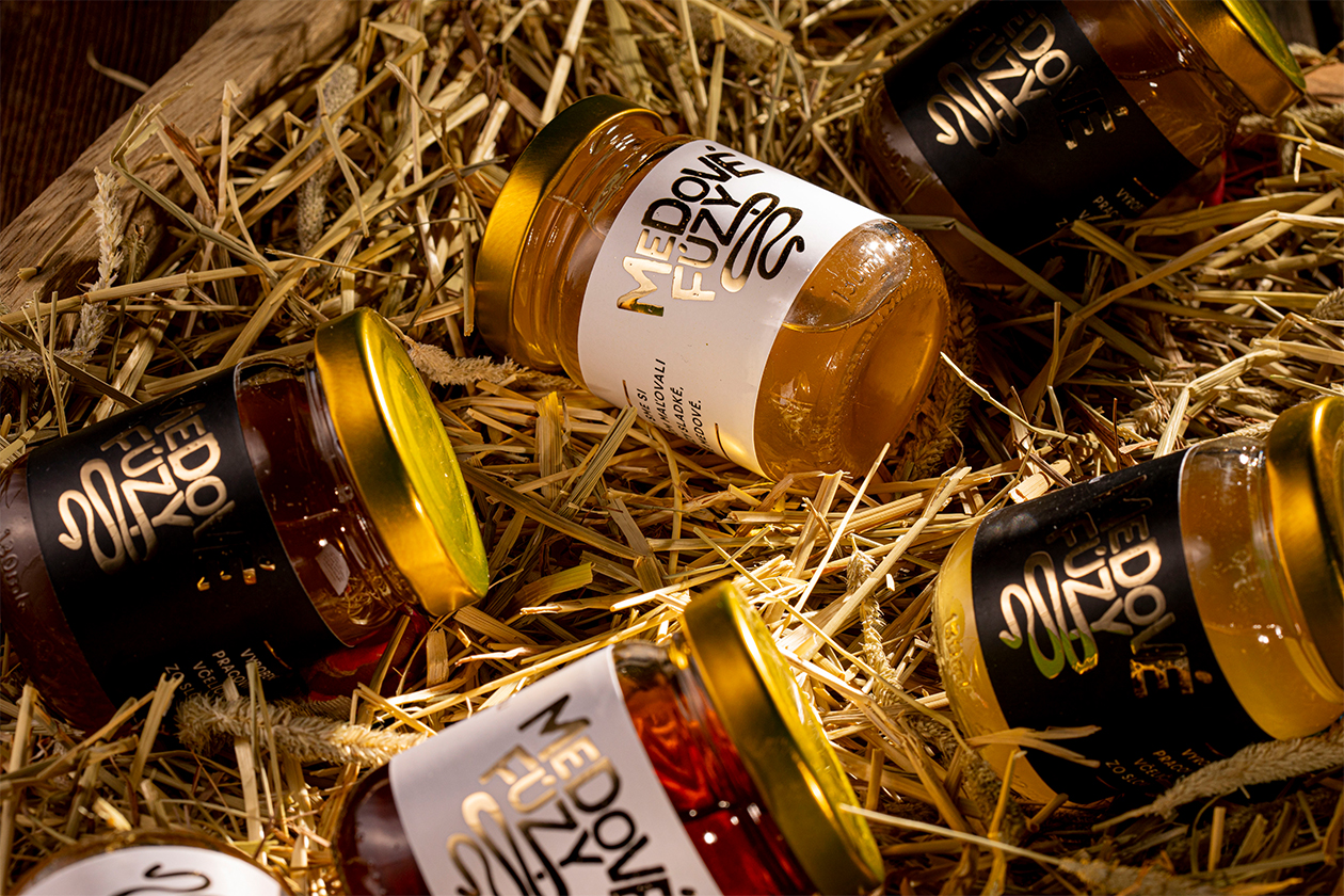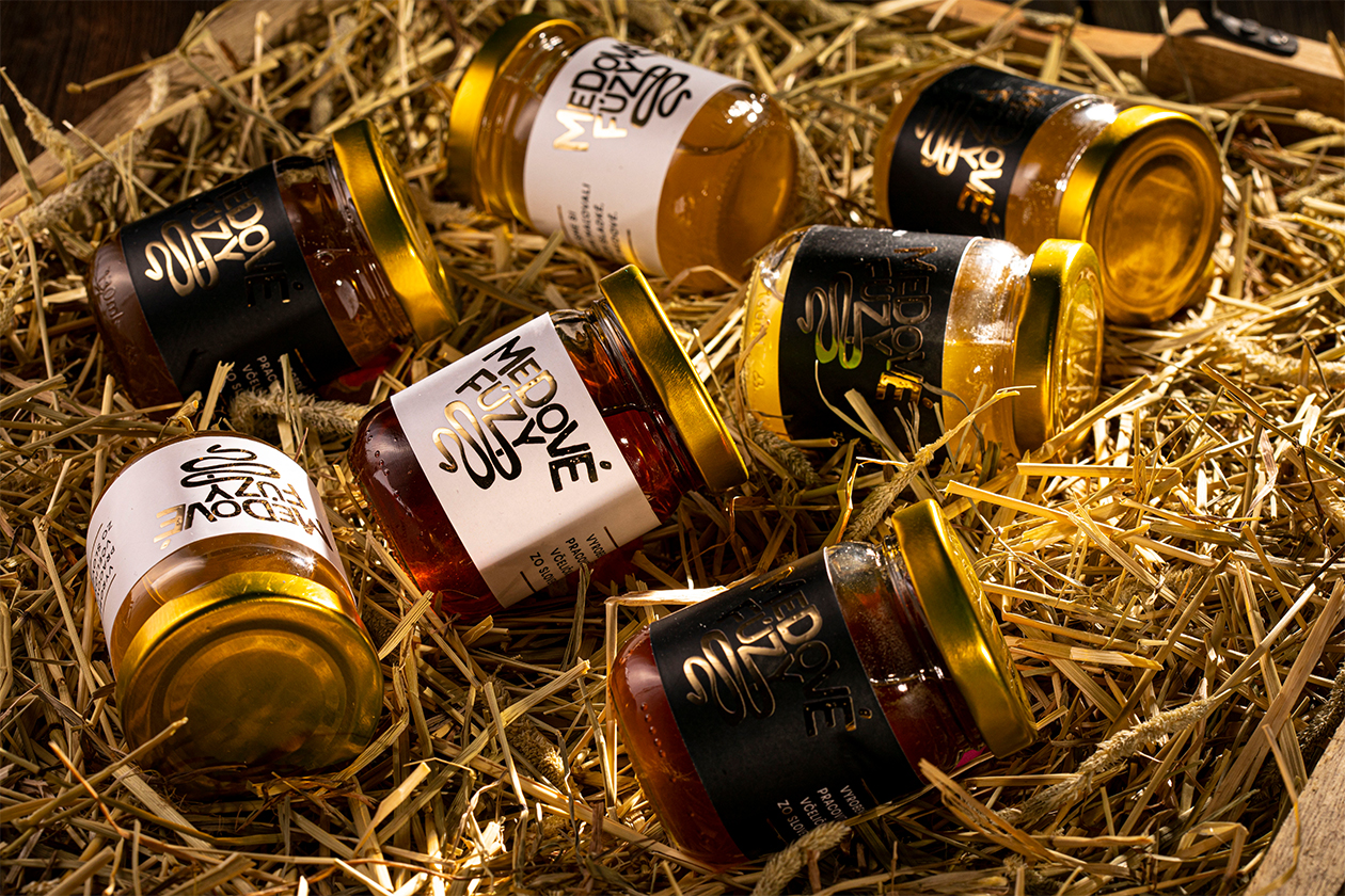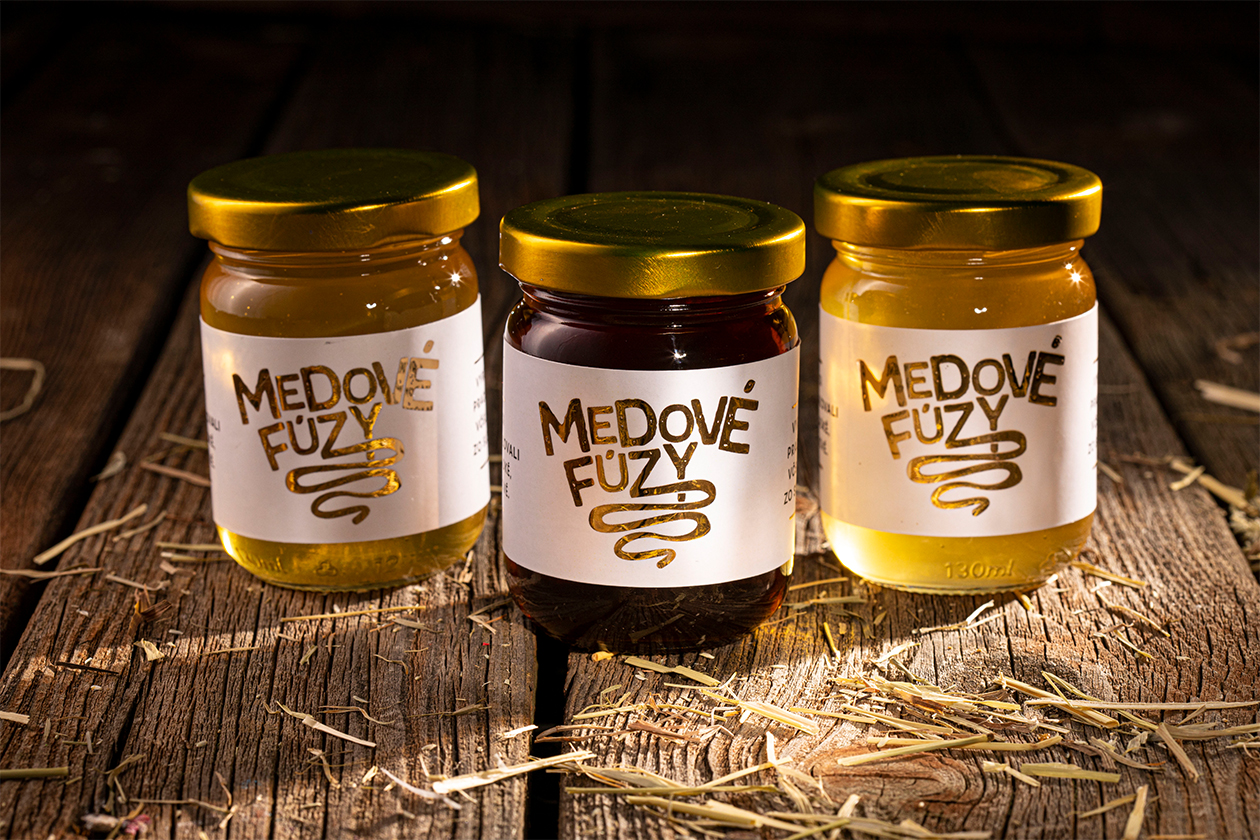 The rustic glass bottle format paired with straw presentation reinforces small-batch authenticity and local Slovak apiary sourcing. By humanizing honey with whimsical facial hair branding, Medové Fúzy appeals to younger consumers seeking artisanal food gifts and premium pantry staples that spark conversation.