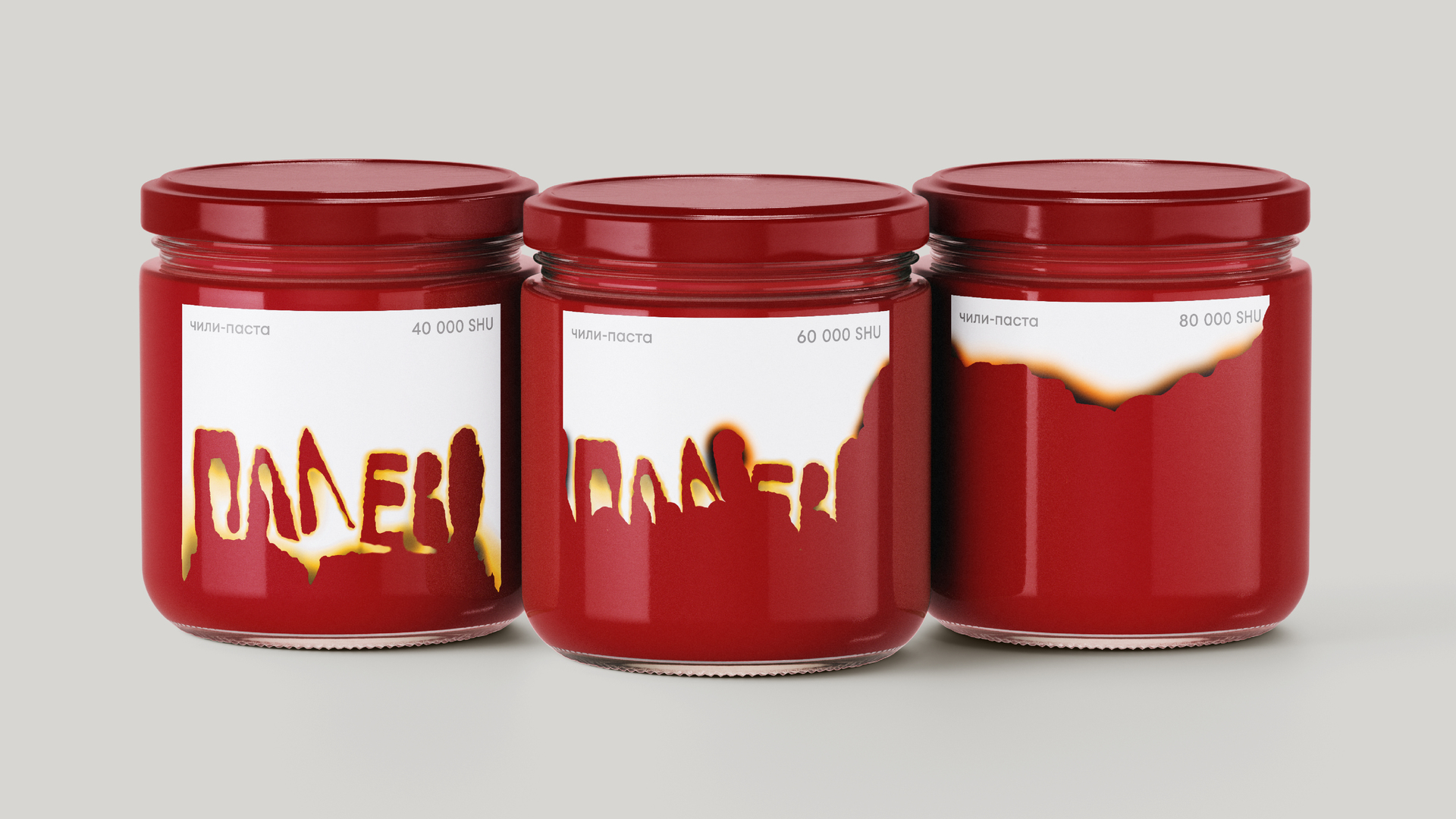 The project is based on the Russian slang interjection “палево (palevo),” which became the core concept for a chili paste packaging. The logo changes according to the heat level (SHU), gradually “burning” to visually express the intensity of the flavor.