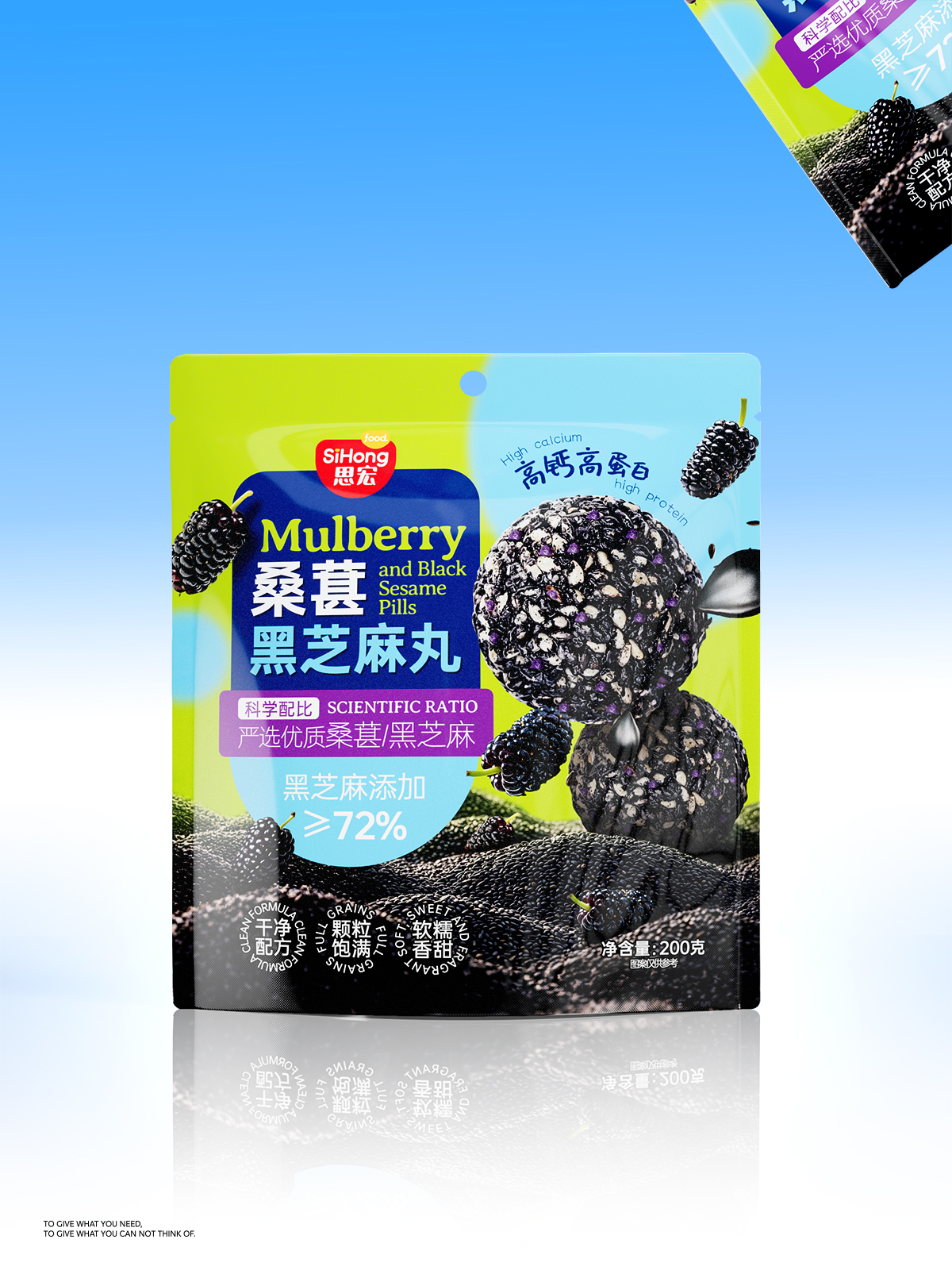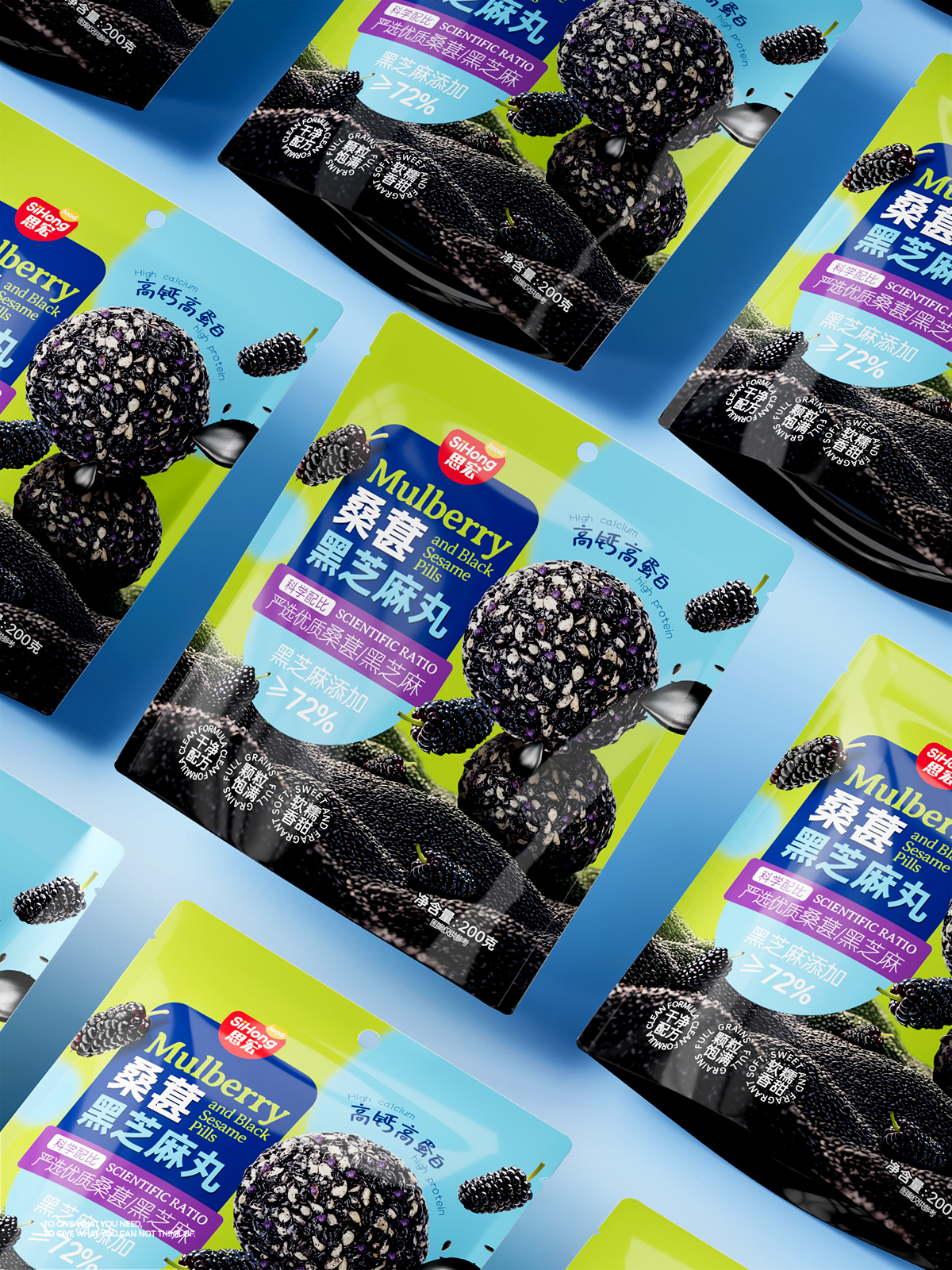 The overall design uses a contrasting color scheme from bright green to light blue to convey a natural and healthy feel. The packaging visually presents fresh mulberries and plump sesame balls, directly showcasing the advantages of “carefully selected high-quality mulberries/black sesame seeds.” It also highlights the core selling points of “scientific formulation” and “≥72% black sesame addition,” reinforcing the nutritional solidity. The “high calcium, high protein” directly addresses functional health needs. Through a multi-dimensional sensory experience of “clean formula, plump balls, soft, chewy, and sweet,” the design comprehensively builds product trust and appeal from raw materials to taste.