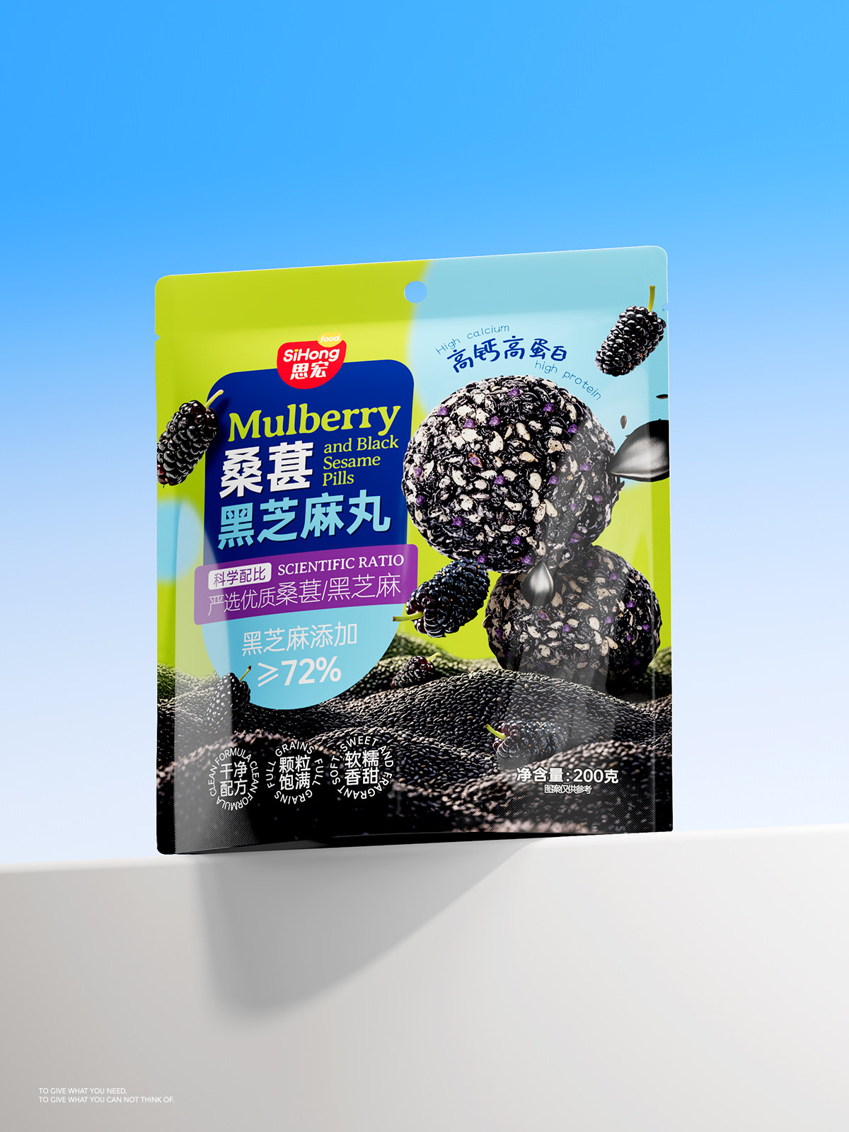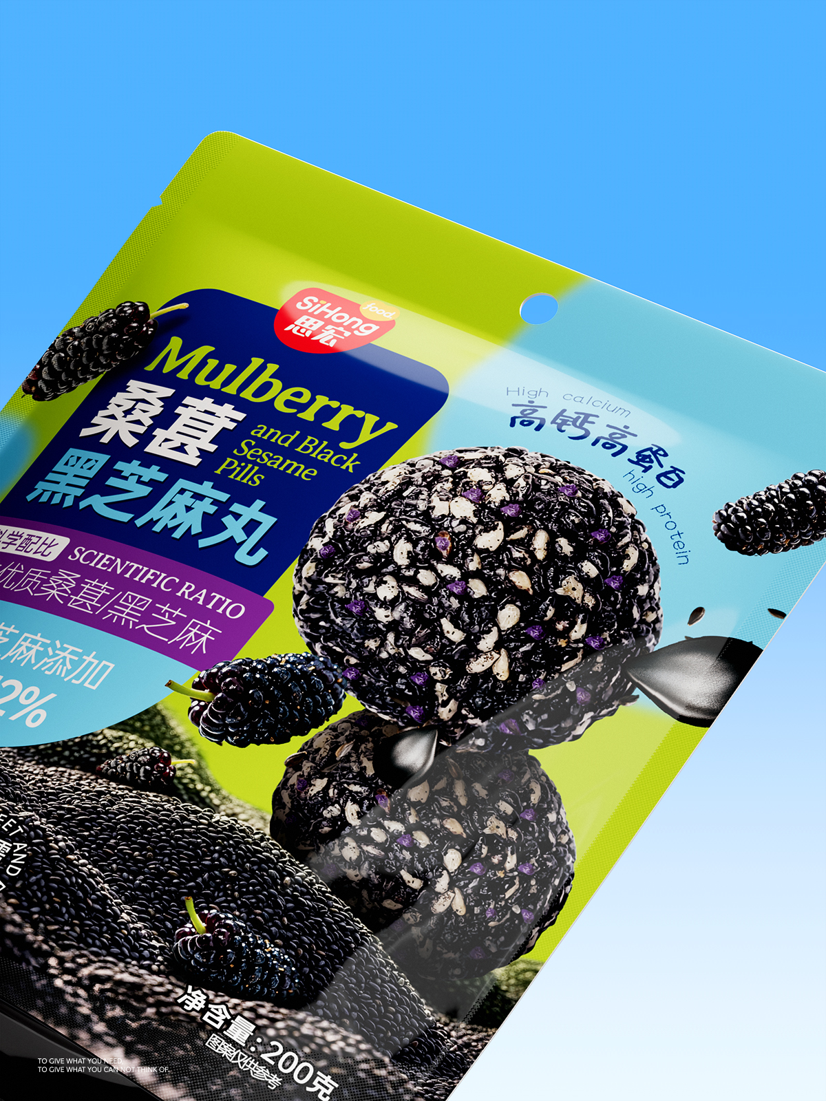 This is our design for Sihong’s “Mulberry Black Sesame Balls,” a product positioned as a healthy snack. The design continues the modular top-level packaging system, powerfully conveying the product’s core values of “scientific nutrition” and “high-quality ingredients” through clear information hierarchy and intuitive data presentation.