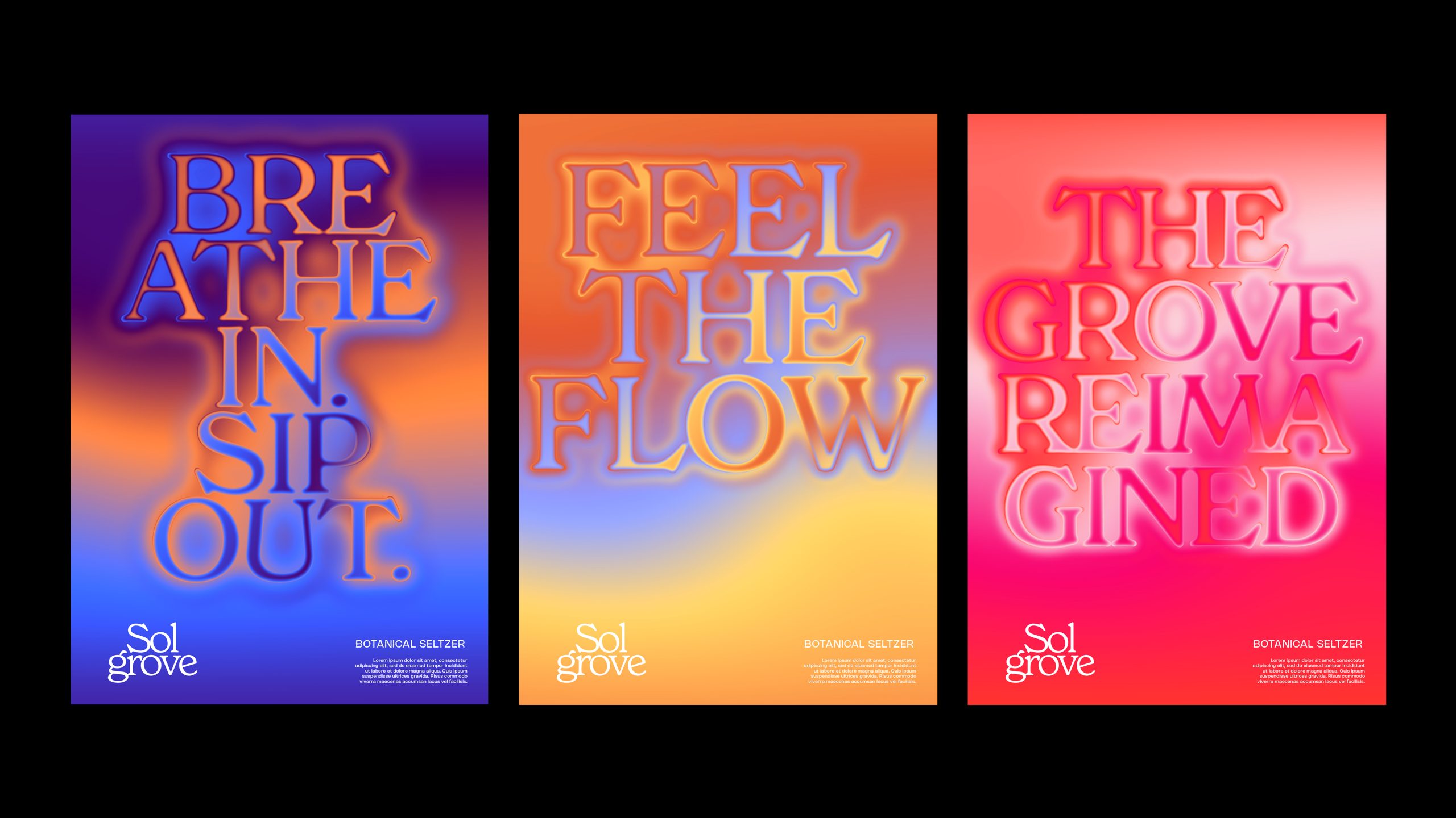 Sol Grove is a botanical seltzer brand designed around a single idea: the energy inside you has a color, a rhythm, and a flow. Inspired by the thermal impressions and heat maps of the human body, Sol Grove translates internal vitality into an expressive visual identity system built on radiant gradients, glowing typography, and modern sensory design.