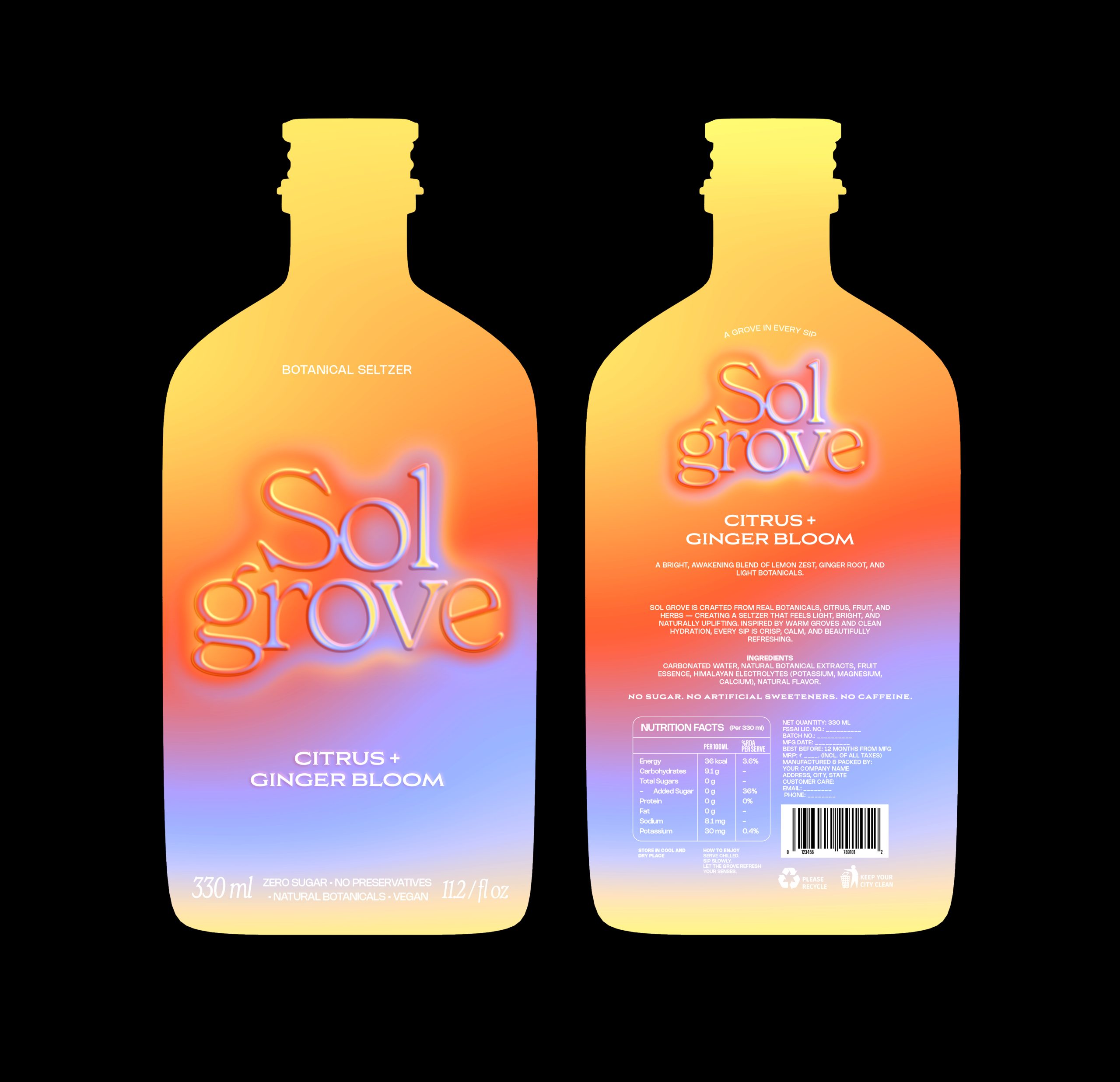 The result is a packaging system that feels alive, expressive, and deeply connected to human experience. Sol Grove is not just a beverage; it is a sensory interpretation of energy.