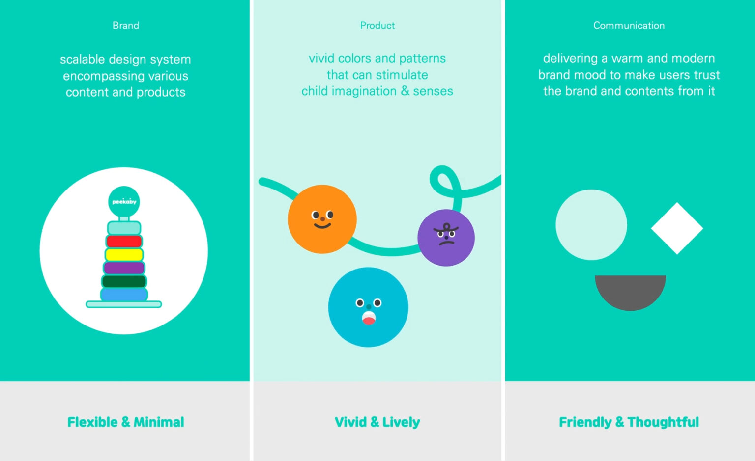 Peekaby’s design principles are ‘Flexible and Minimal, Vivid and Lively, Friendly and Thoughtful.’ Those are derived from the established brand’s core values: infinity, joy, and trust. They create a consistent brand identity that applies to the visual expression from product design to brand application.
