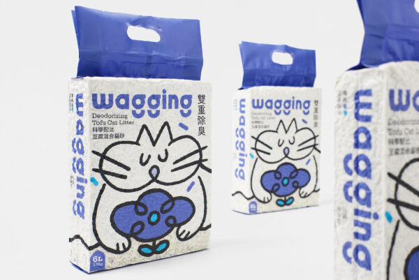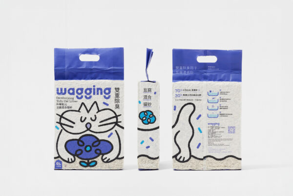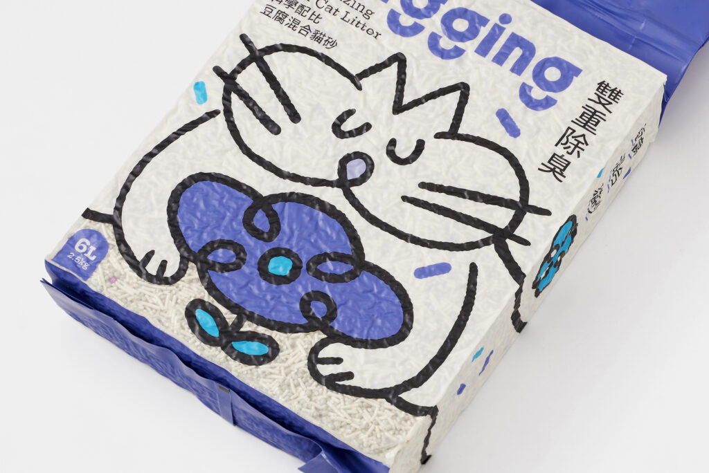As the inaugural product of the brand, the visual design on the compact 6-liter tofu litter packaging emphasizes both the brand’s character and the product itself. Utilizing simple and playful line illustrations, a large white cat is depicted stretching and scratching on the litter, with the character extending from the flat surface to a three-dimensional representation, enveloping half of the package in a lazy and comfortable posture. The circular window at the bottom allows consumers to directly view the physical cat litter, facilitating a tangible interaction between the cat and the product.