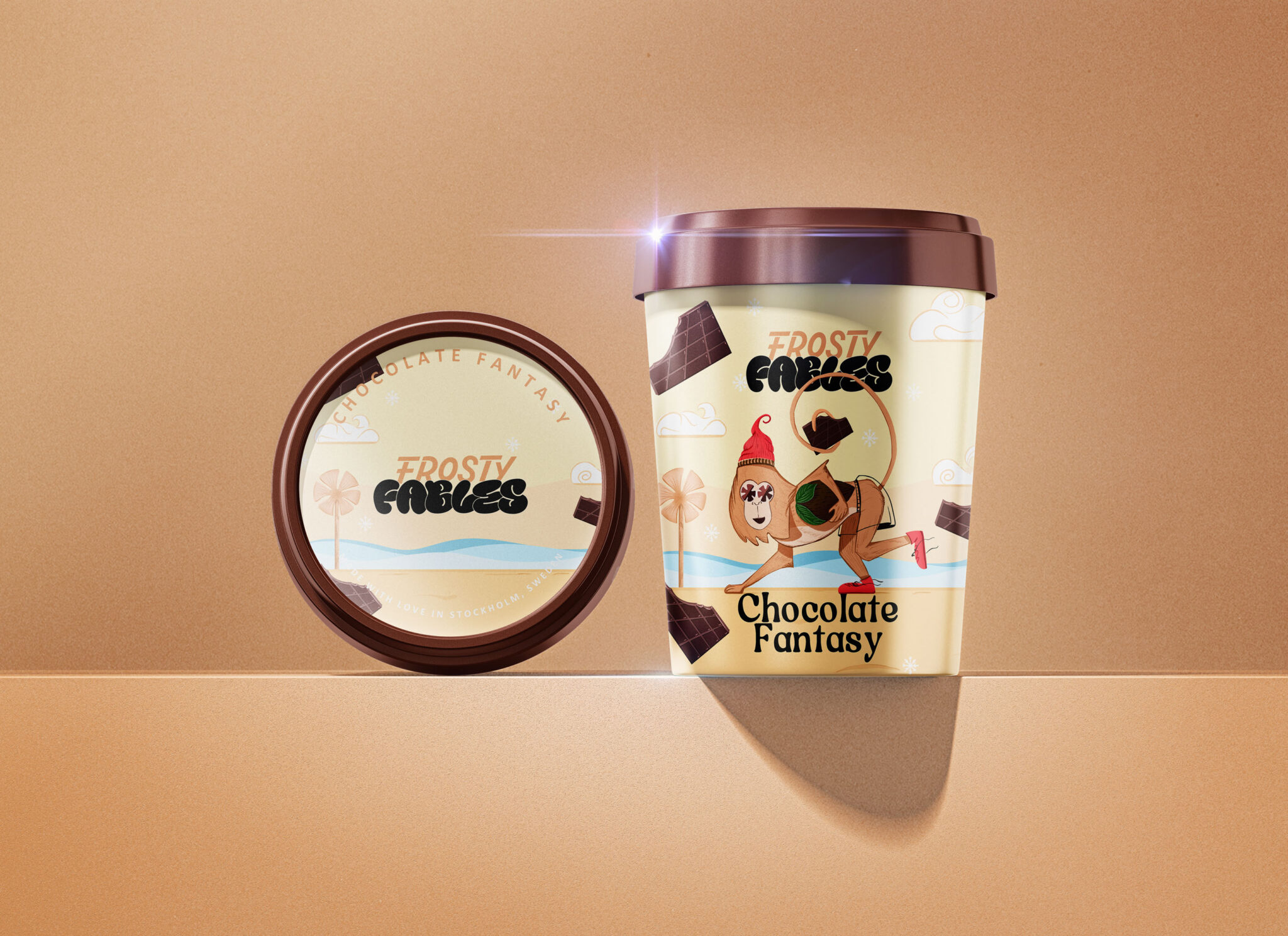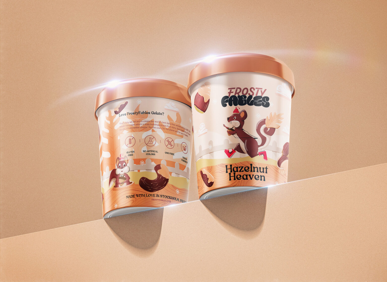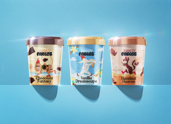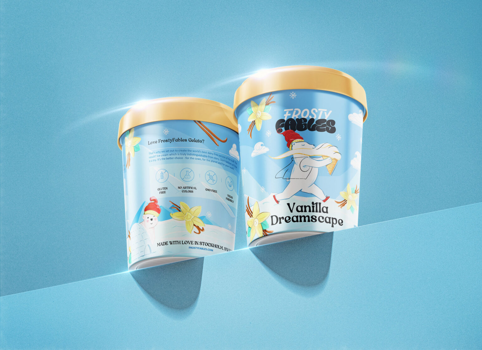 Design Challenge: Our challenge was to capture the essence of Frosty Fables’ whimsical storytelling while communicating the vegan-friendly nature of our oat milk-based ice cream. We aimed to create packaging that not only stood out but also transported customers into a world of wonder and delight.