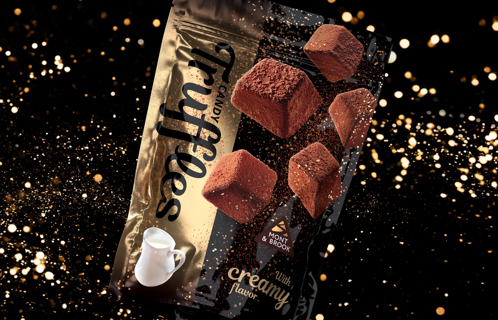 The design of the TRUFFLES packaging is aimed at attracting the attention of truffle lovers. This popular dessert is well known even to inexperienced buyers. Thanks to staged macro photography, the characteristic texture of cocoa is clearly visible in the photo. Small particles of powder float in the air, emphasizing the dynamic composition of the frame, and the chocolates, beautifully illuminated by bright backlighting, create an appetizing image of the product.