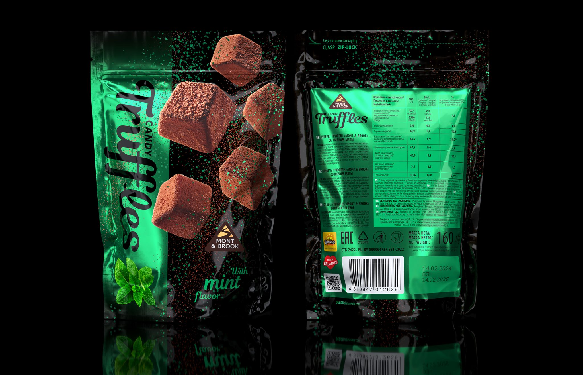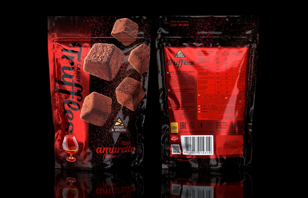 The laconic logo “MONT END BROOK” for the manufacturer and the attractive elegant trademark “TRUFFLES” took their rightful places in the composition. The line contains four types of candies with the flavors “orange”, “creamy”, “mint” and “amaretto”. The corresponding illustrations are located in the left corner of the package. For quick identification, each type has a bright signal color.