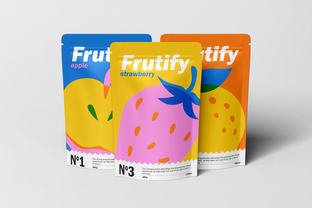 The lemon pouch, for example, pairs a bright orange background with yellow, green, and blue. This unexpected palette makes it feel fresh and stands out from typical fruit-based packaging, which often sticks to safe, muted tones.