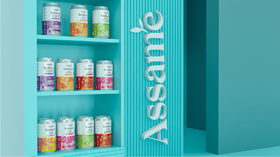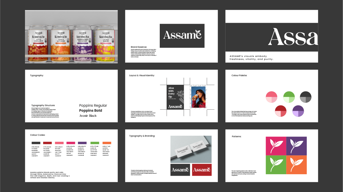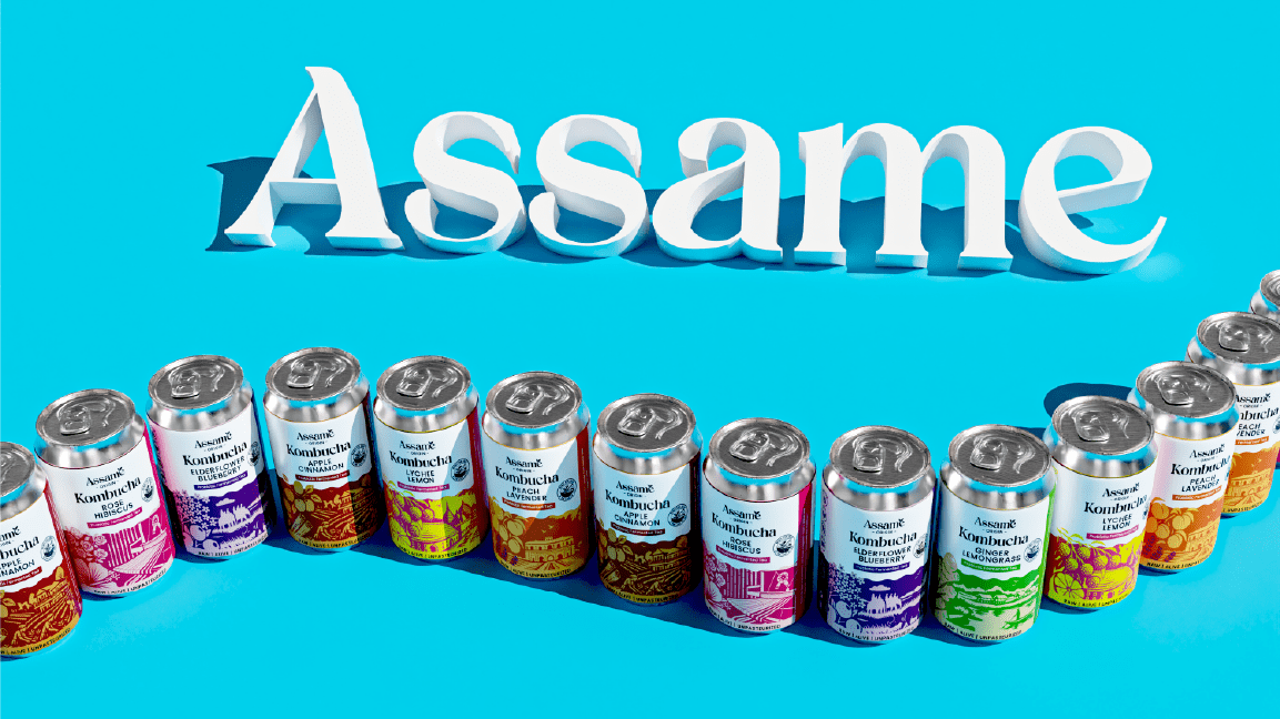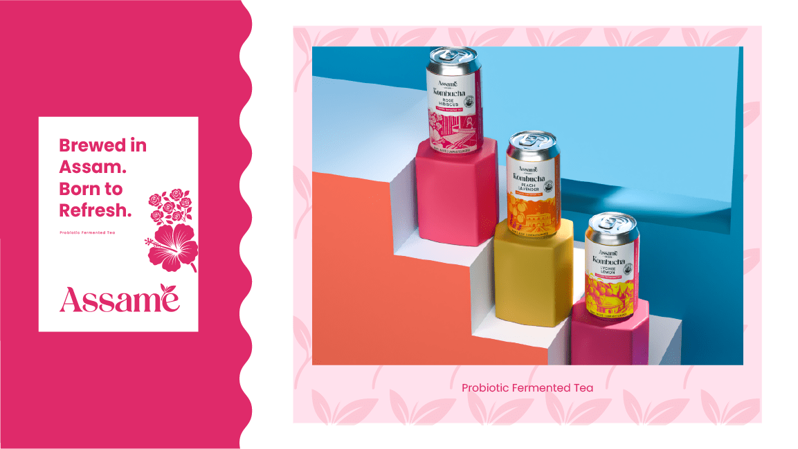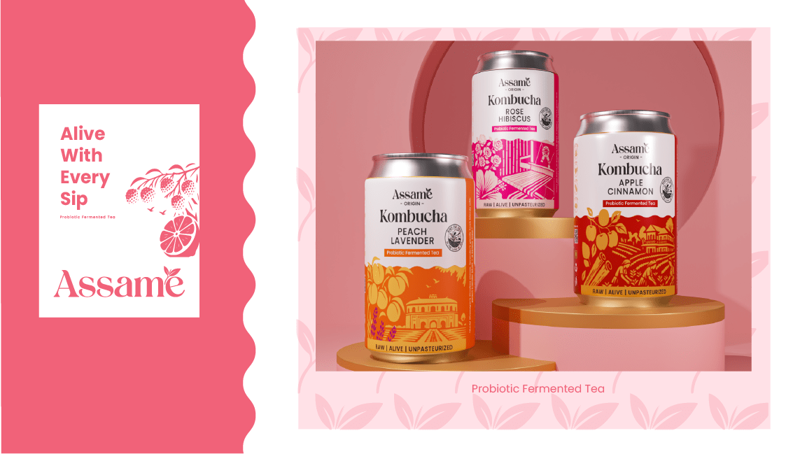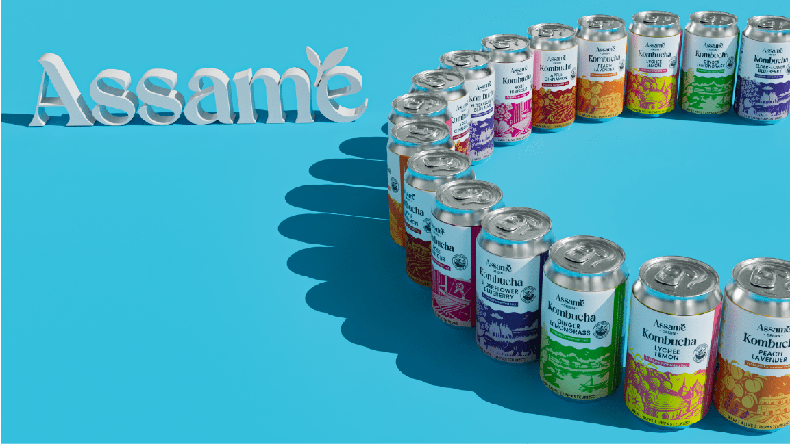 Assame is a premium Kombucha drink brand inspired by the rich tea heritage of Assam. For this project, we developed the complete branding, identity, and packaging design to capture the essence of Assam’s natural freshness and cultural depth. The brand reflects a perfect fusion of tradition and modern wellness, showcasing Assam’s authenticity while appealing to today’s health-conscious consumers. The design language draws from the lush tea gardens, local artistry, and earthy tones of the region, translated into a clean and contemporary visual identity. Through thoughtful storytelling and packaging, Assame positions itself as a refreshing, authentic, and culturally rooted Kombucha brand that celebrates the spirit and purity of Assam.