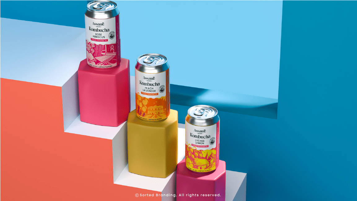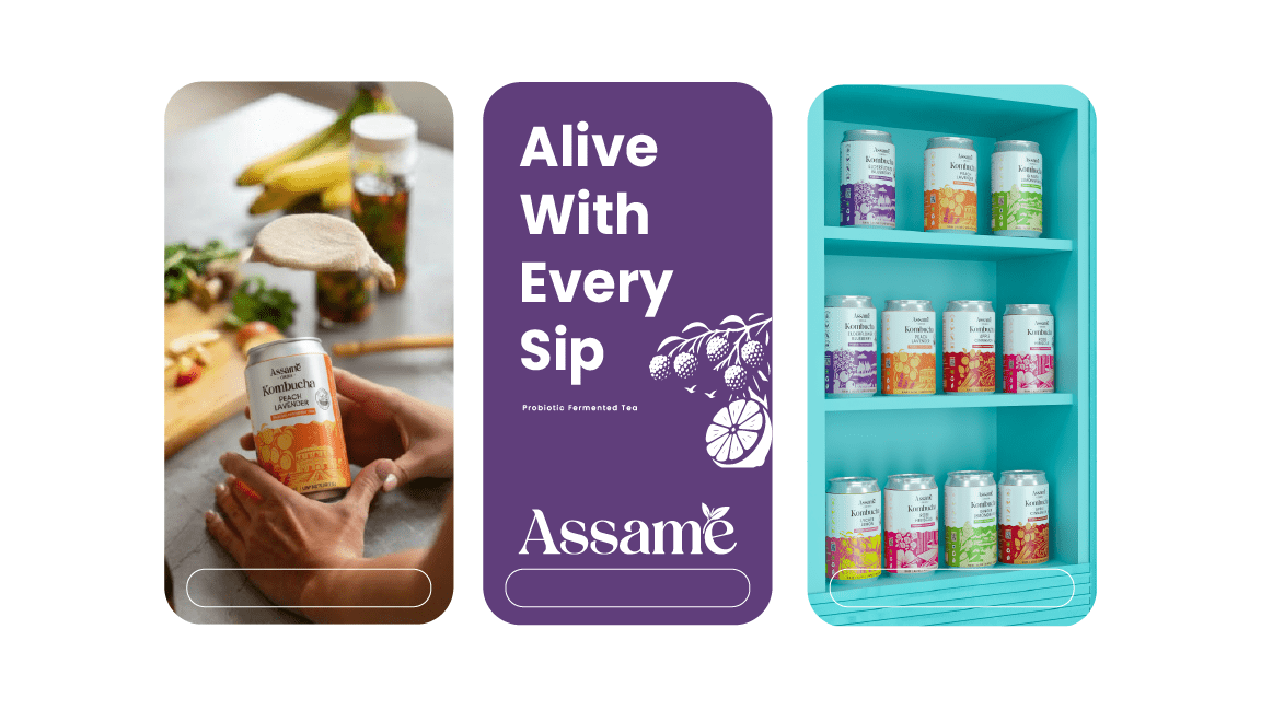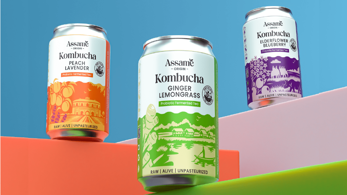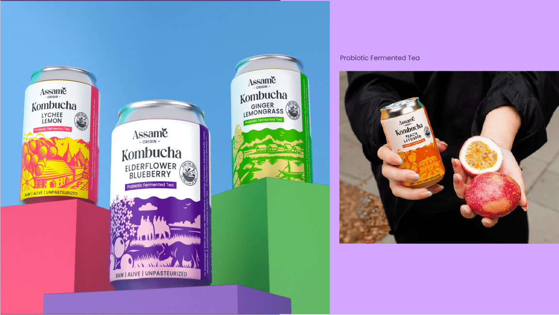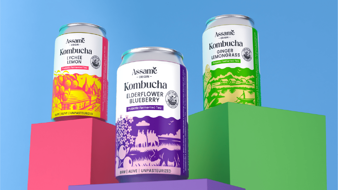 Assame is a premium Kombucha drink brand inspired by the rich tea heritage of Assam. For this project, we developed the complete branding, identity, and packaging design to capture the essence of Assam’s natural freshness and cultural depth. The brand reflects a perfect fusion of tradition and modern wellness, showcasing Assam’s authenticity while appealing to today’s health-conscious consumers. The design language draws from the lush tea gardens, local artistry, and earthy tones of the region, translated into a clean and contemporary visual identity. Through thoughtful storytelling and packaging, Assame positions itself as a refreshing, authentic, and culturally rooted Kombucha brand that celebrates the spirit and purity of Assam.