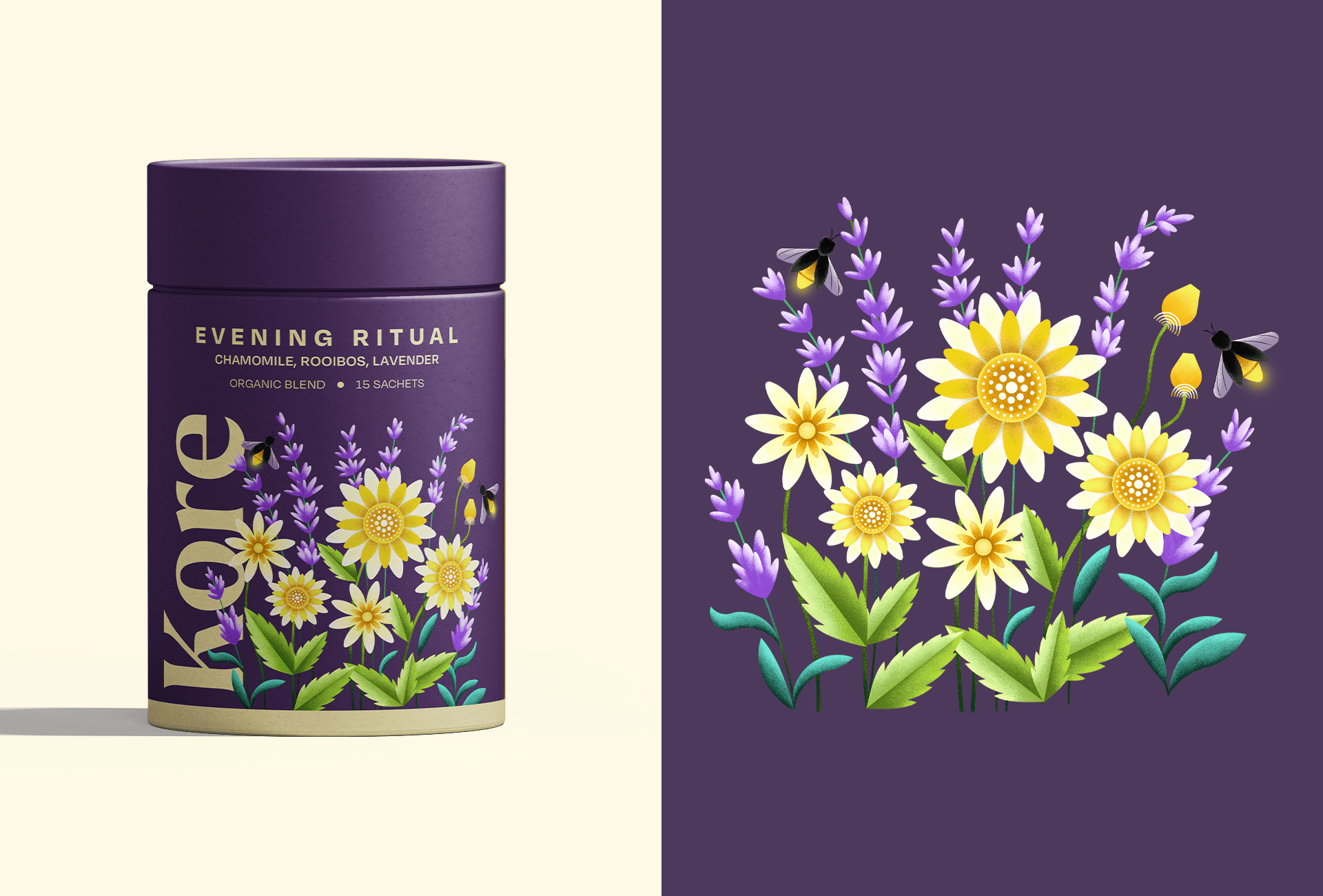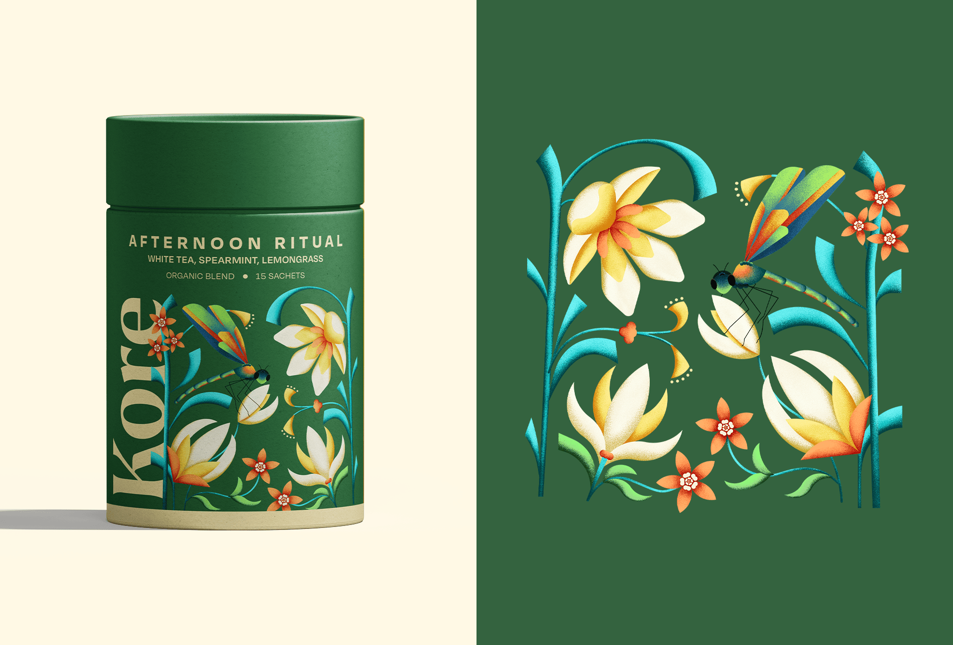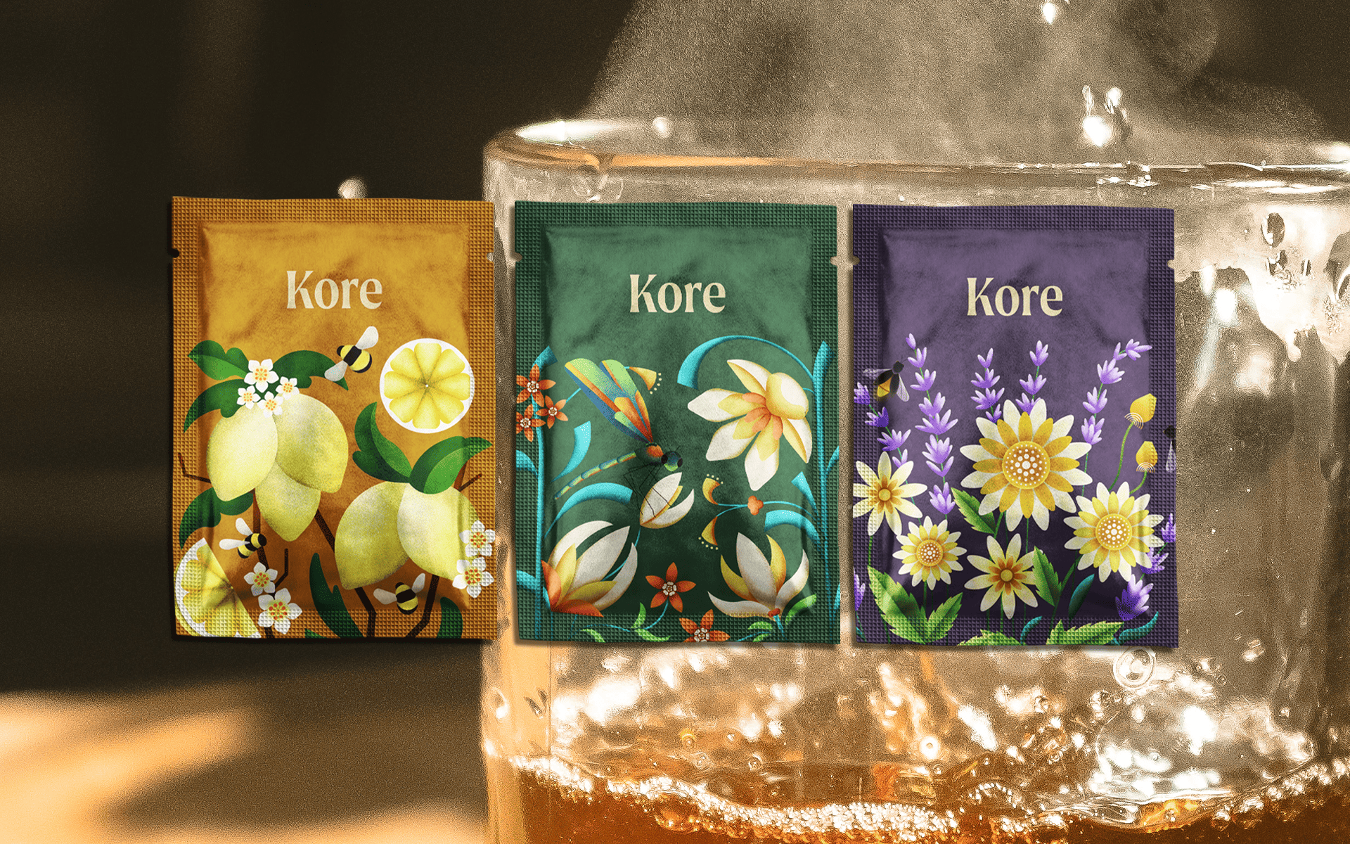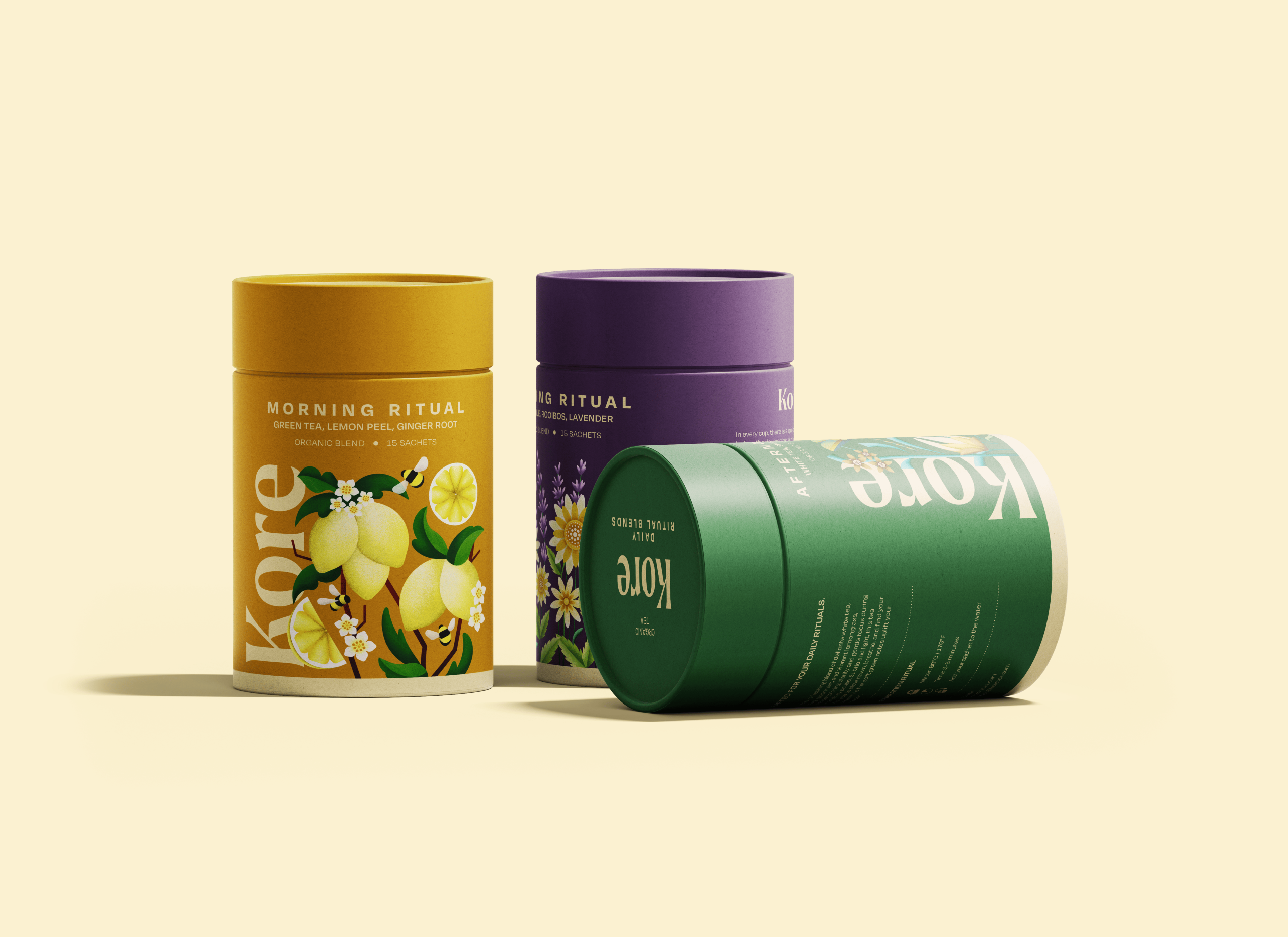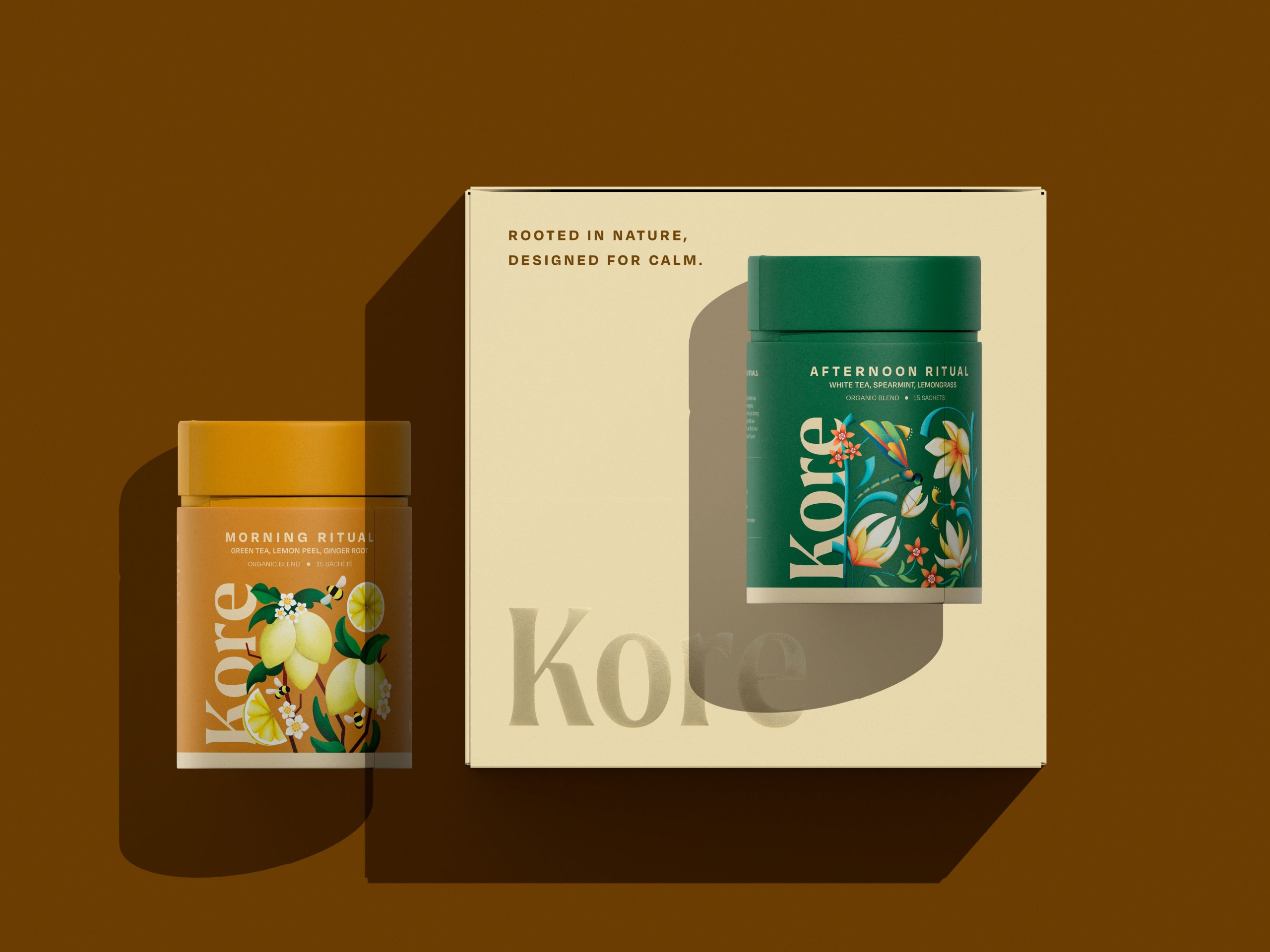 Kore is an organic tea brand that offers intentionally crafted blends, using natural and carefully selected ingredients. Designed to support calm, clarity, and presence throughout the day, the brand positions itself as a ritual for those seeking a slower and more conscious lifestyle. We created a minimal, nature-inspired design that aligns with the brand’s personality, valuing simplicity, transparency, sustainability, and respect for the rhythms of the earth.