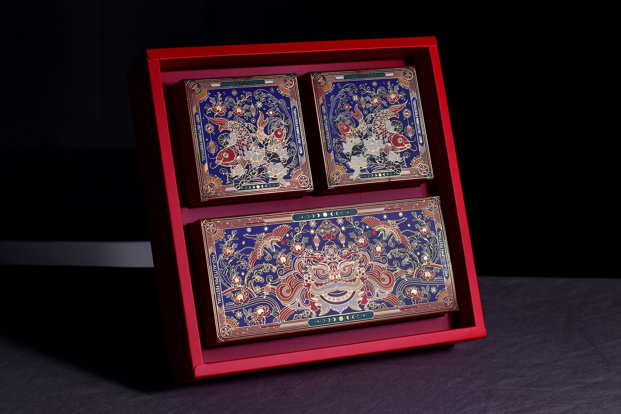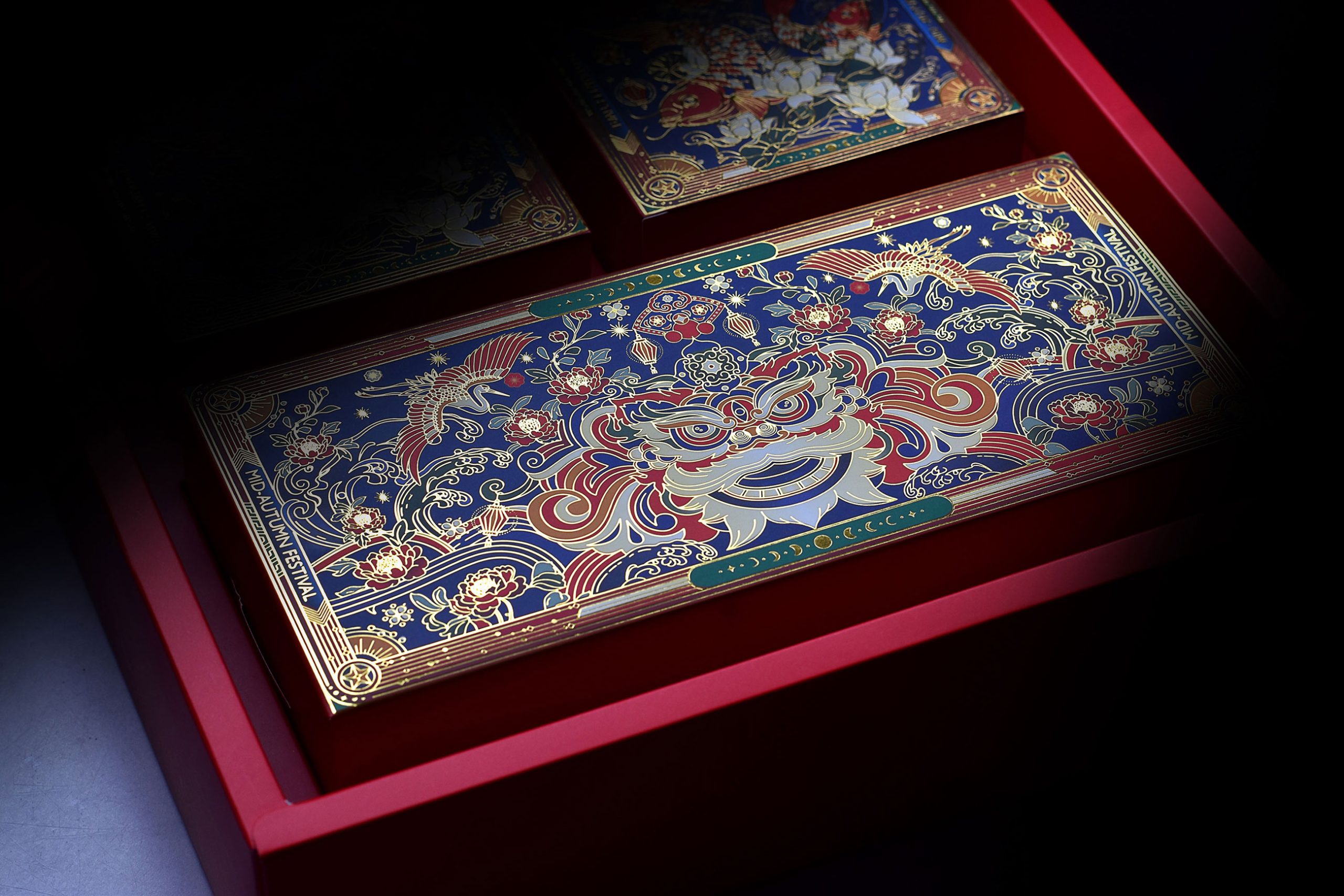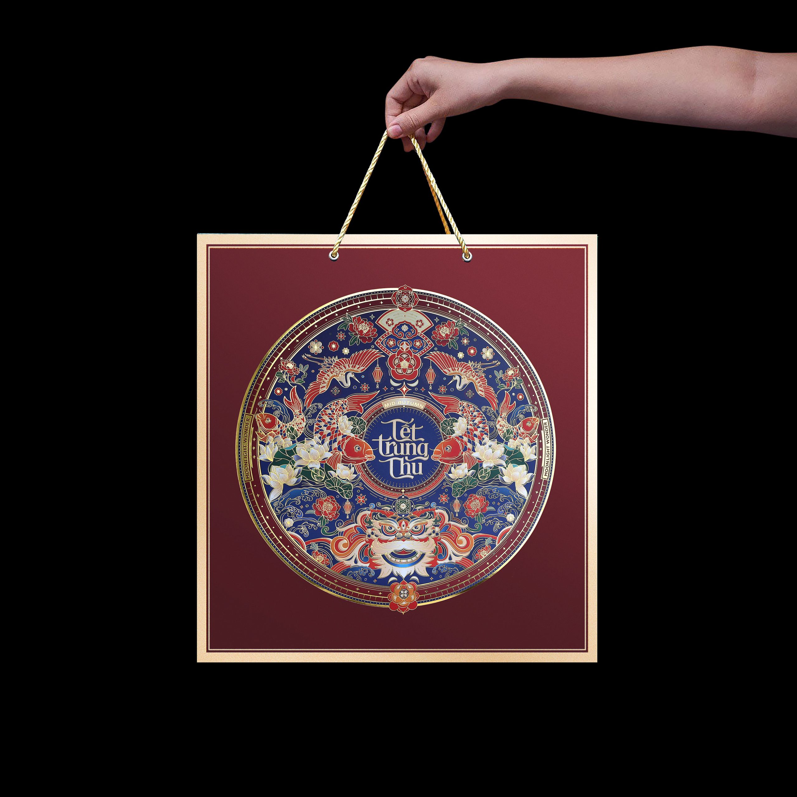 The “Lân Vũ” Mid-Autumn Festival packaging embodies the spirit of Vietnamese tradition with refined depictions of the lion, crane, peony flowers, and carp, harmoniously integrated into the design. Against a striking deep blue background, vibrant red and orange details create strong contrast, evoking a festive and joyful atmosphere. At the center, the lion’s head symbolizes happiness, good fortune, and family reunion during the Mid-Autumn celebration. The crane and carp are gracefully arranged, representing elegance, prosperity, and endurance, while blooming peonies highlight a sense of regal beauty and auspiciousness.