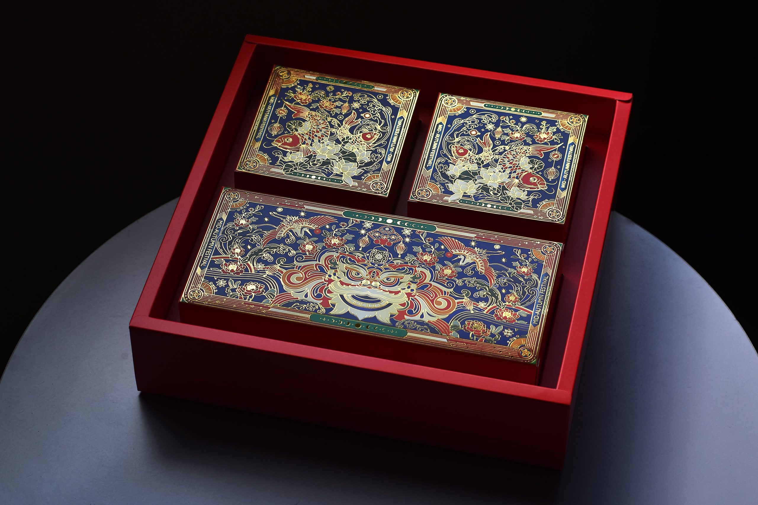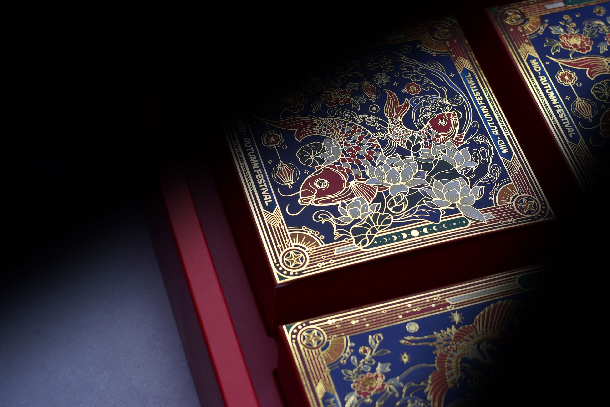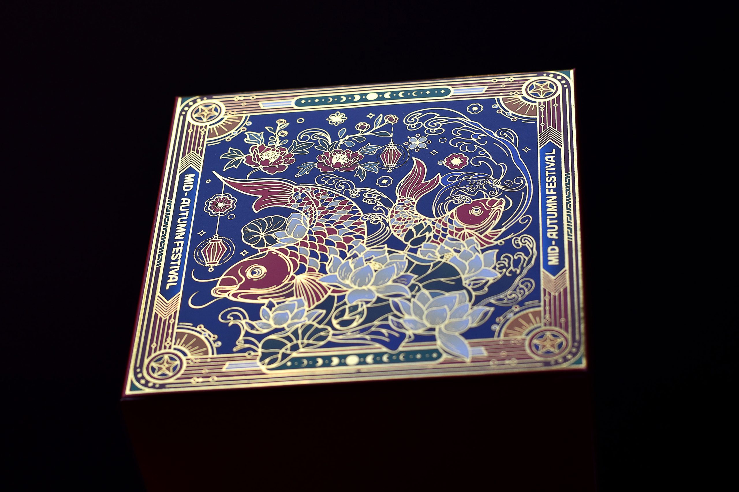 The “Lân Vũ” Mid-Autumn Festival packaging embodies the spirit of Vietnamese tradition with refined depictions of the lion, crane, peony flowers, and carp, harmoniously integrated into the design. Against a striking deep blue background, vibrant red and orange details create strong contrast, evoking a festive and joyful atmosphere. At the center, the lion’s head symbolizes happiness, good fortune, and family reunion during the Mid-Autumn celebration. The crane and carp are gracefully arranged, representing elegance, prosperity, and endurance, while blooming peonies highlight a sense of regal beauty and auspiciousness.