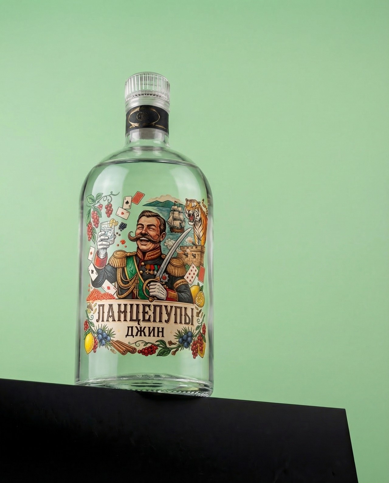 The illustration captures the Lantsepupy spirit in a single frame. A mustachioed officer in full military regalia — gold epaulettes, medals, ceremonial saber — raises a gin and tonic with a devil-may-care grin. Playing cards swirl around him like confetti, a nod to the endless gambling sessions. Behind him: a sailing ship entering the harbor, the fortress walls of Vladivostok, and a roaring Siberian tiger — both a reference to the infamous “Tiger Hunt” game and the wild nature of the Far East.