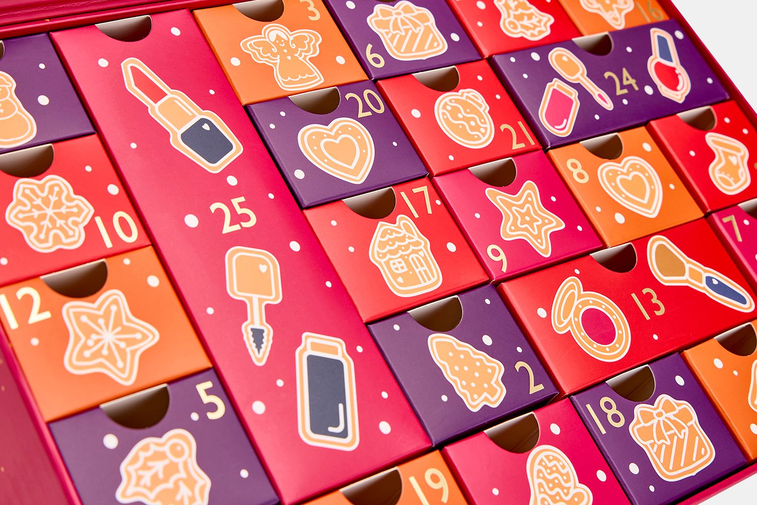 The Luxury Beauty Advent calendar is a hinged box featuring a traditional ice rink scene, finished with UV gloss varnish and delicate embossed gold foiling. The 25 Days of Beauty Advent, meanwhile, uses a chocolate box-style design with a ribbon tie. It carries a more minimalist look, using spot UV varnish, embossing, and foiled typography to create a festive pink and gold aesthetic that combines tradition with modernity. Both calendars contain 25 beauty products inside individual printed cartons with gold foiled numbers that consumers can unbox every day through the festive period.