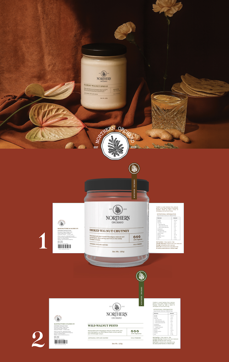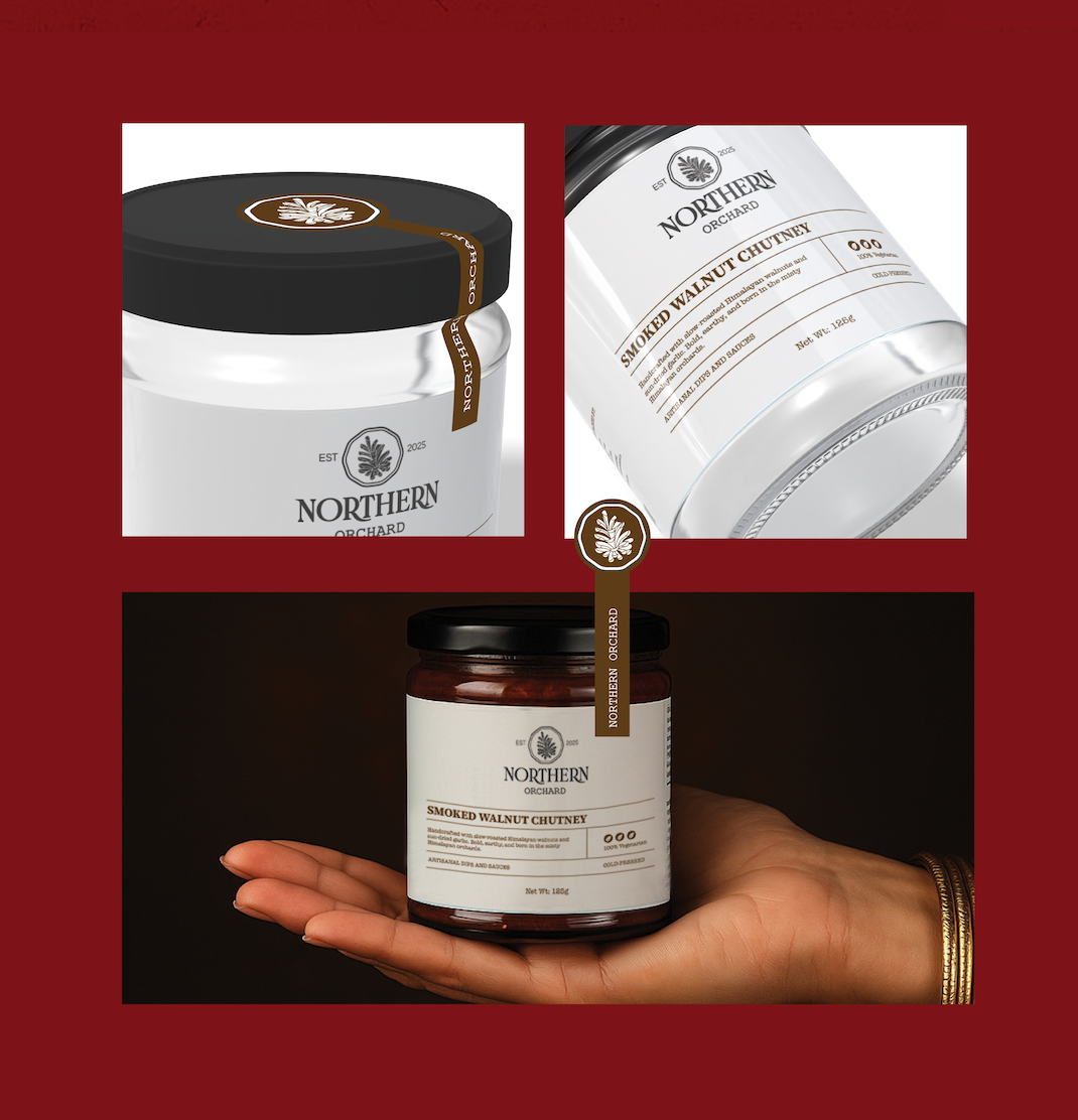 The design approach focused on minimal, type-led packaging paired with a subtle earthy visual language inspired by walnuts and the Himalayan landscape. Clear hierarchy, refined typography, and a warm, grounded palette help the jars stand out on the shelf while communicating purity, craftsmanship, and authenticity.