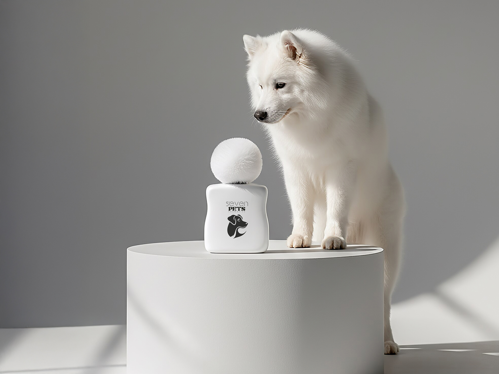 The bottle features a predominantly white tone, chosen to represent the purity and nobility that dogs radiate. Its most distinctive detail is the cap, which mimics the texture of canine fur—a tactile and visual element that adds warmth to the design and sets it apart from traditional perfume bottles.