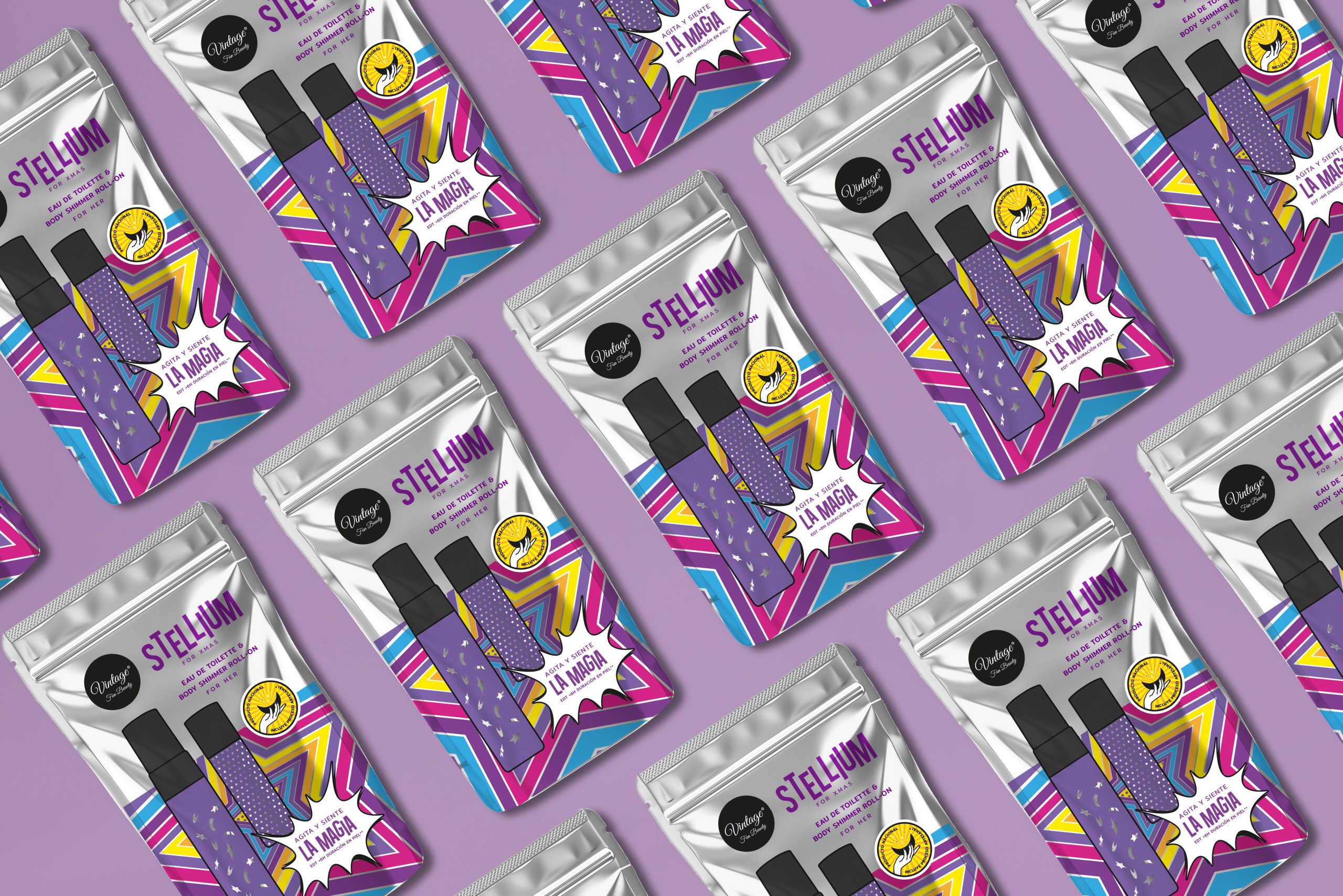 Fragrance pack for the Vintage Fun Beauty brand inspired by the Stellium astrological chart. The Stellium astrological phenomenon occurs when 3 or more planets converge in the same zodiac sign. This fragrance pack conceals an eau de toilette with the talismans of the almighty universe (the moon and stars) and a Body Shimmer Roll-on with glitter inside. These details have inspired the design of the packaging, emphasizing the importance of the product’s starry concept. The logo design is inspired by the movement of particles within the product, reflecting how the stars and moons move inside the fragrance.
