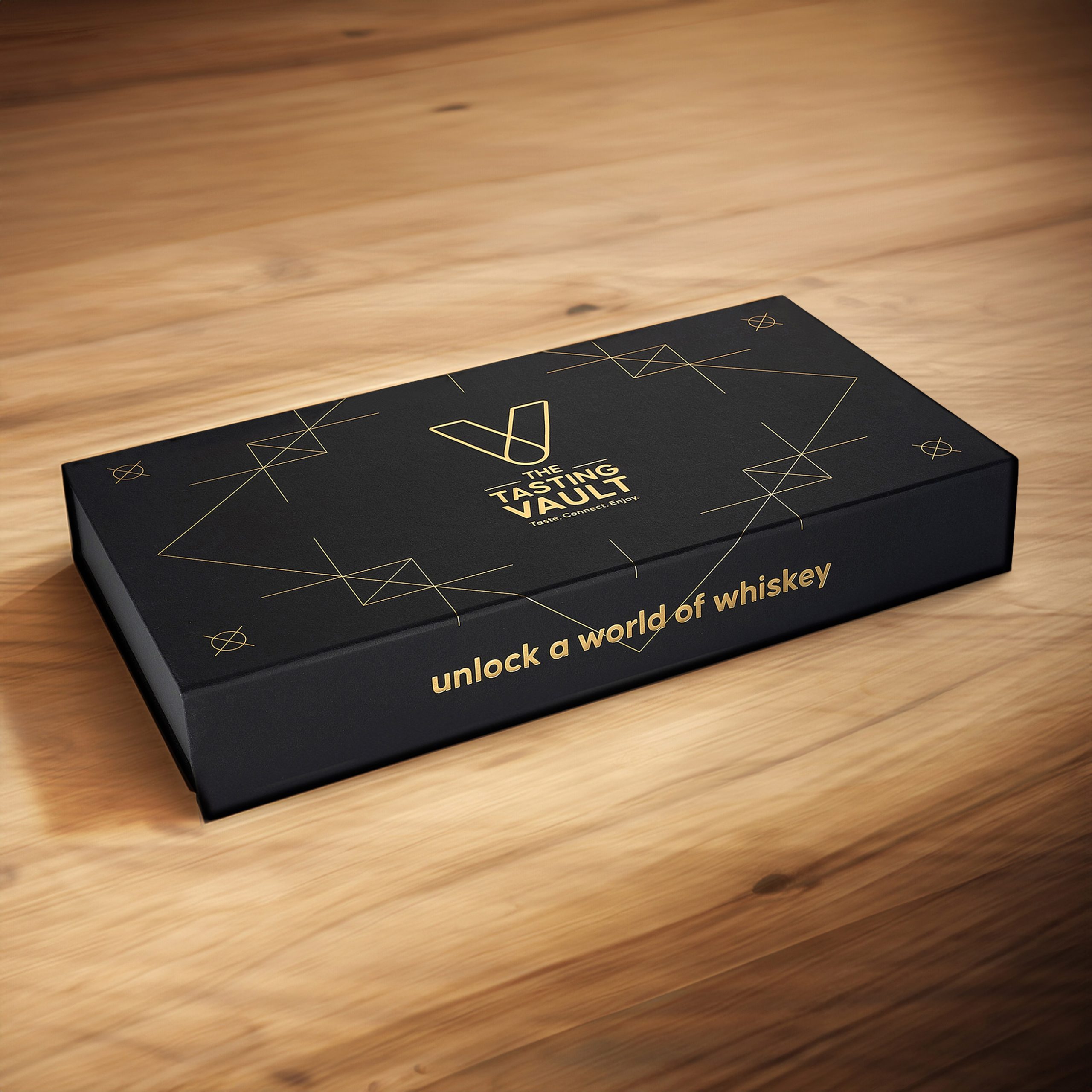 The challenge for The Tasting Vault was to create a packaging design reflecting the premium, sophisticated, and community-driven nature of their whiskey subscription service. The design needed to solve two key issues: communicating the exclusivity and luxury of the product, while offering practicality for repeated monthly deliveries of different whiskey varieties. The packaging needed to be functional yet visually compelling, enhancing the unboxing experience for consumers to share on social media. Furthermore, the design needed to accommodate 3 x 50ml whiskey bottles with flexibility for monthly variations, while remaining compact and easy to ship.