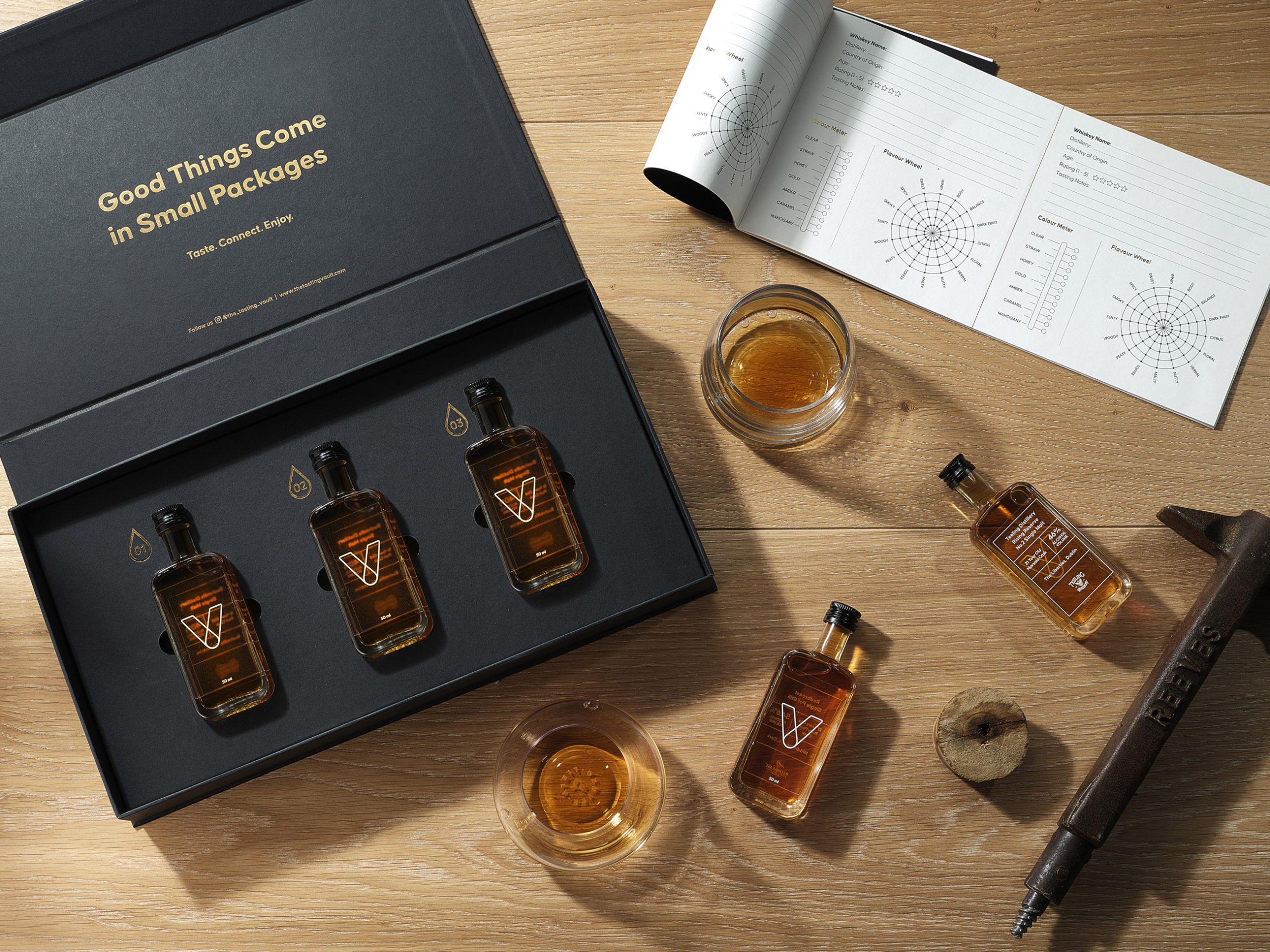 The packaging also includes a bespoke insert card with detailed information about that month’s whiskey selections, adding a personal touch. A 20-page tasting notes booklet further enriches the consumer experience, allowing customers to log their impressions and learn more about whiskey tasting. Clever phrases are used in the booklet such as “unlock a world of whiskey” to tie into the vault theme, reinforcing the brand’s identity.